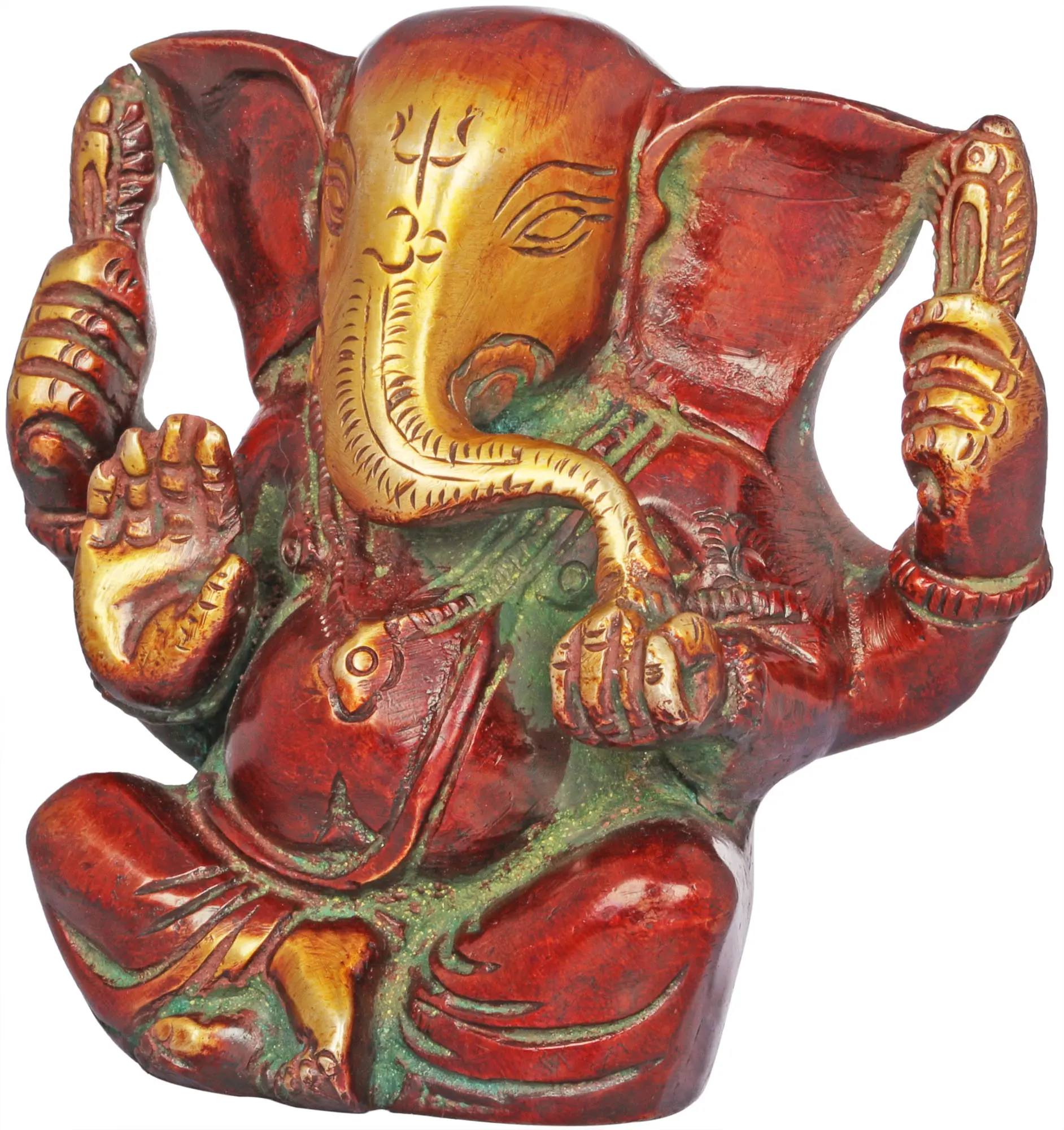 Ganesha, the revered deity of wisdom and prosperity, sits majestically in a posture of divine blessing. With his benevolent gaze, he showers his blessings upon all who seek his guidance. Lord Ganesha’s large ears represent his ability to listen attentively to the prayers and pleas of his devotees. In his divine hands, he holds two nooses, symbolizing his power to bind and liberate souls from the entanglements of worldly desires. Amidst this divine aura, Ganesha relishes a delicious Modaka, a sweet dumpling that symbolizes the fulfillment of desires. His childlike joy radiates as he savors the delectable treat, reminding you that even the divine relishes the simple pleasures of life.