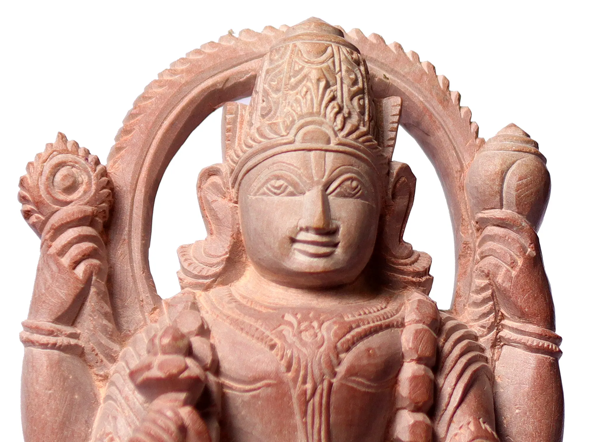 Invite the divine presence of this Pink Stone Narayana into your sacred space, and let his serene grace inspire you to find inner harmony, seek divine protection, and tread the righteous path. May this stunning sculpture be a constant source of inspiration, guiding you toward cosmic unity, inner enlightenment, and a life enriched with divine blessings, in the preservation of Dharma and all its four pillars.
