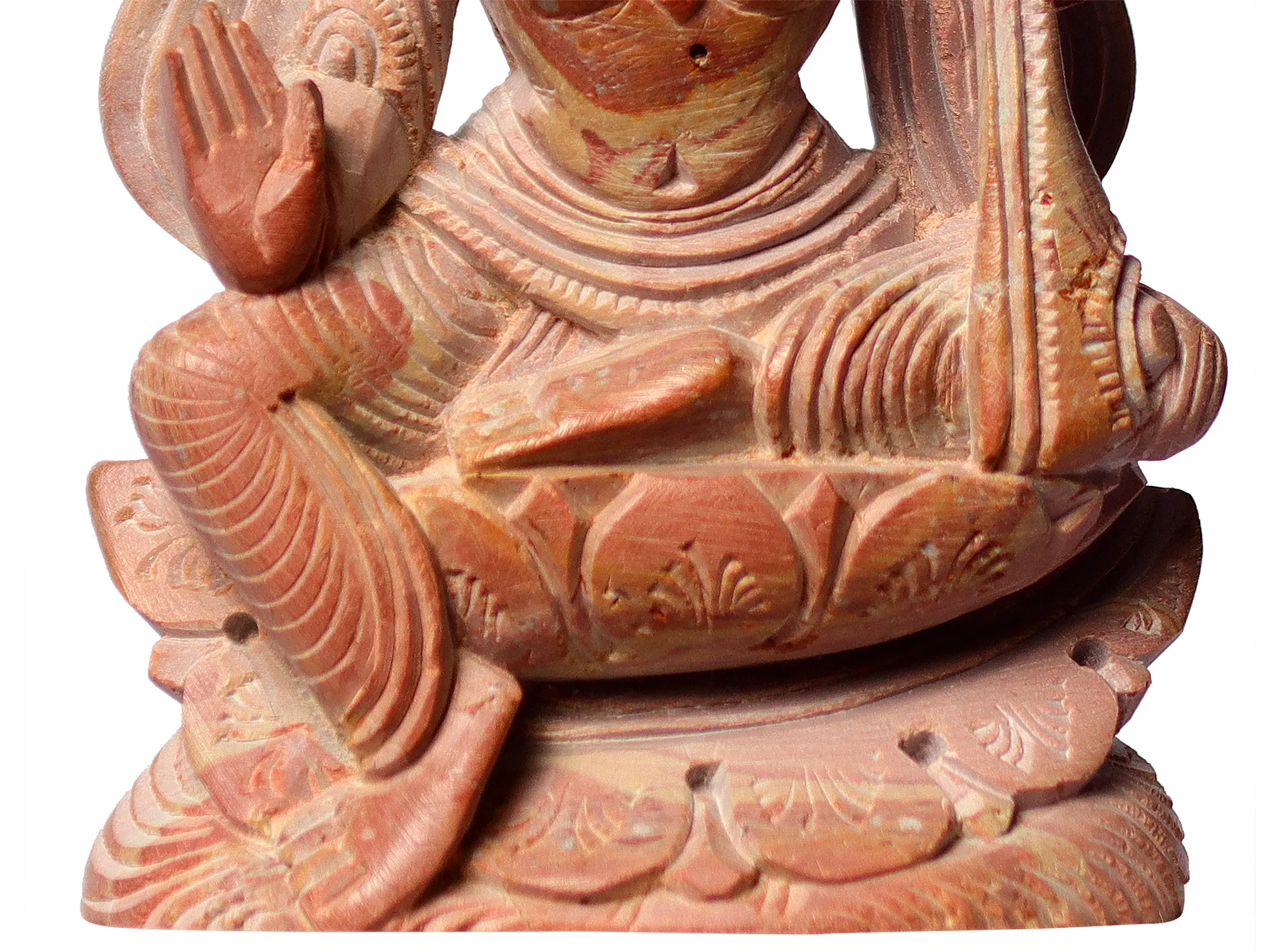 Seated in Lalitasana, this Goddess Saraswati Sculpture exudes an aura of spiritual inspiration and reverence. As you behold her captivating form, you are encouraged to delve into introspection, meditation, and introspective study - creating a sacred sanctuary where you can attune your mind and soul to the subtle vibrations of divine knowledge and artistic expression.