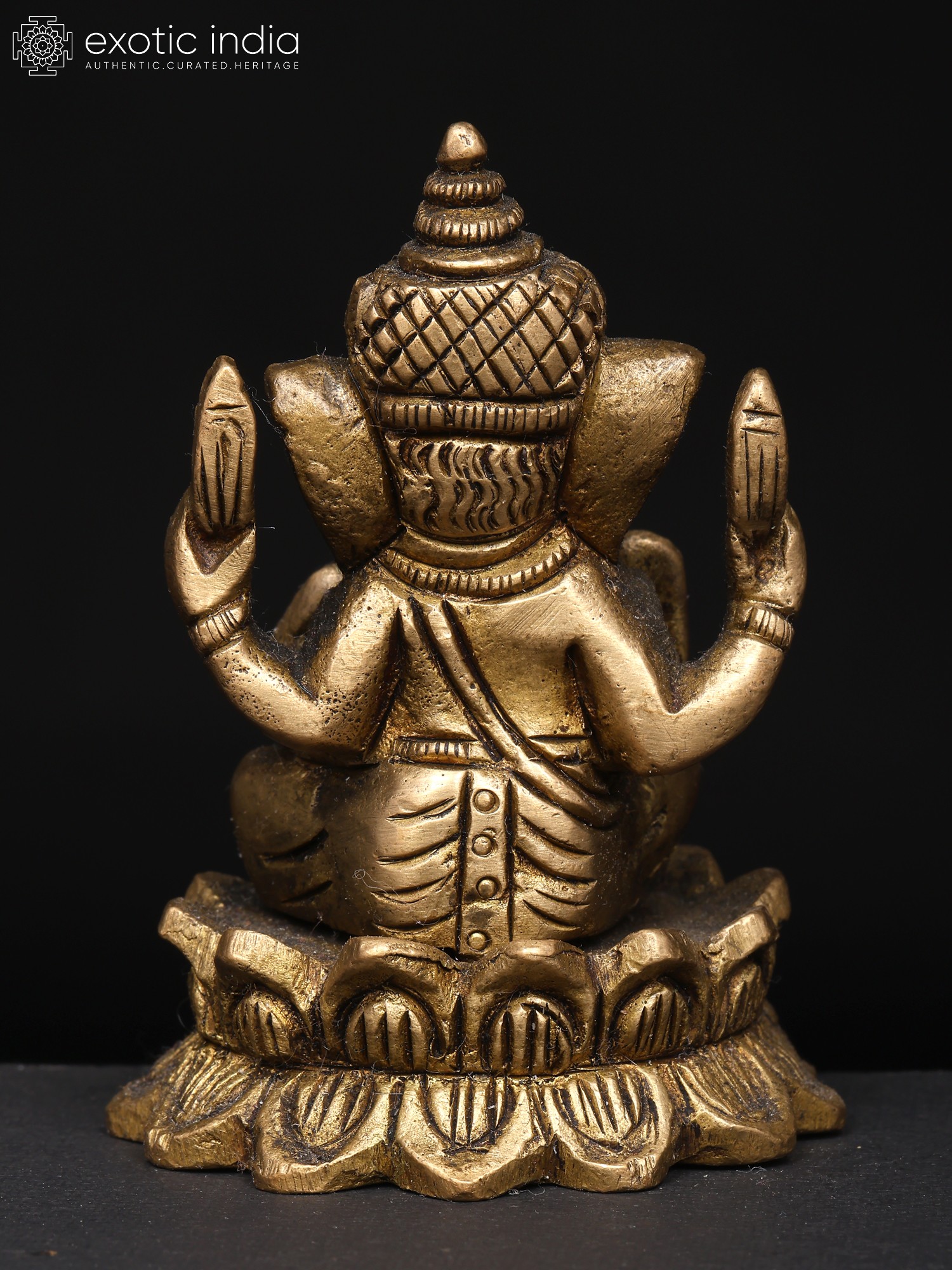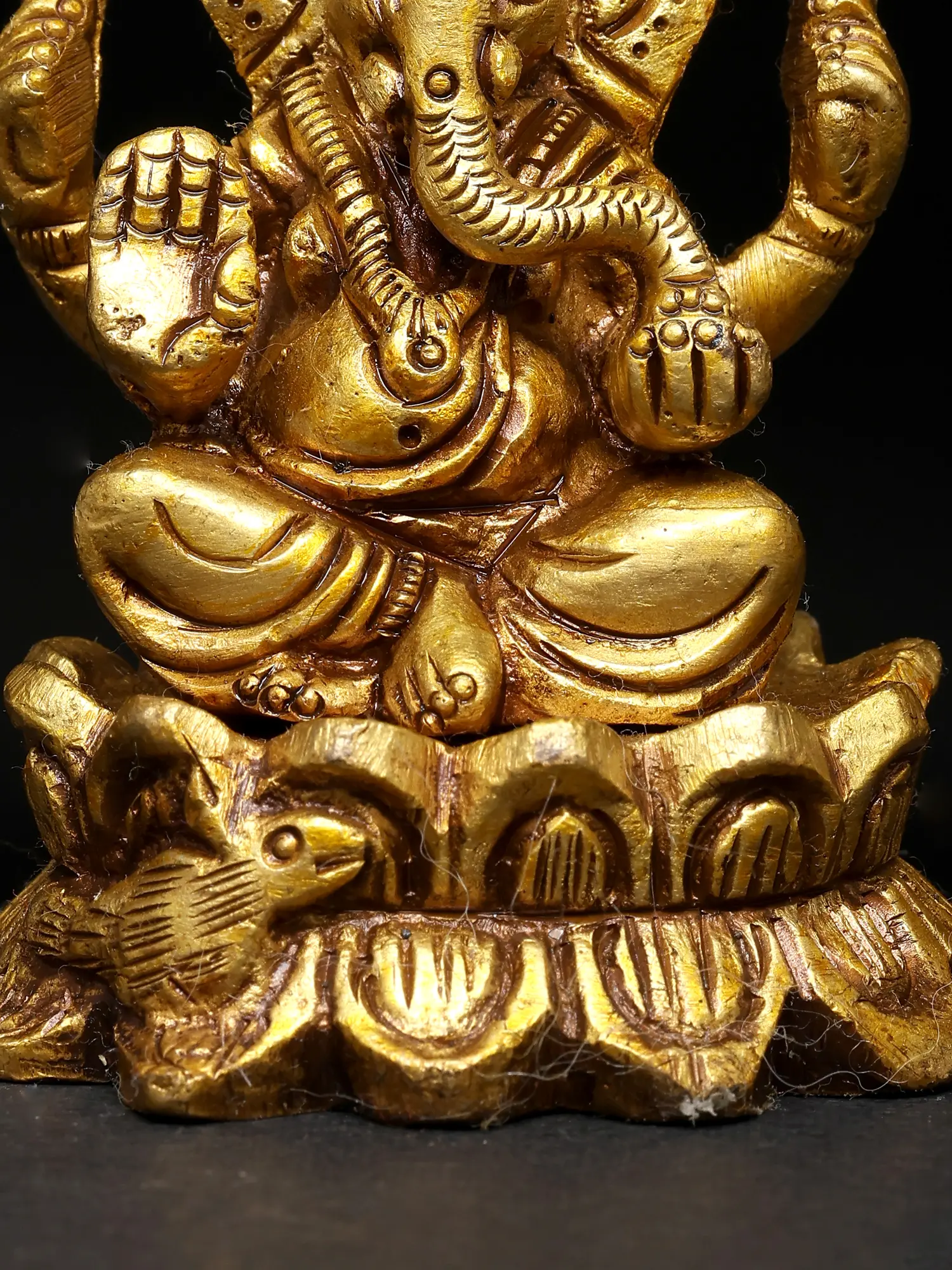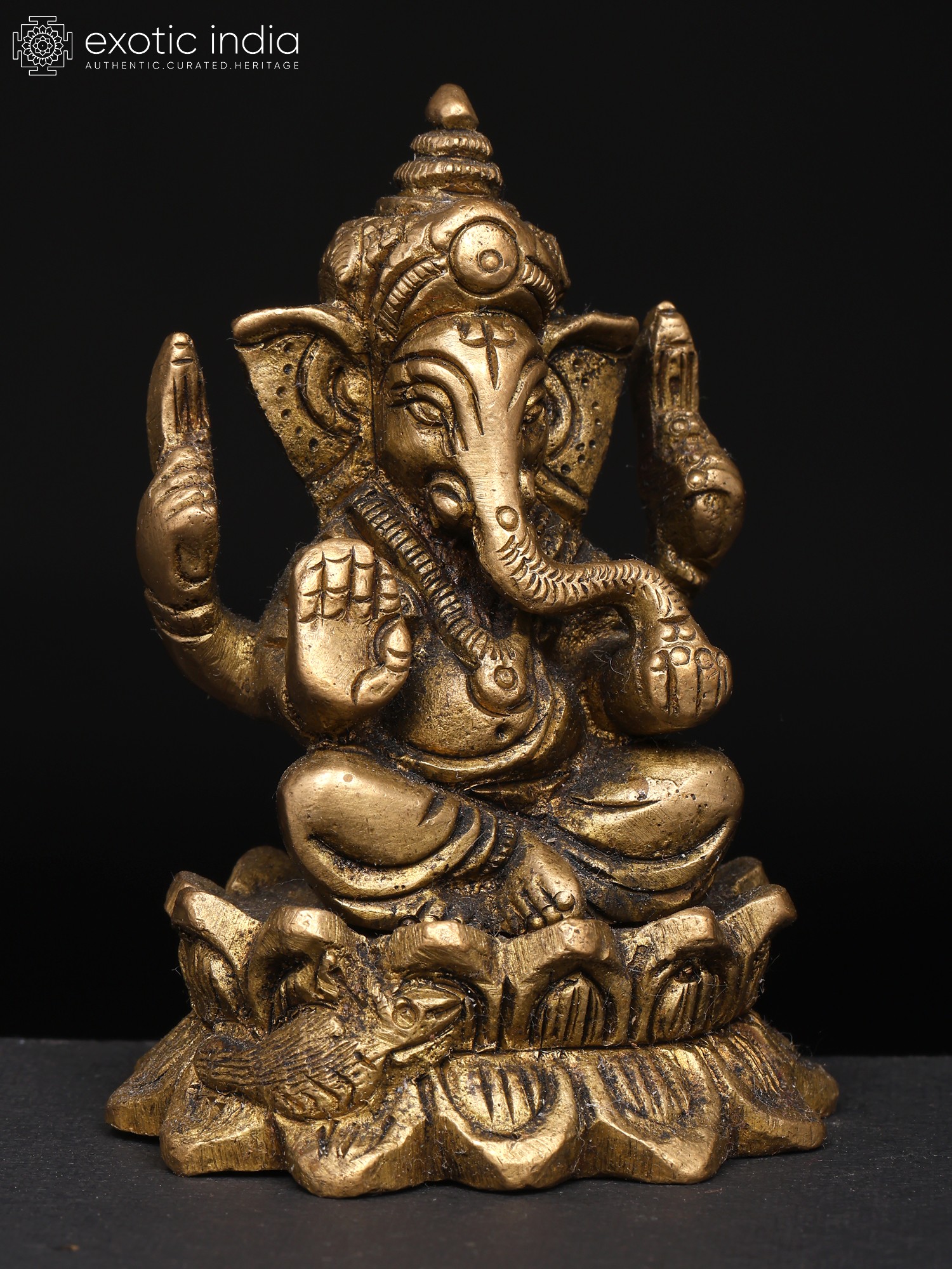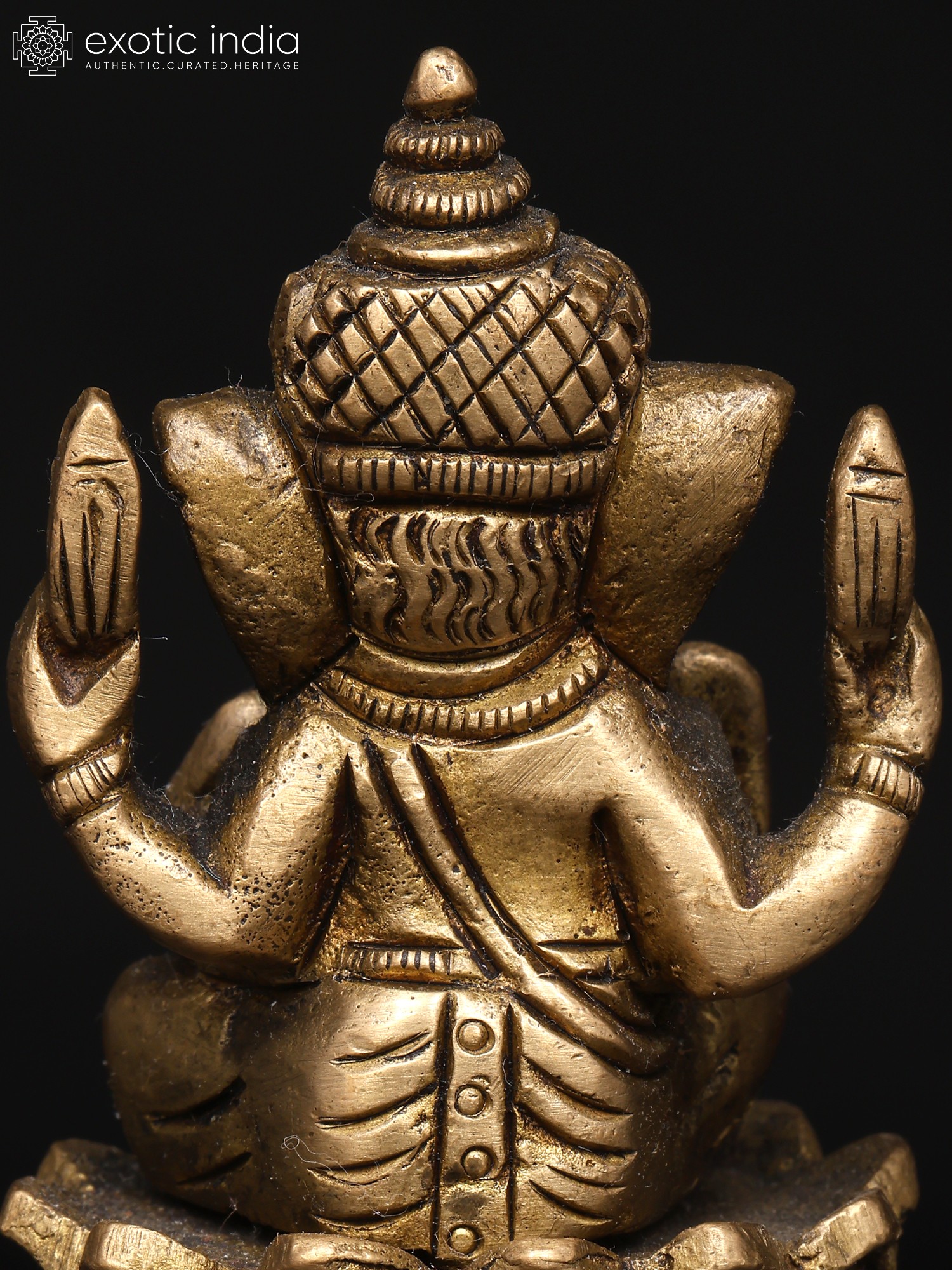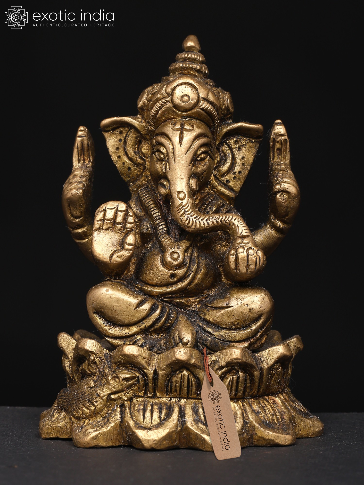 The extravagant brass Kamalasana Ganesha sculpture portrays Lord Ganesha seated on a lotus, known as the symbol of purity and enlightenment. The broken tusk of this celebrated deity signifies sacrifice, while his modak reflects the sweetness of spiritual wisdom. Ganesha's four hands hold a noose, goad, modak, and his own broken tusk stands as a symbol of his power to guide, protect, and bestow blessings. Seated on a lotus, he signifies the blooming of divine potential within us. This artwork inspires on to embrace auspicious beginnings, mirroring Ganesha's role as the remover of obstacles on life's path.
