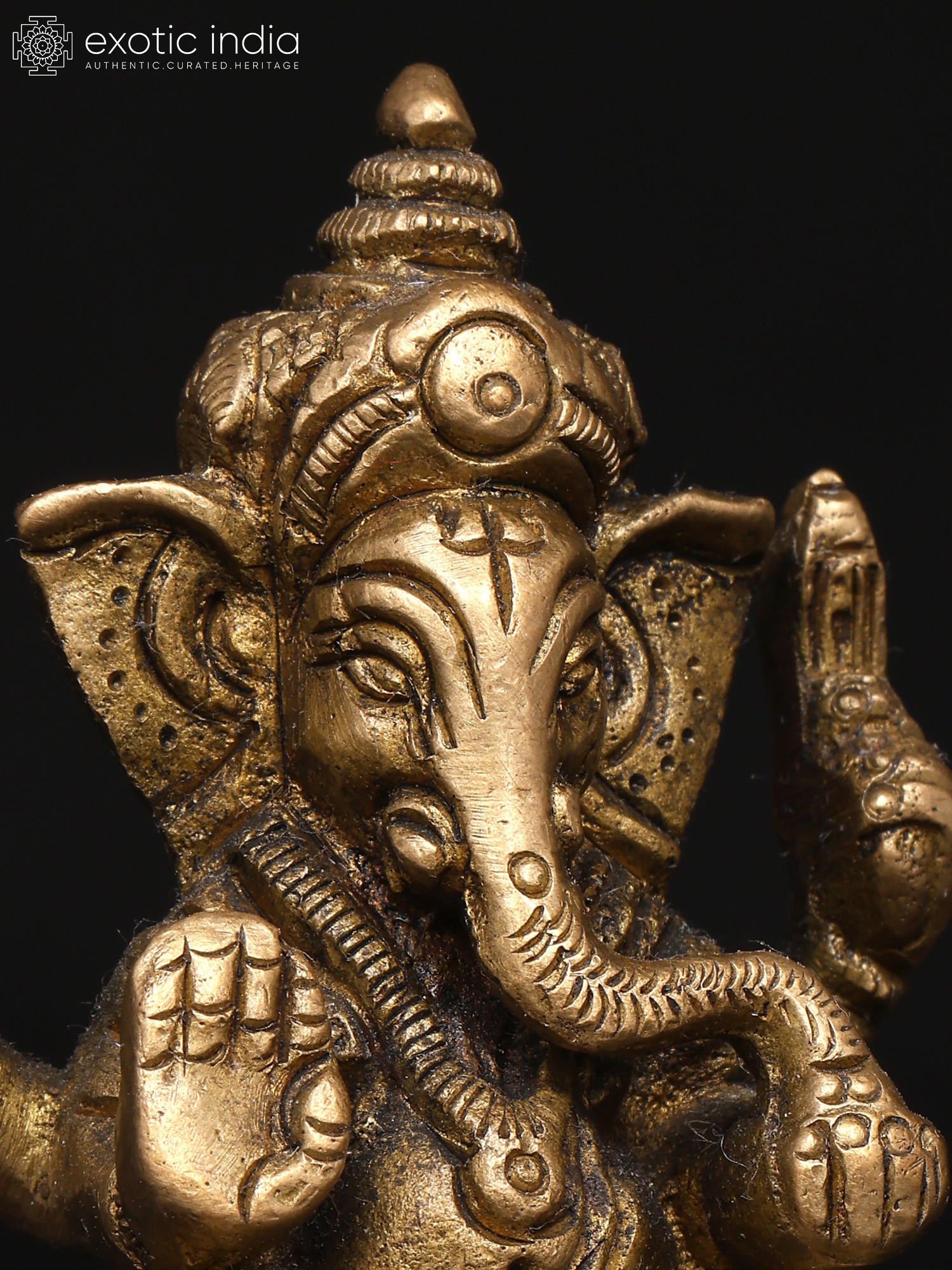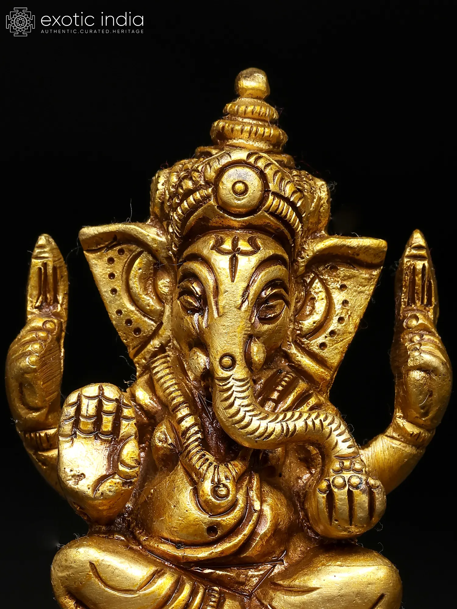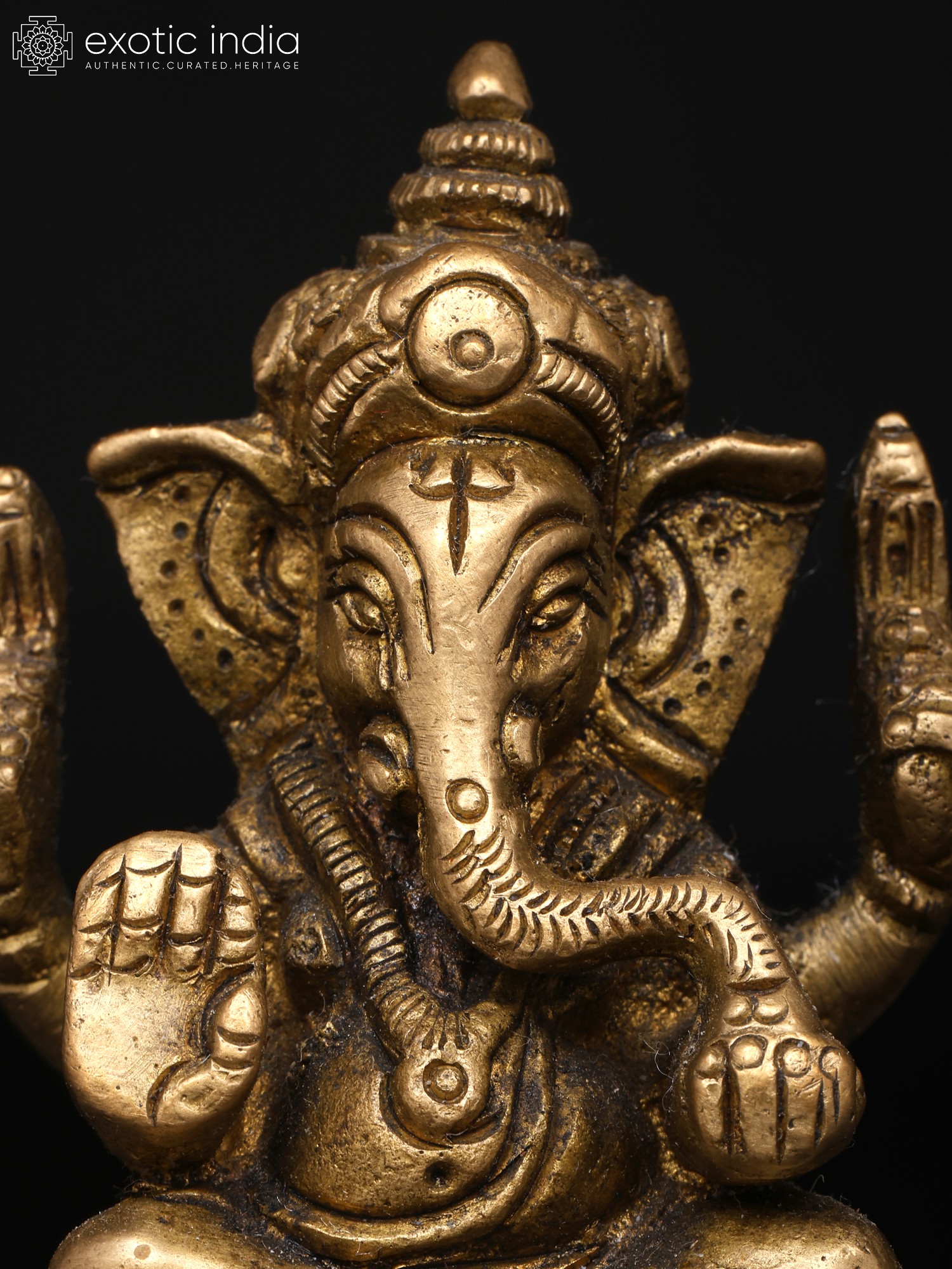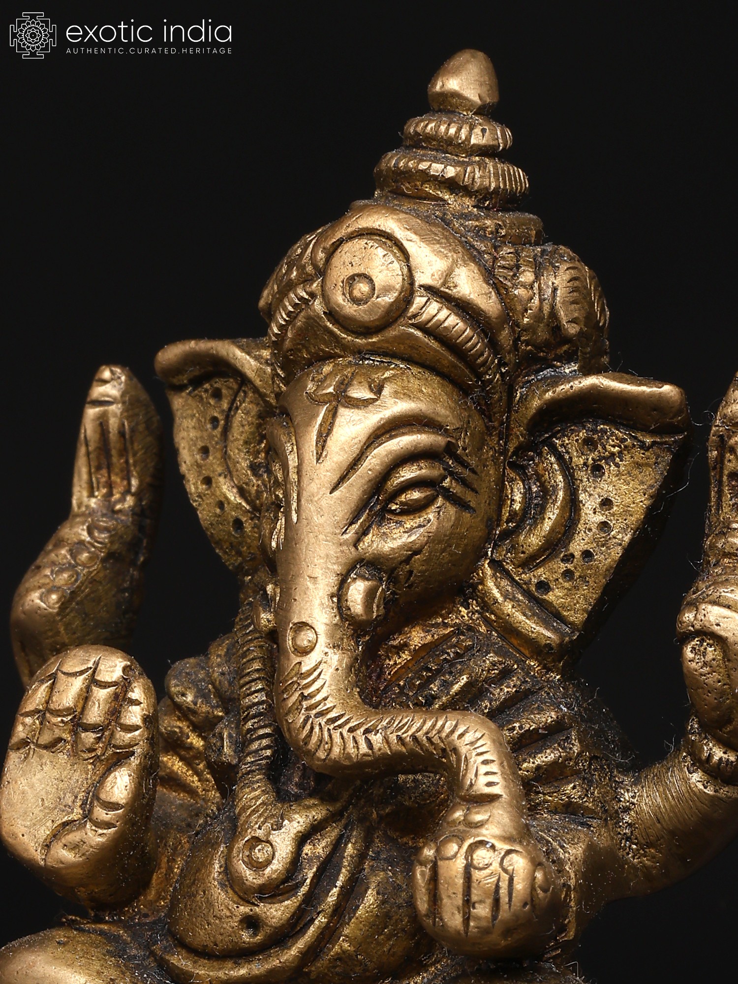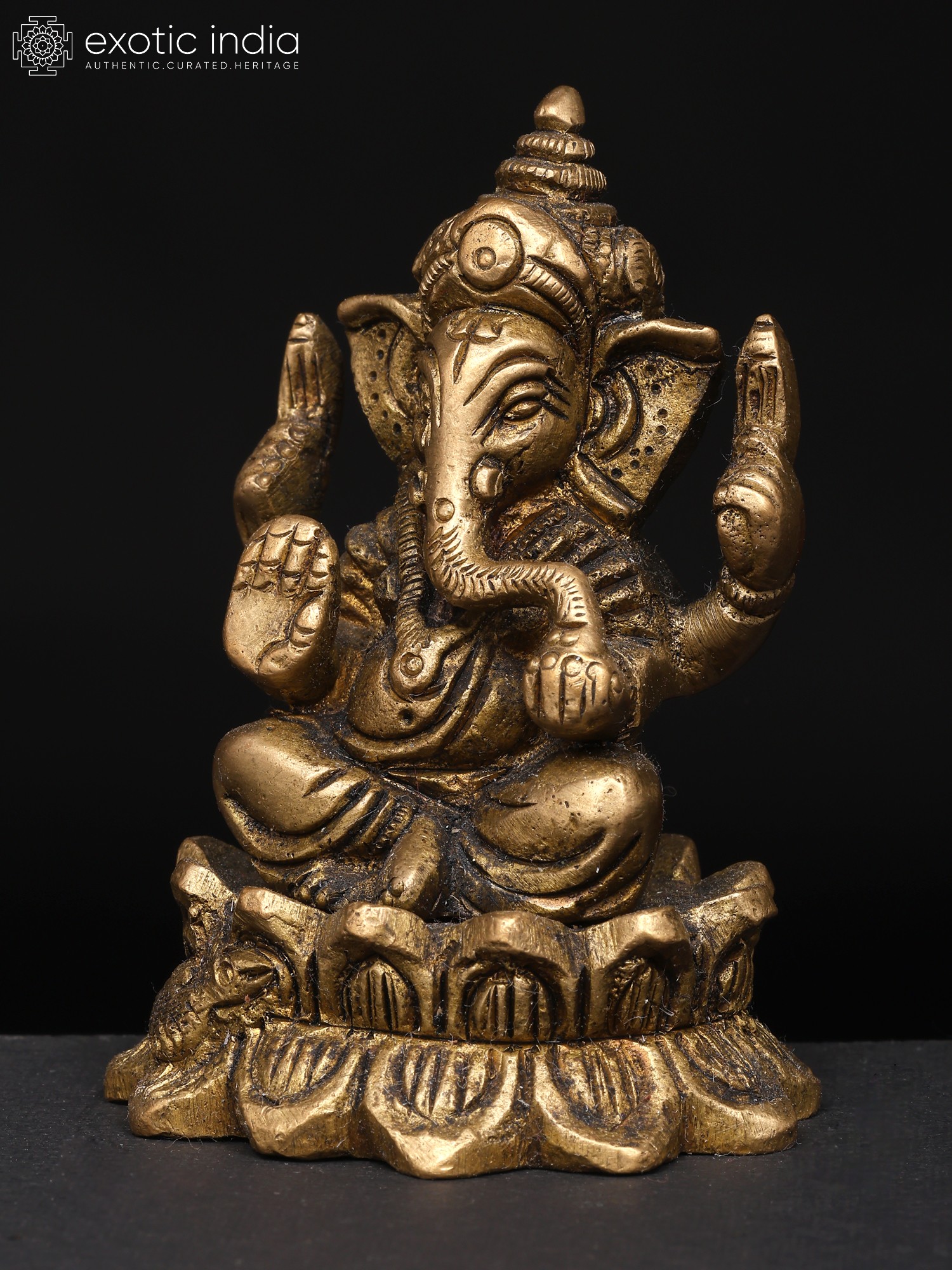 The extravagant brass Kamalasana Ganesha sculpture portrays Lord Ganesha seated on a lotus, known as the symbol of purity and enlightenment. The broken tusk of this celebrated deity signifies sacrifice, while his modak reflects the sweetness of spiritual wisdom. Ganesha's four hands hold a noose, goad, modak, and his own broken tusk stands as a symbol of his power to guide, protect, and bestow blessings. Seated on a lotus, he signifies the blooming of divine potential within us. This artwork inspires on to embrace auspicious beginnings, mirroring Ganesha's role as the remover of obstacles on life's path.