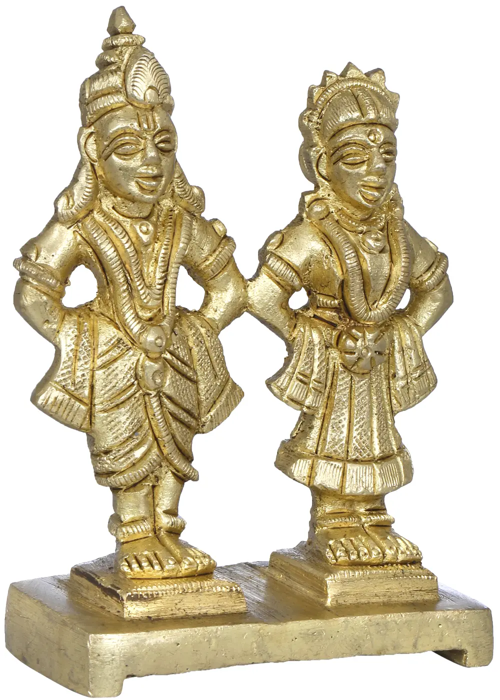The Lord of Pandharpur- Vitthal along with his Shakti Devi Rukmini or Rakhmai is presented in these handmade brass statues in the iconography of the temple murtis. Adorned in traditional attire and ornaments, Vitthal and Rukmini share a pedestal while standing on individual Pithas, in distinctive postures, reminiscent of the legend of Vishnu-bhakta Pundalik, whose pure devotion made the Lord of Vaikuntha wait at his door and remain at Pandharpur for the betterment of his devotees.