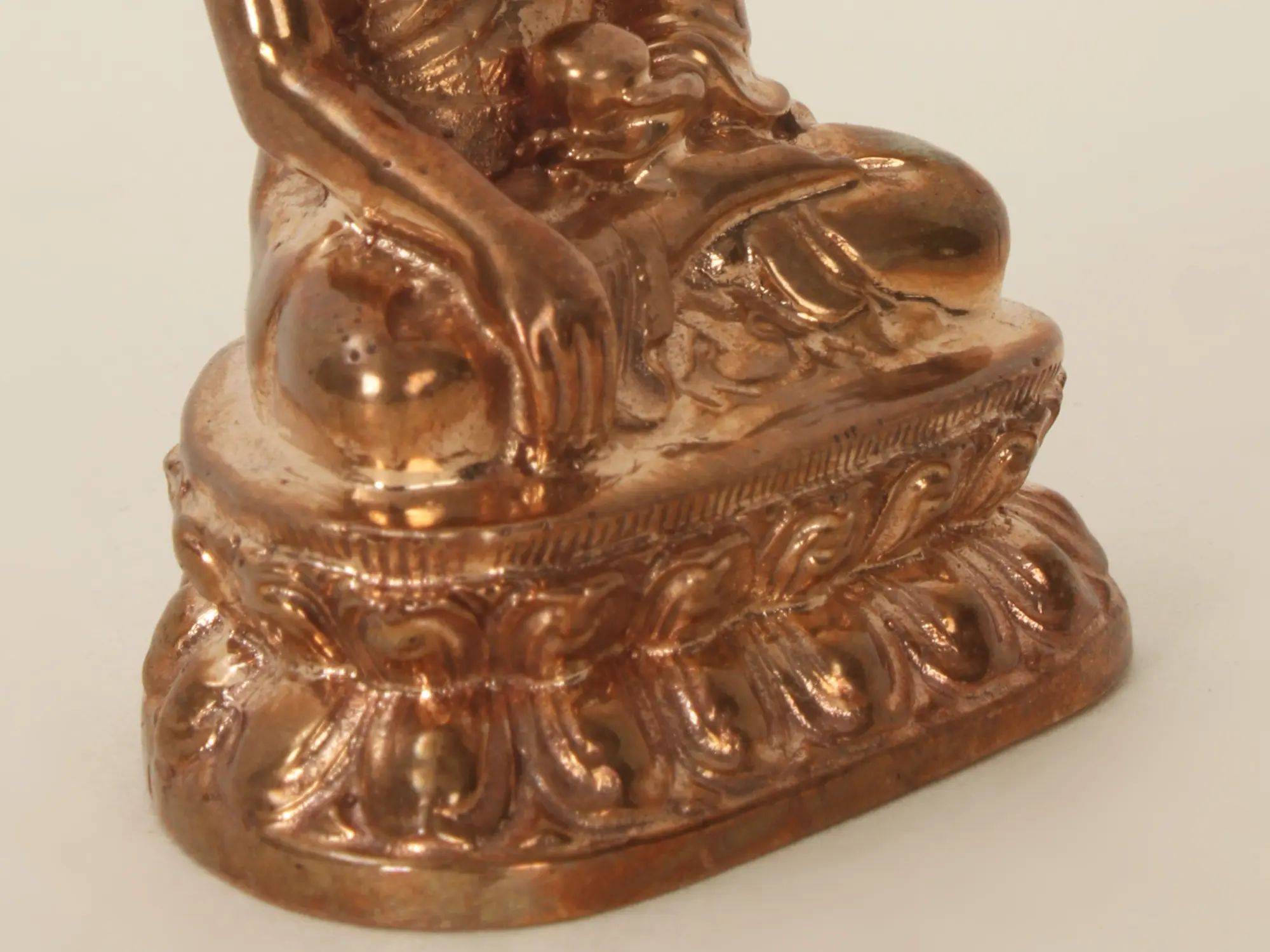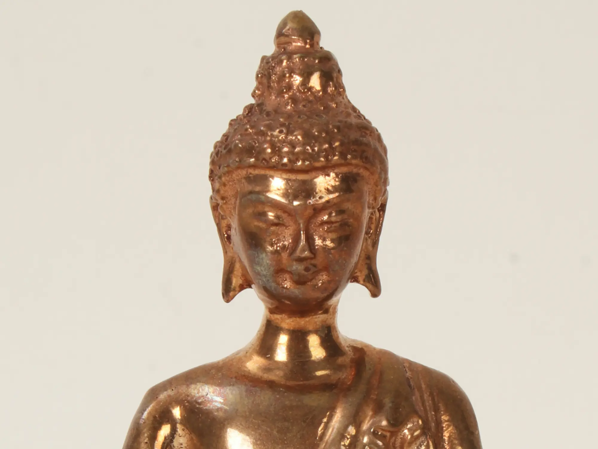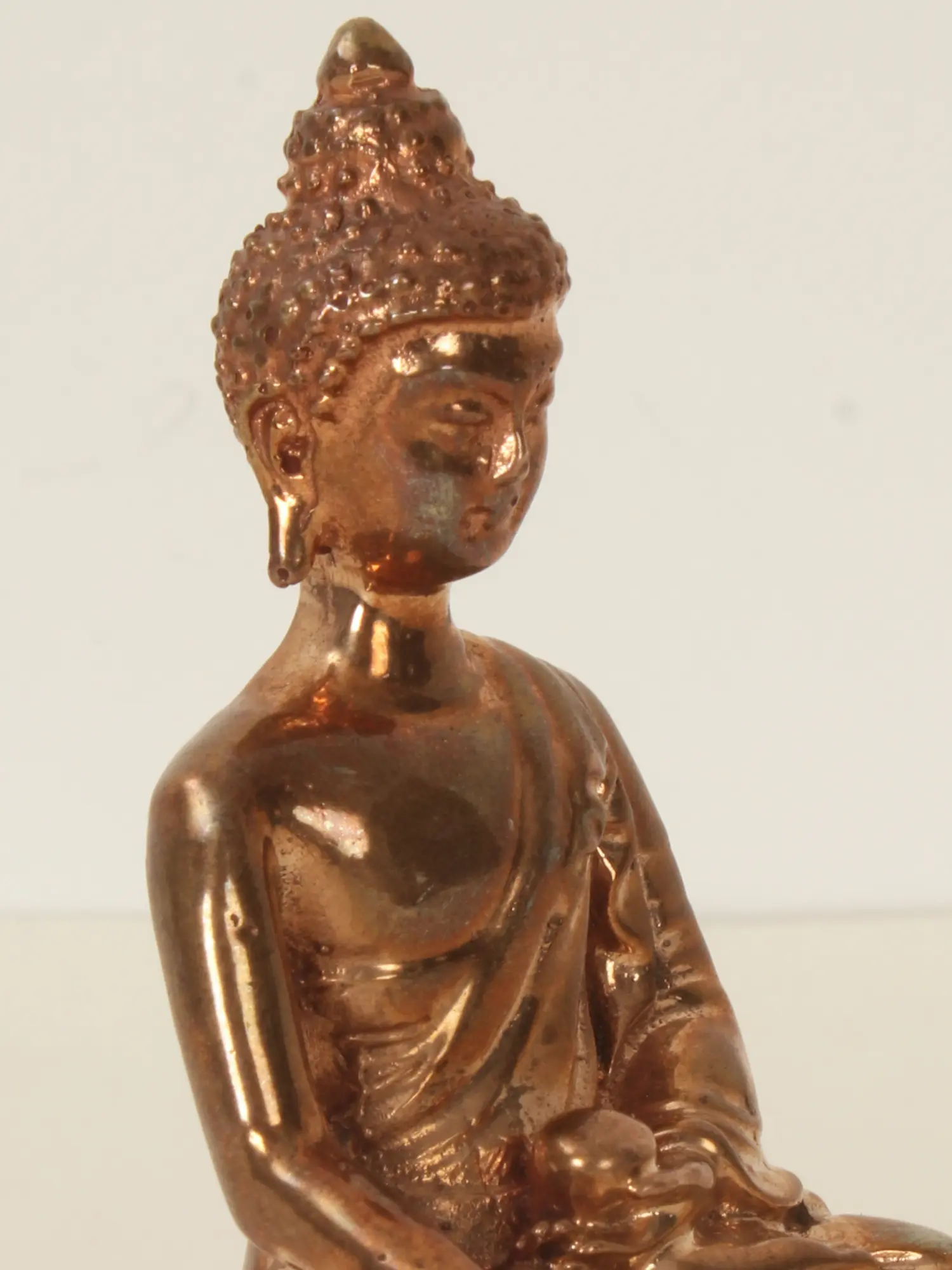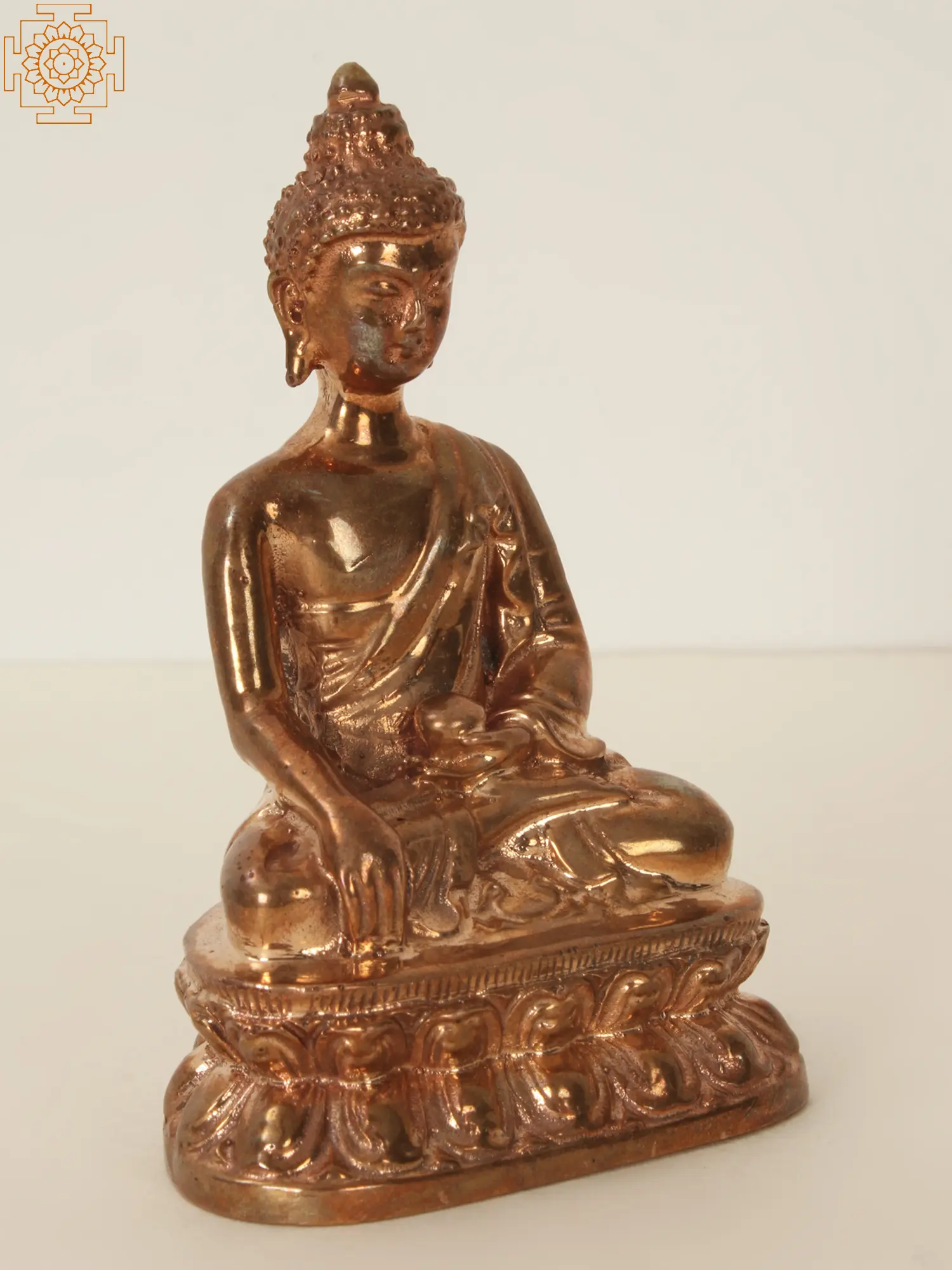 Lord Buddha (The Awakened One) assumes a captivating presence in Bhumi-Sparsha Mudra. Seated gracefully on a lotus pedestal in Padmasana, his touch with the Earth symbolises the momentous instant of enlightenment. The alms bowl in his left hand embodies simplicity and detachment from worldly desires. Adorned with snail-shell curls (Ushnisha) and elongated earlobes, Lord Buddha exudes serenity. Draped in Kasaya robes, the embodiment of humility, Buddha’s form signifies the renunciation of material attachments, the pursuit of inner peace, and the transcendence of suffering. This is a mesmerising portrayal, crafted in bronze, signifies Buddha’s transformative journey, from asceticism to enlightenment, evoking a poignant narrative of spiritual awakening, humility, and the profound connection between earth and divinity.