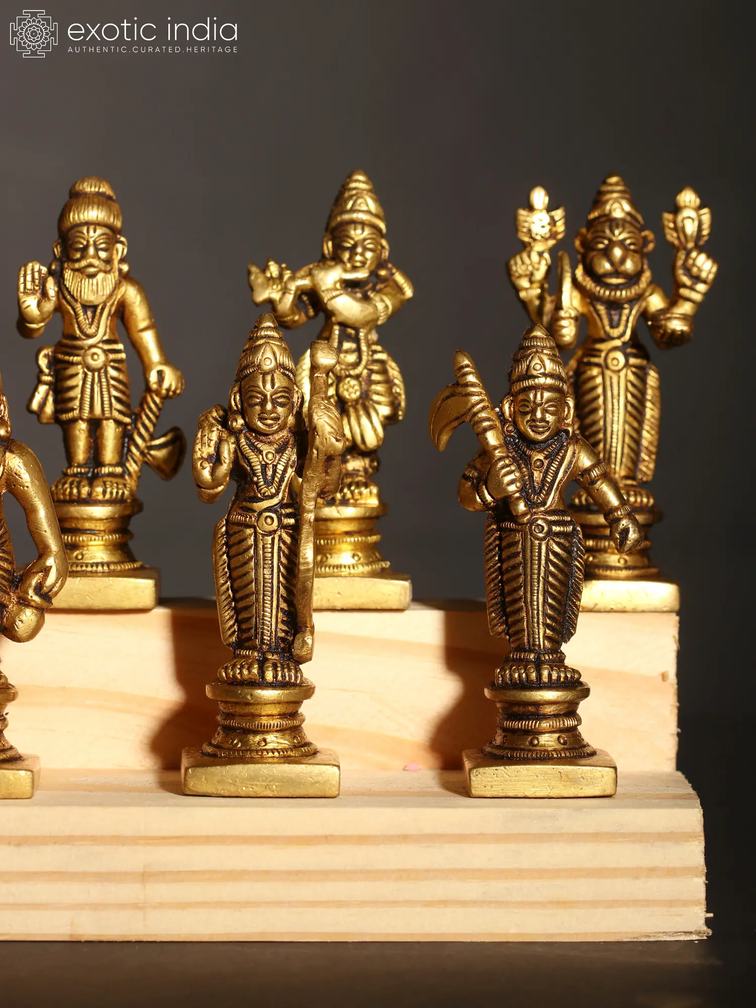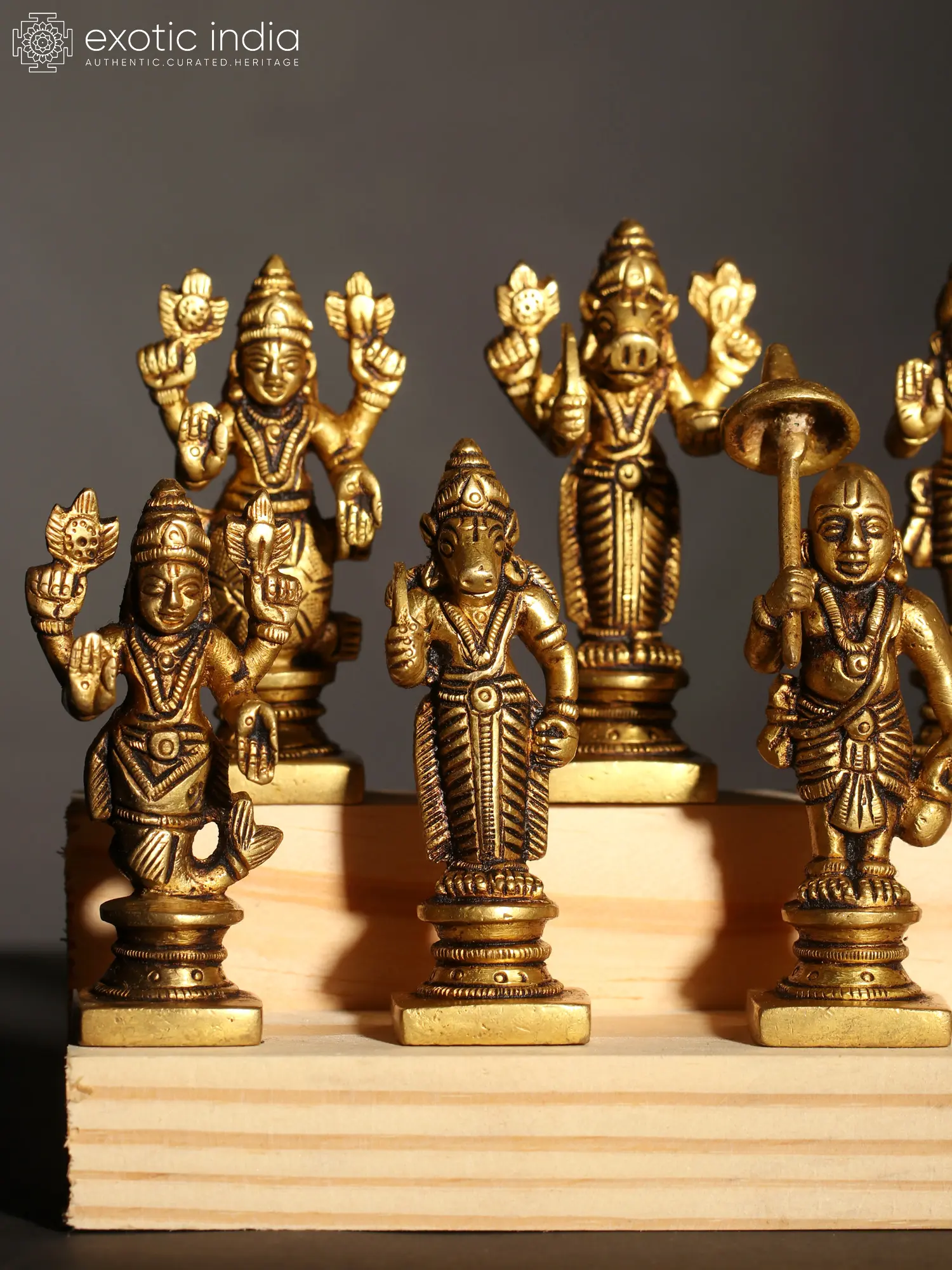 This Small Dashavatara of Lord Vishnu, a set of ten Brass Statues, holds immense significance for a home, symbolizing divine protection and cosmic order. Each avatar represents a divine incarnation, showcasing Lord Vishnu's cosmic journey to restore balance and righteousness. From left to right, the lower row unfolds the chronology of Matsya, Kurma, Varaha, Parasurama, and Krishna Avatars, while the upper row reveals Vamana, Rama, Balarama, Narasimha, and Kalki Avatars.