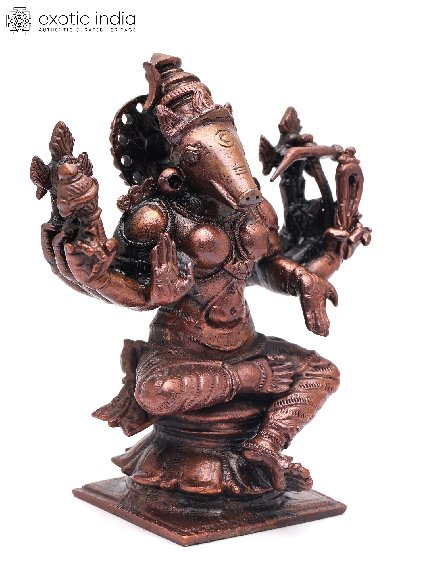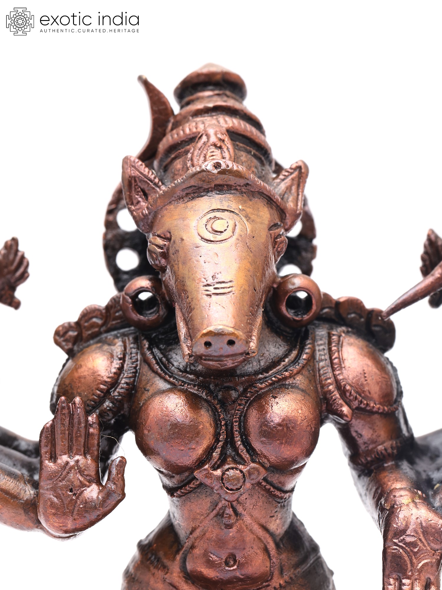 Goddess Varahi, a fierce and compassionate form of the Divine Mother, is revered as one of the most potent Matrikas. Her iconography, particularly her boar-like visage, symbolizes strength, protection, and unwavering resolve. This exquisite copper representation captures the essence of Varahi's formidable yet benevolent nature. Crafted with meticulous attention to detail, this small statue embodies the spiritual energies associated with this powerful goddess.