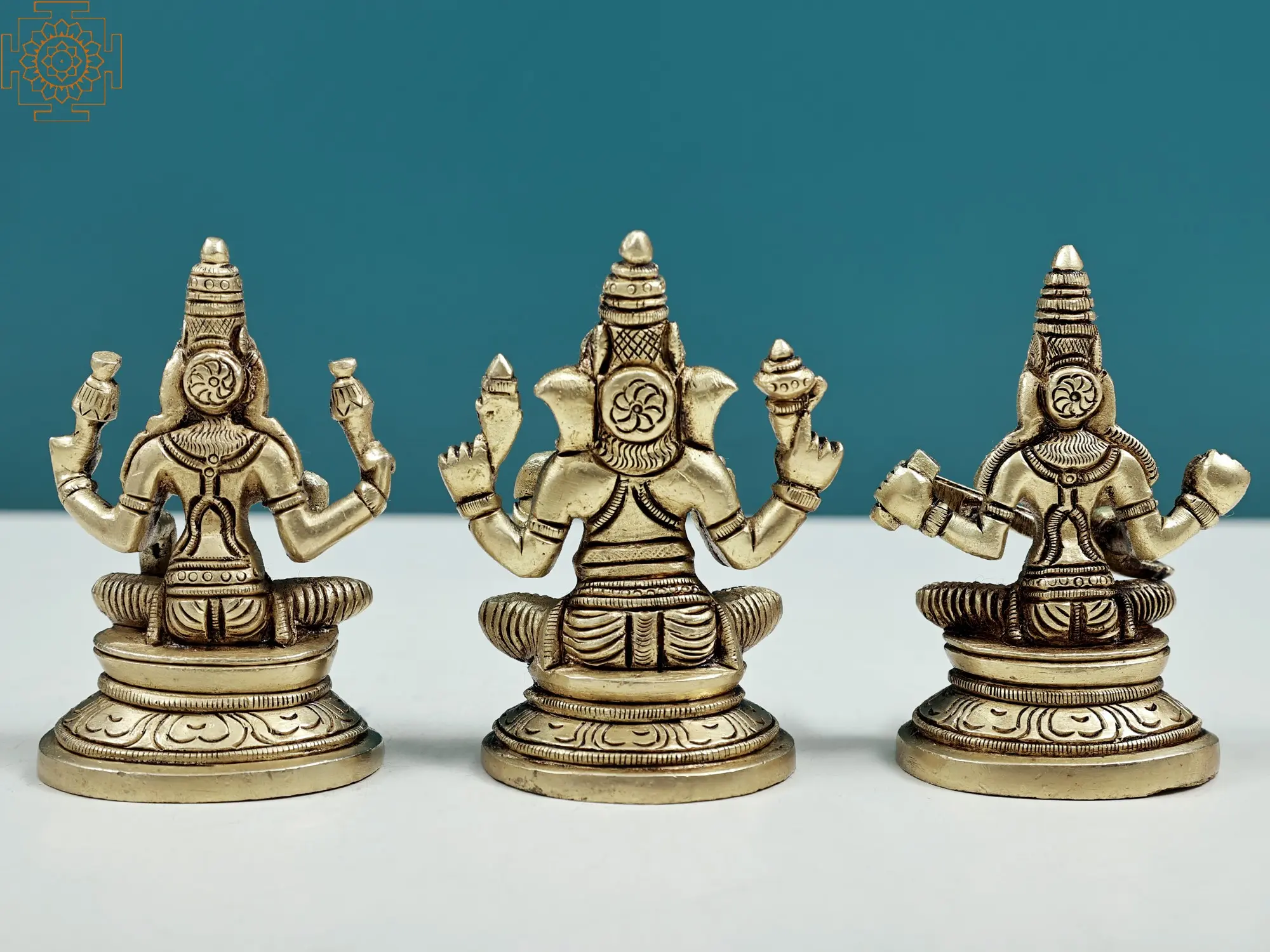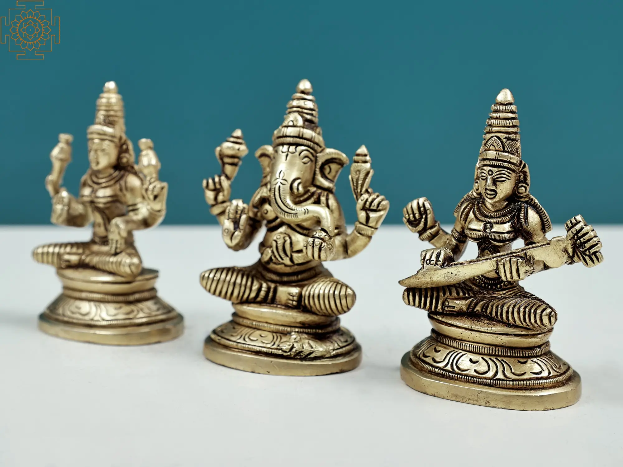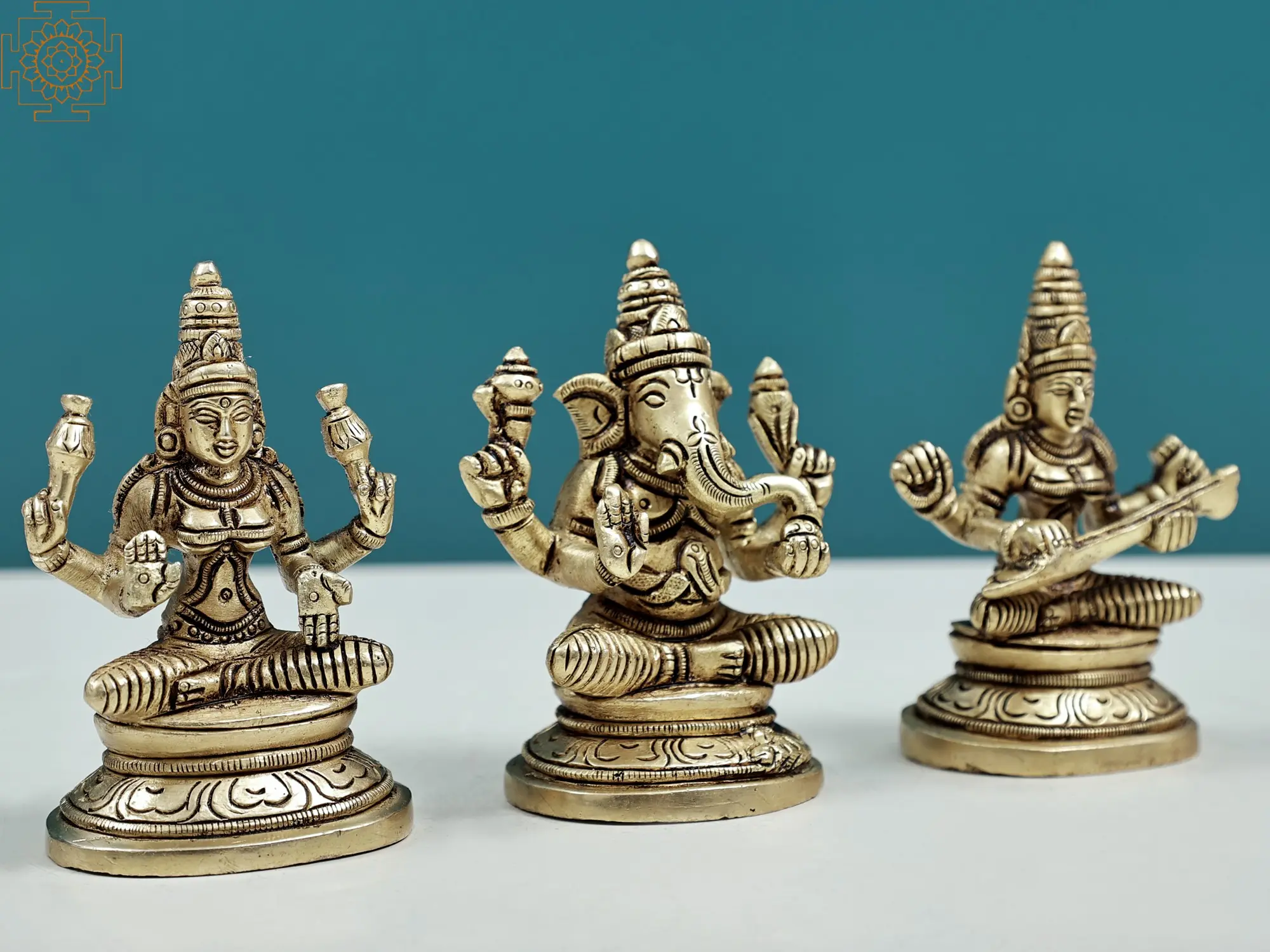 "In the trinity's unity, find blessings, wealth, and wisdom." - Ganesha, Lakshmi, and Saraswati embody divine attributes for a harmonious life. Handmade with care, the set of three fine-quality brass statues captures the divine trinity of Ganesha, Lakshmi, and Saraswati. Ganesha's presence signifies obstacle removal and new beginnings. Lakshmi embodies wealth and abundance, while Saraswati embodies wisdom and knowledge. Ganesha's modak reflects life's sweetness, Lakshmi's lotus signifies purity, and Saraswati's veena reflects artistic expression. This artwork serves as a holistic reminder of the Trinity's blessings, inspiring seekers to seek harmony in every aspect of life.