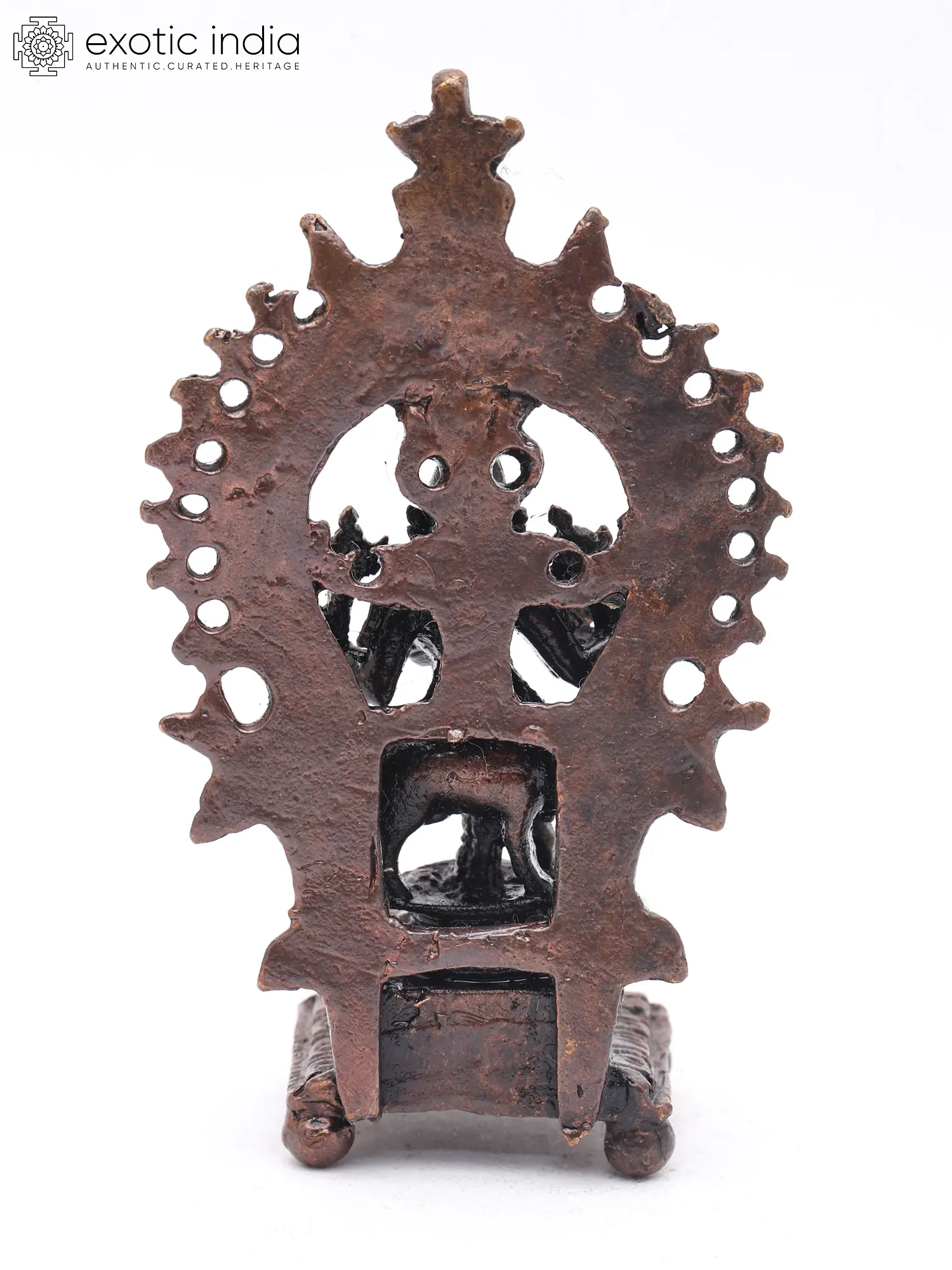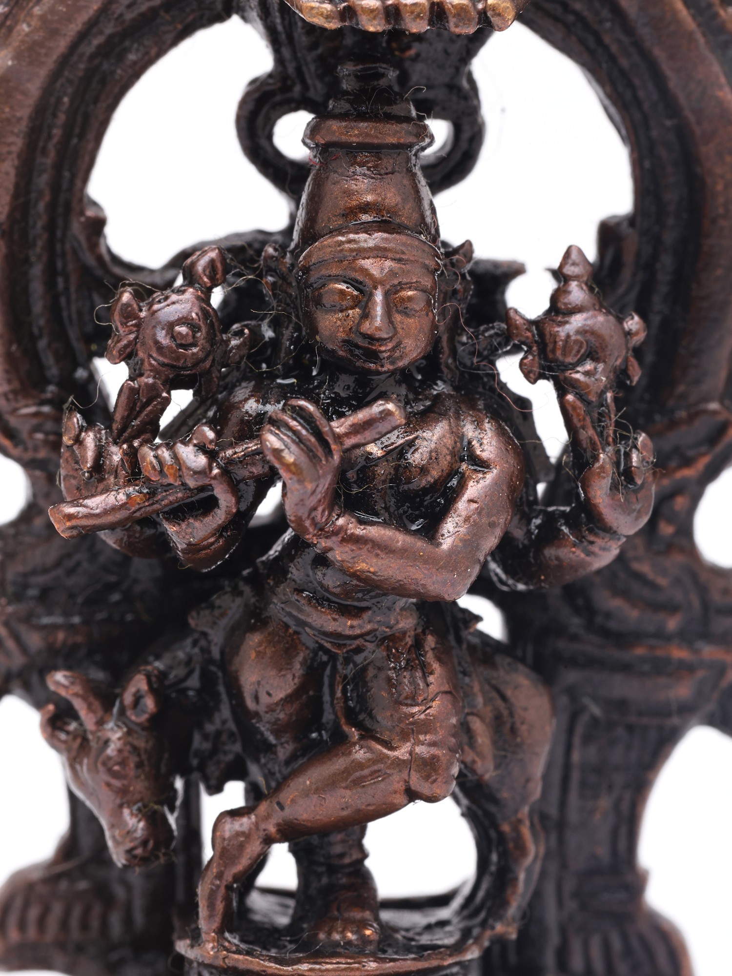 Standing at a compact three inches, this representation is a marvel of intricate design. The central figure, adorned with a regal headdress, holds a flute to his lips, while a gentle cow stands beside him, evoking a pastoral idyll. The detailed abhaya mudra in one hand, along with the delicate embellishments of the aura-like surround, showcases the meticulous craftsmanship evident in every curve and contour.