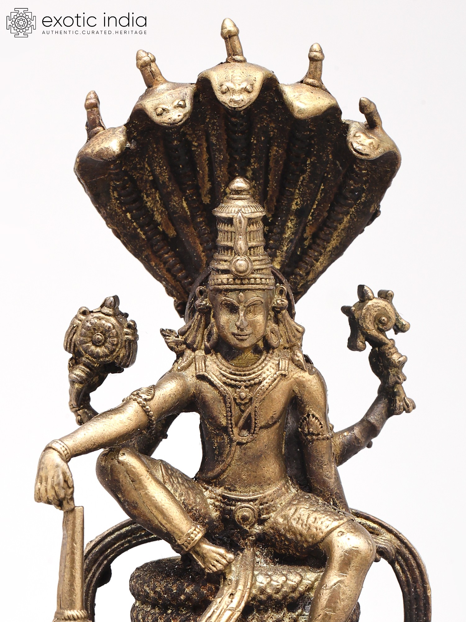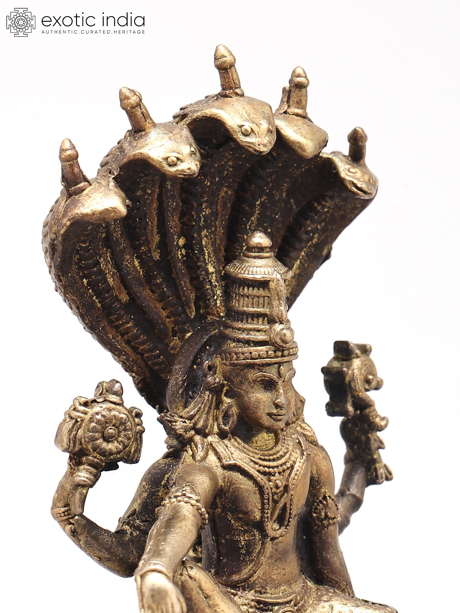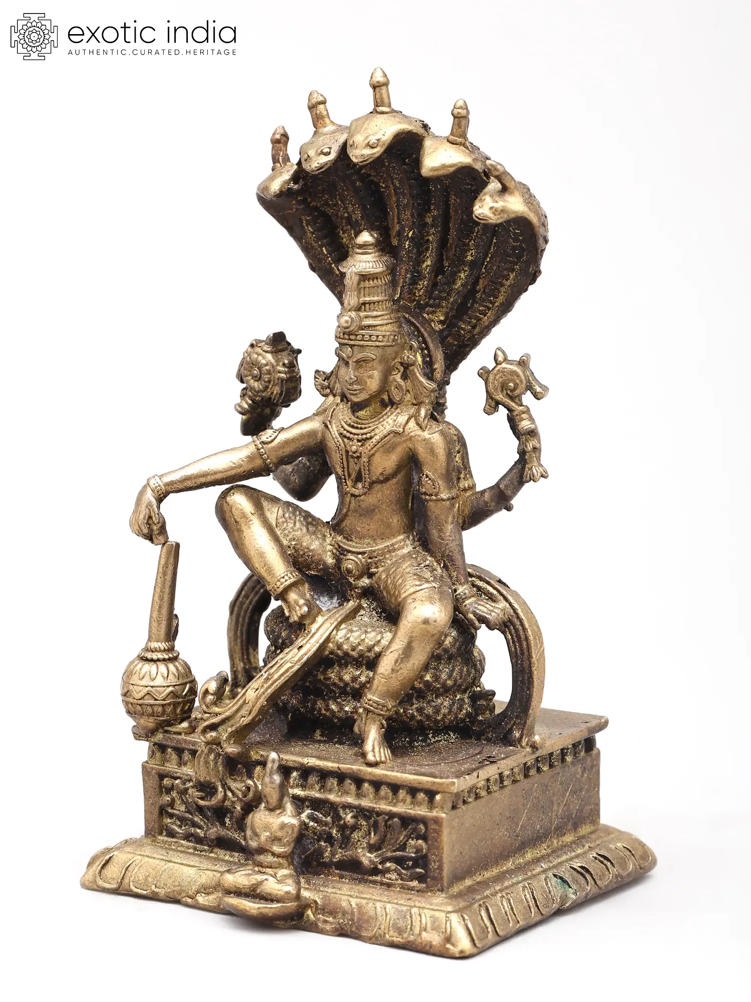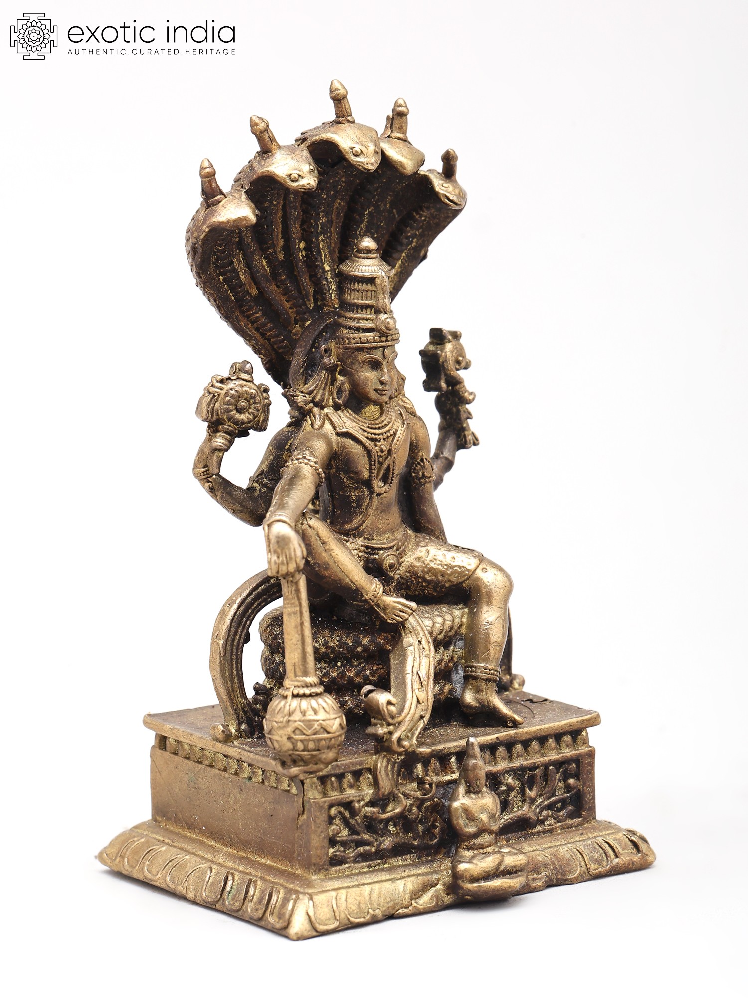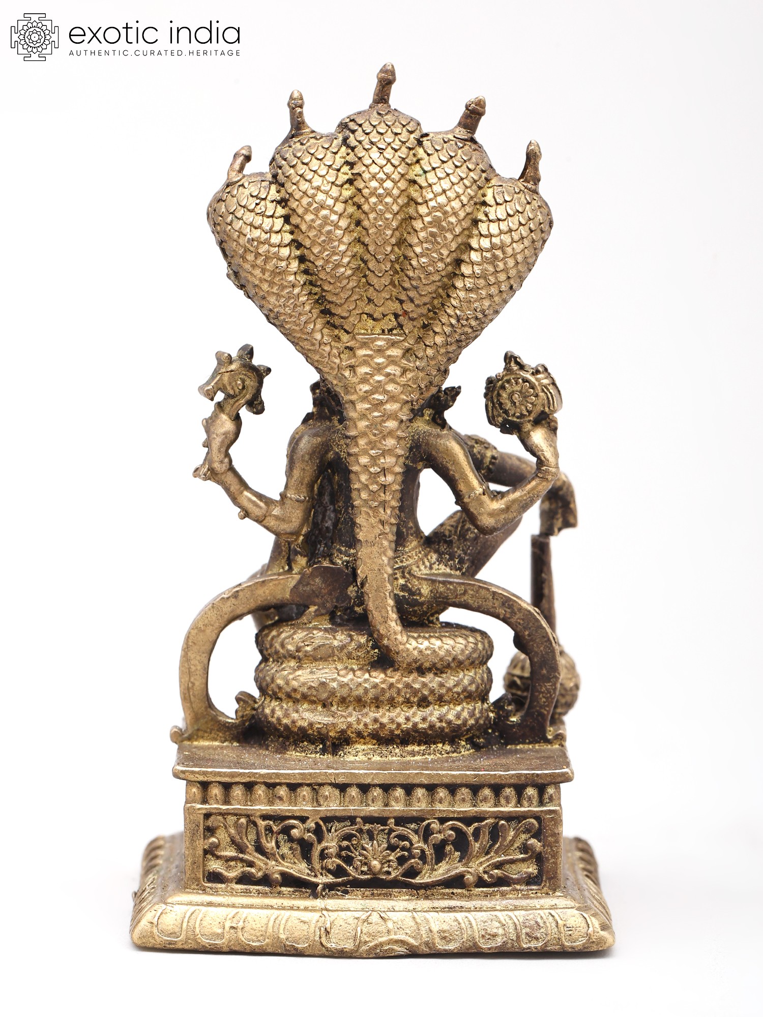 You'll appreciate the striking visual narrative presented by this composition, measuring approximately 3.2 inches in height, 2.0 inches in width, and 1.7 inches in depth. The powerful deity is depicted with his four arms, each thoughtfully holding an emblem of his divine attributes: the discus, conch shell, mace, and lotus. The serpent Sheshnag, with its multi-headed hood, forms a majestic canopy, its scales intricately rendered to convey both strength and elegance. The detailed ornamentation on the throne and the subtle patina further enhance its antique charm and luxurious appeal.
