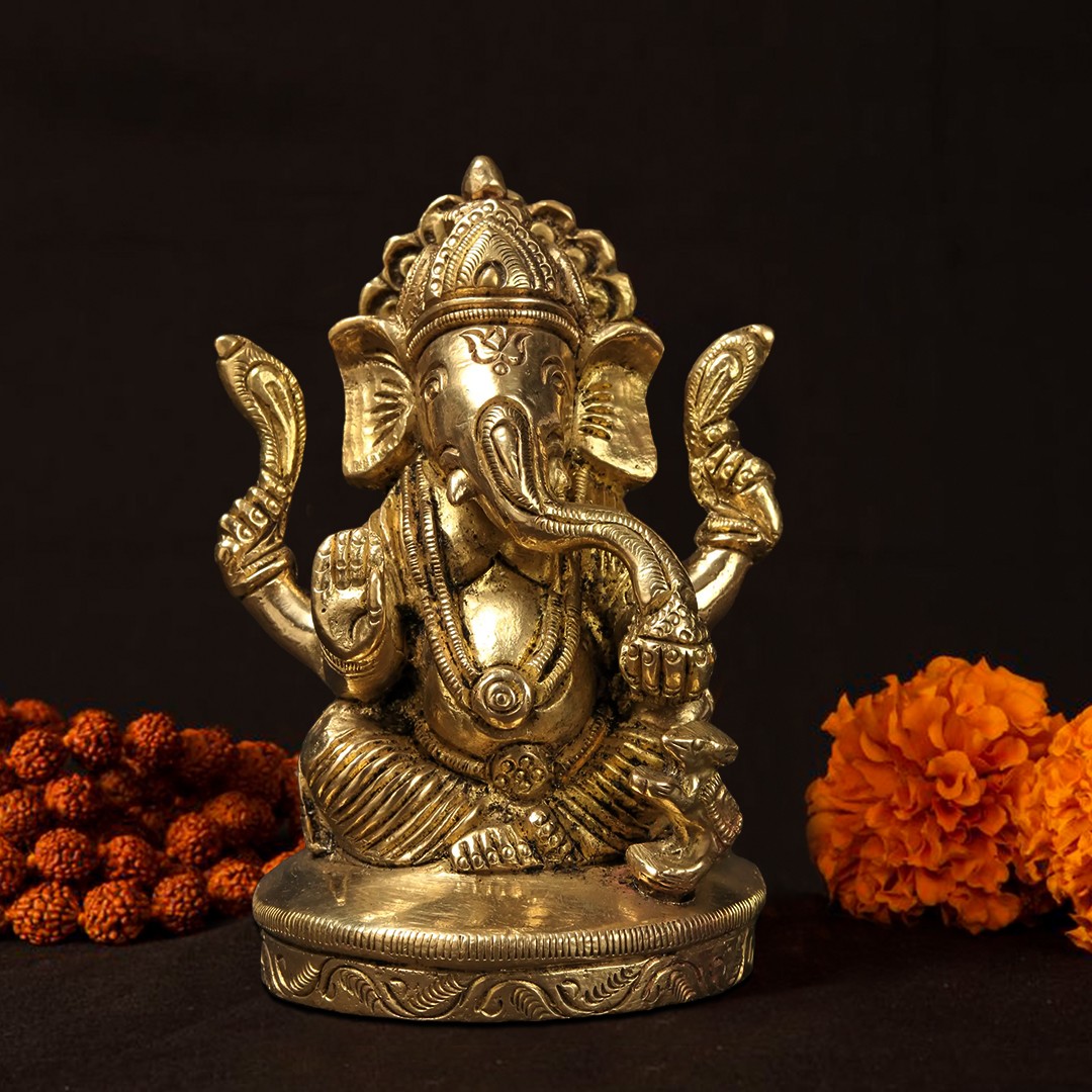 Invite divine blessings and an aura of prosperity into your home with this exquisite brass statue of Lord Ganesha, the beloved elephant-headed deity. Revered as the remover of obstacles and the god of wisdom, beginnings, and intellect, Ganesha is one of the most worshipped deities in the Hindu pantheon. This intricately crafted idol captures the essence of his benevolent nature, depicting him in a moment of serene enjoyment, savoring a modak, his favorite sweet. The modak, a steamed rice dumpling filled with jaggery and coconut, holds significant symbolic meaning. It represents the sweet rewards of spiritual knowledge and the fruits of righteous actions. Ganesha's fondness for modaks signifies his appreciation for wisdom and the understanding that true happiness comes from within. As he holds this delectable treat, this statue embodies the joy and fulfillment that comes from pursuing knowledge and overcoming challenges.