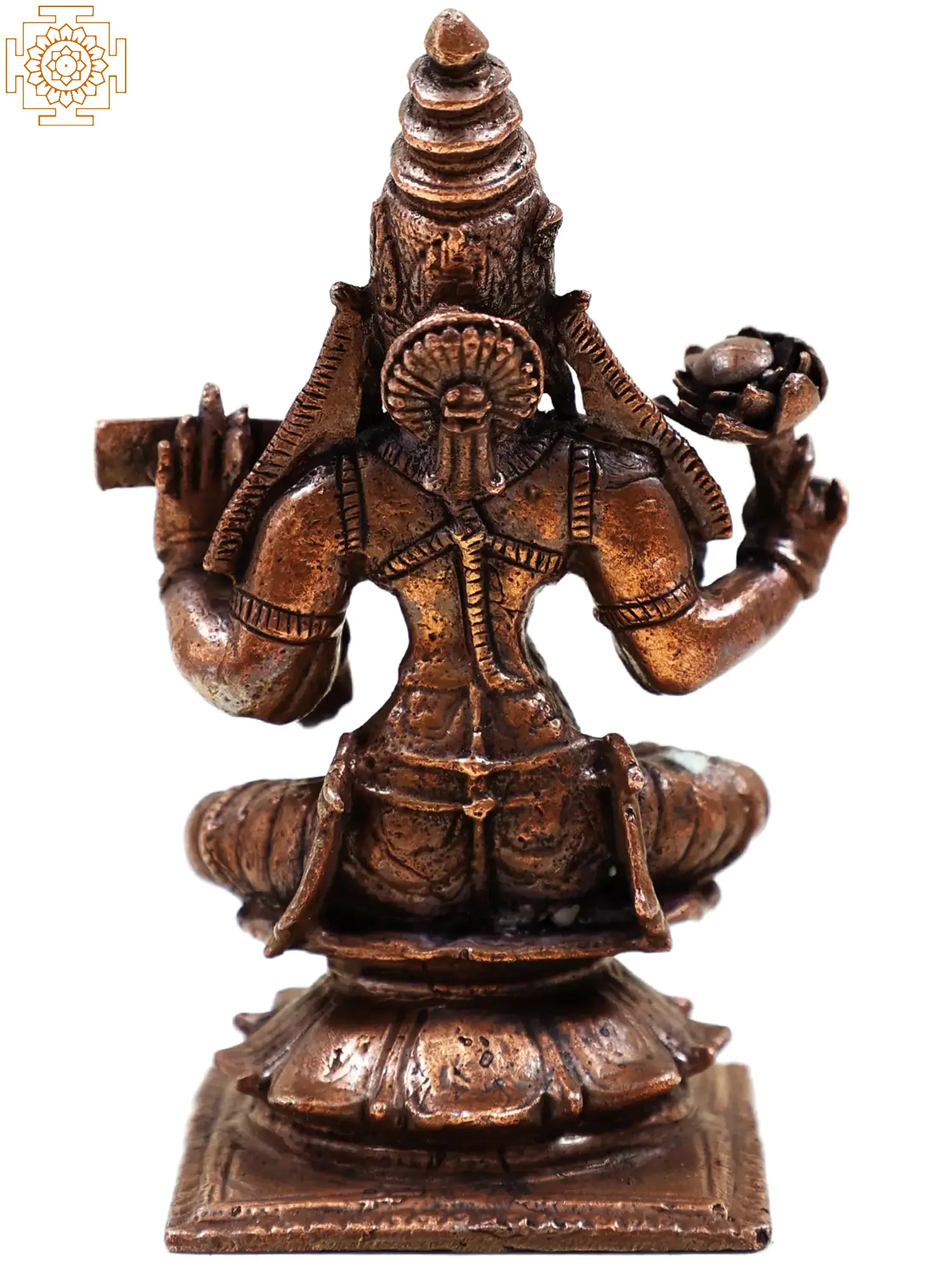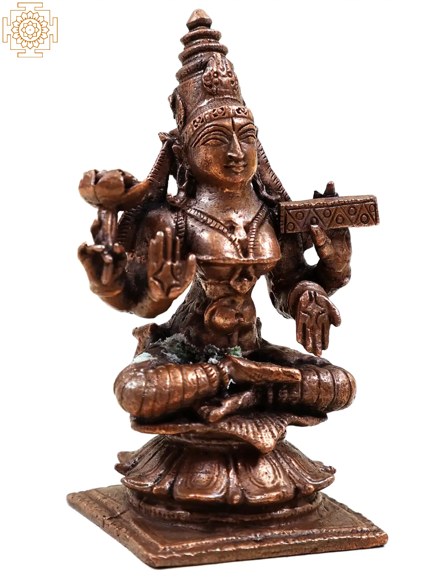 Maa Lakshmi in the Hindu pantheon is the embodiment of earthly and heavenly richness. In this small copper statue, the goddess Lakshmi has been presented with all the attributes symbolizing her reign over the spheres of auspiciousness. Devi’s youthful form suggests the fecundity of the earth, the lotus in her is a symbol of the origin of the universe, the book in her hand represents the abundance of spiritual wisdom and her hands in the gesture of Varada (giving boons) and Abhaya (fearlessness) outlines her benevolence presence in the life of her devotees.