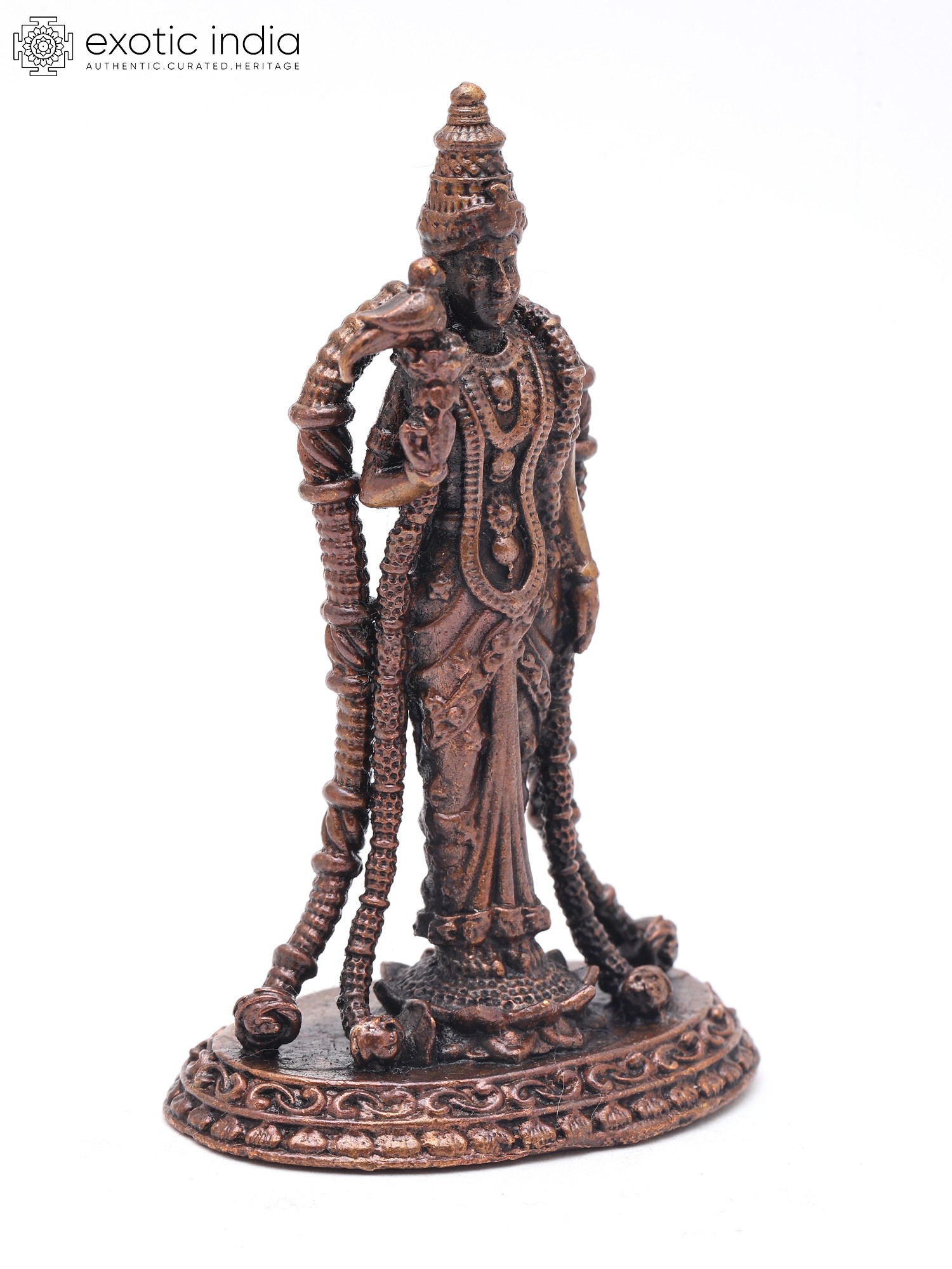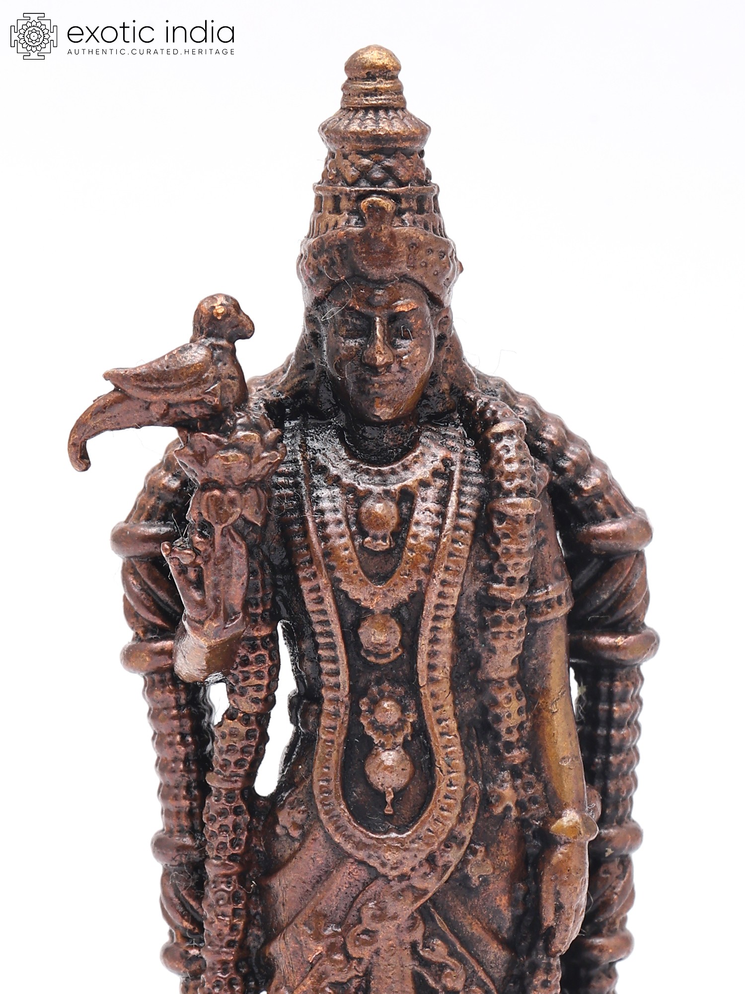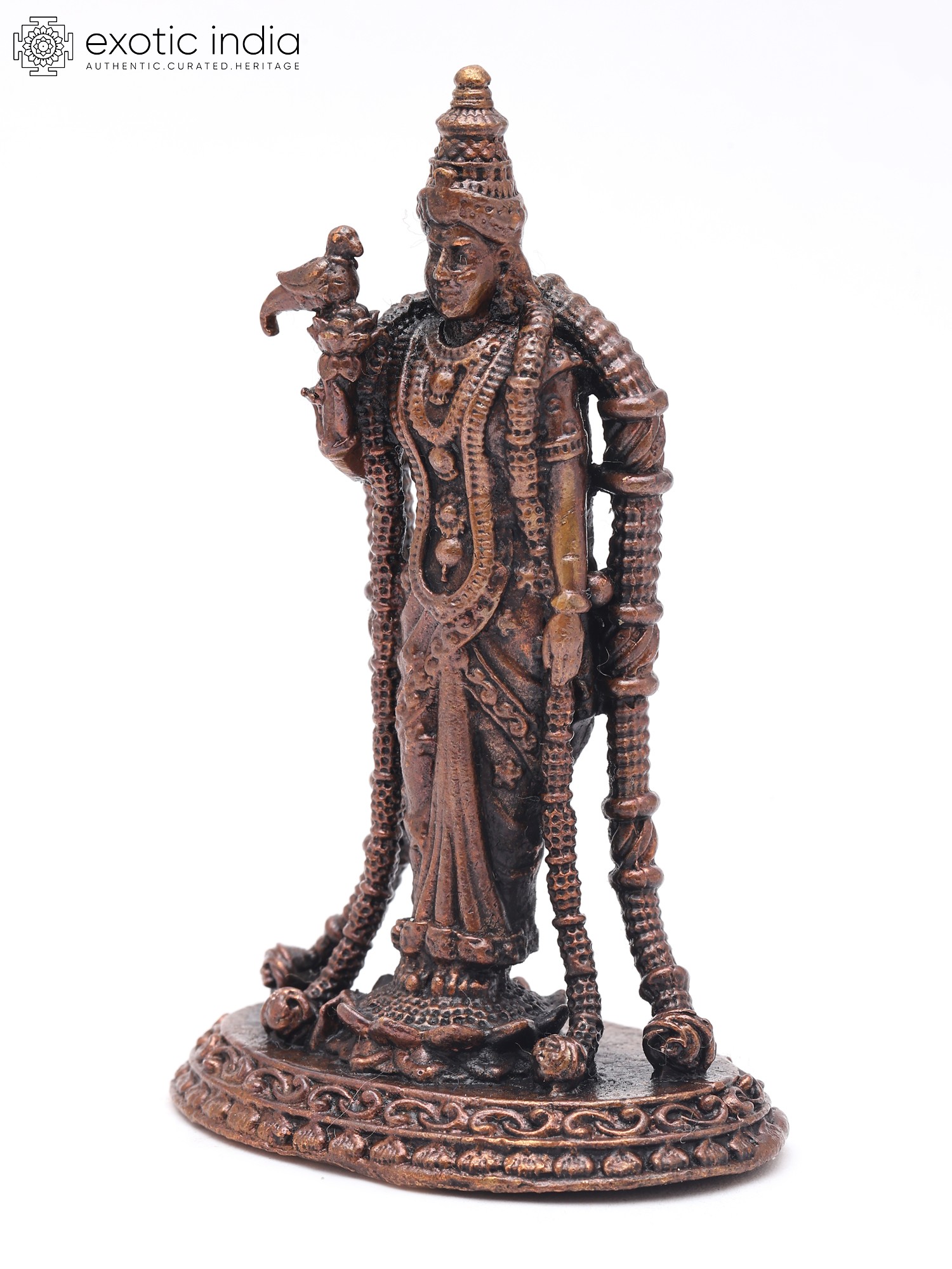 Observe the elegant posture and serene expression, reflecting a profound sense of peace and strength. The delicate rendering of adornments, from the elaborate crown to the flowing garlands and intricately braided cords, showcases the artisan's dedication. A charming bird perches gracefully on the figure's arm, adding a unique touch of life and symbolic meaning. This compact masterpiece, measuring just three inches tall, is a testament to how immense artistry can be captured in a small form.