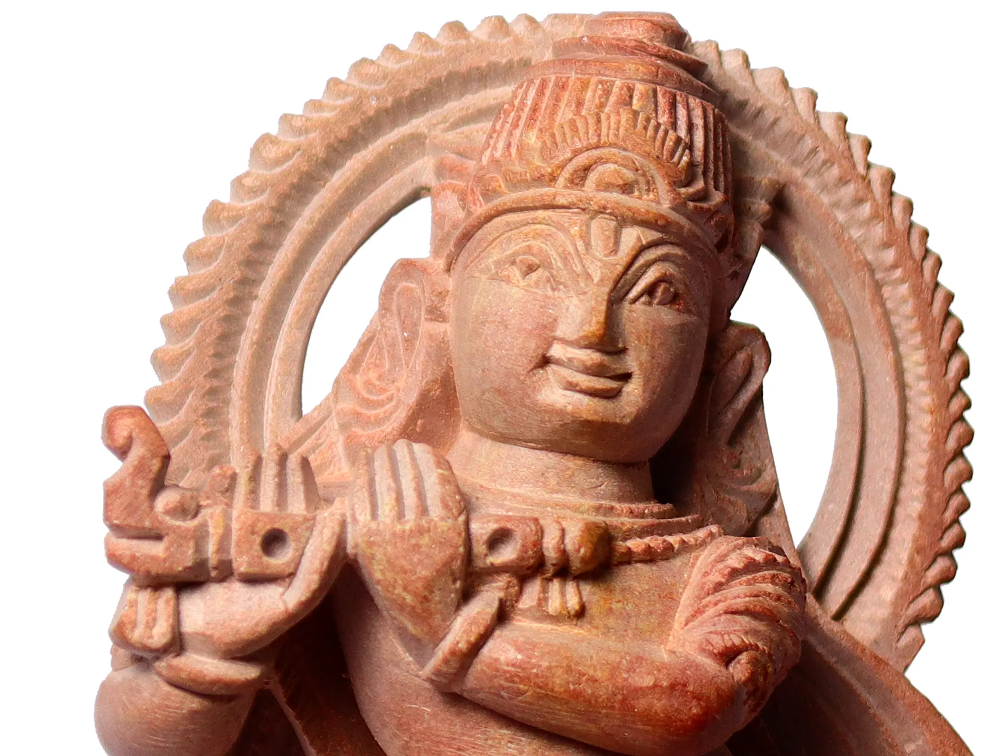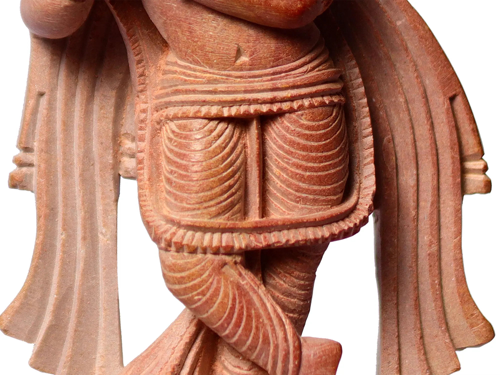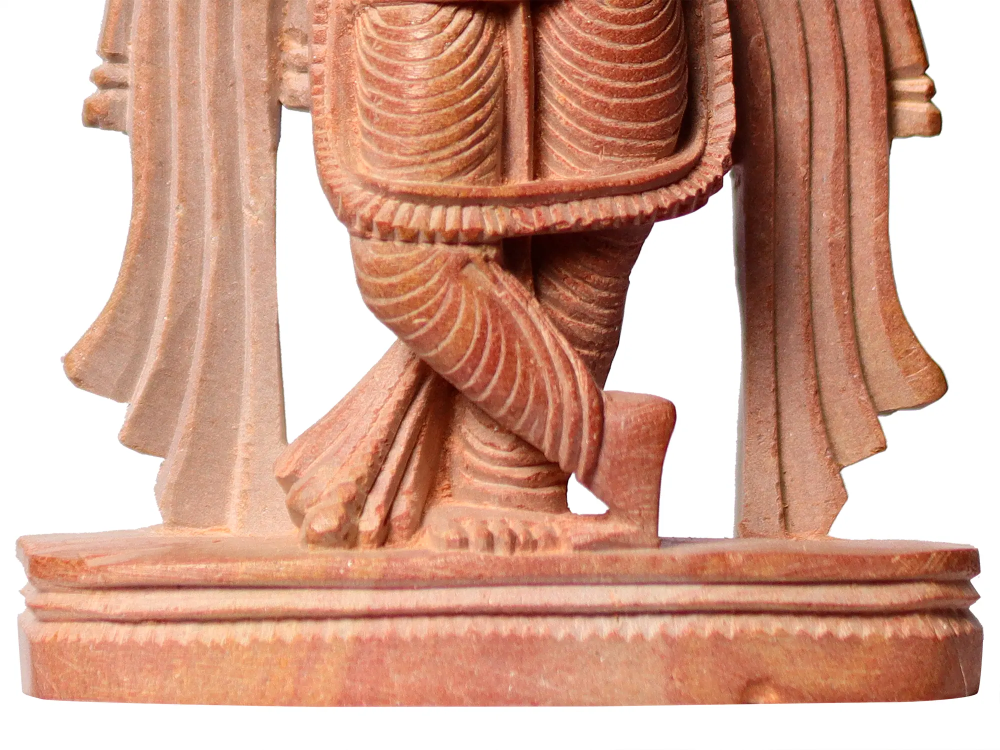 Carved from a delicate pink stone, this sculpture exudes a glow, reflecting the joy and love embodied by Lord Krishna. His enchanting form stands in a charming pose, one foot gracefully crossed over the other, portraying His eternal dance of divine love. Lord Krishna, with his playful and enchanting form, is the embodiment of divine love and devotion. His music, represented by the melodious flute, transcends the boundaries of mortal existence, resonating with the hearts of all living beings. The flute's ethereal sound beckons the soul to turn inward and listen to the divine call of spiritual awakening.