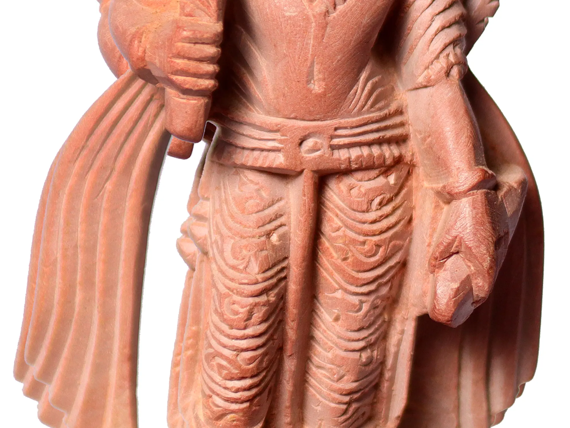 This exquisite statue captures the formidable presence of Lord Balaram, the elder brother of Lord Krishna, a deity revered for his strength, agricultural prowess, and connection to the land. Rendered in a warm, earthy pink stone, this piece embodies the robust and protective qualities associated with Balaram. The sculptor's skillful hands have brought forth a figure of grace and power, evident in the intricate details of his attire and the confident posture he assumes. The statue depicts Balaram standing tall, adorned with traditional ornaments and a distinctive headdress. His expression is serene yet firm, hinting at the unwavering resolve that characterized his divine missions. In his hands, he holds the tools of his strength and authority – the plow (hal) and the pestle (musala), symbols of his association with farming and his ability to overcome obstacles. The flowing dhoti and the ornate belt further emphasize his regal bearing, while the finely carved musculature suggests immense physical power. The circular halo behind his head, intricately patterned, signifies his divine radiance and protective aura. The base, carved with classic motifs, grounds the deity, connecting him to the terrestrial realm he so powerfully influences. ––––––––––––––––––––