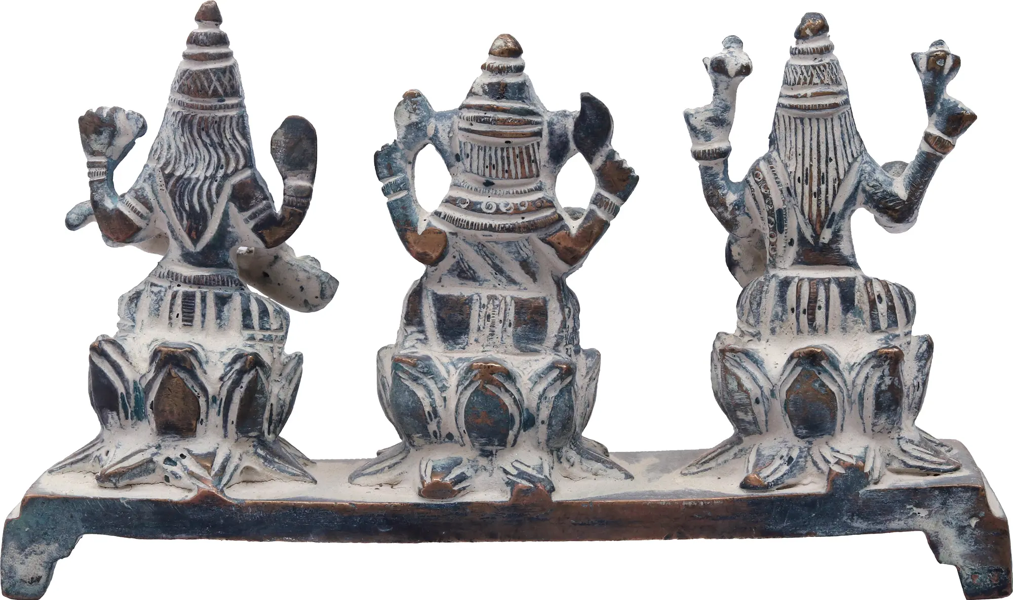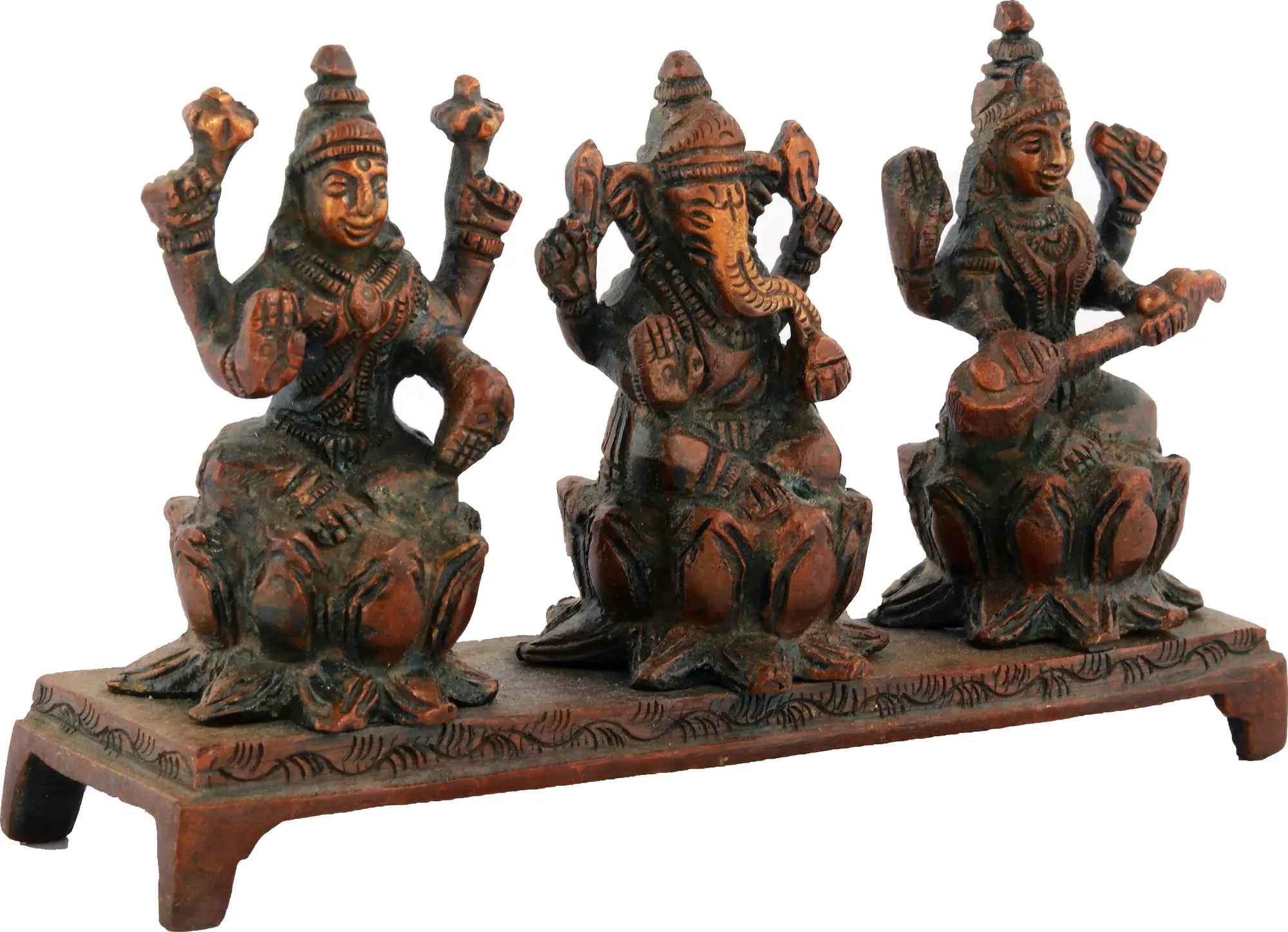 Cast in the warm hues of divine grace, this creation resonates with the cosmic dance of prosperity, wisdom, and auspiciousness. Lakshmi, the embodiment of abundance and wealth is seated beside Ganesha, the remover of obstacles, and Saraswati, the bestower of wisdom and creativity. Their forms, intricately detailed, reflect the myriad blessings they bring to devotees' lives. The trinity serves as a reminder that through reverence and intention, you can align yourself with the divine currents that flow through all of existence.