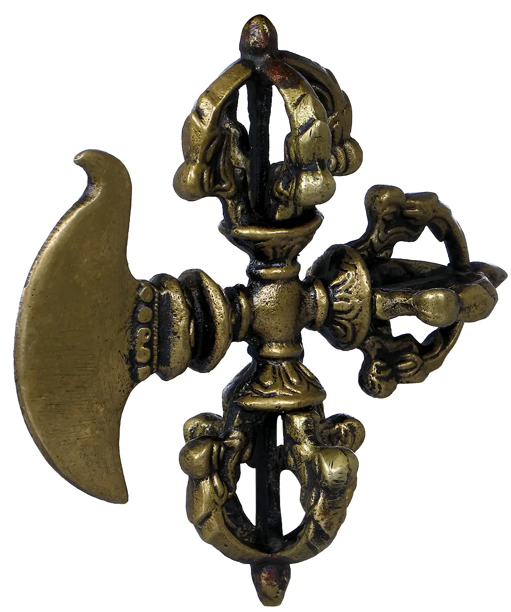 At its heart, this piece features the iconic vajra, also known as a dorje. This double-headed thunderbolt is a powerful emblem in Vajrayana Buddhism, representing the unbreakable nature of enlightenment and the indomitable will of the awakened mind. It is said to be the weapon of Indra, the king of the gods in Hindu mythology, capable of destroying ignorance and illusion. Coupled with the sharp, curved blade of the krira, or chopper, this artifact symbolizes the dual action of cutting through spiritual obscurations and misconceptions. The krira, in particular, is often associated with wrathful deities, signifying their fierce compassion and ability to sever the attachments and negative emotions that bind sentient beings to suffering. Together, they represent the skillful means to overcome obstacles on the spiritual journey.