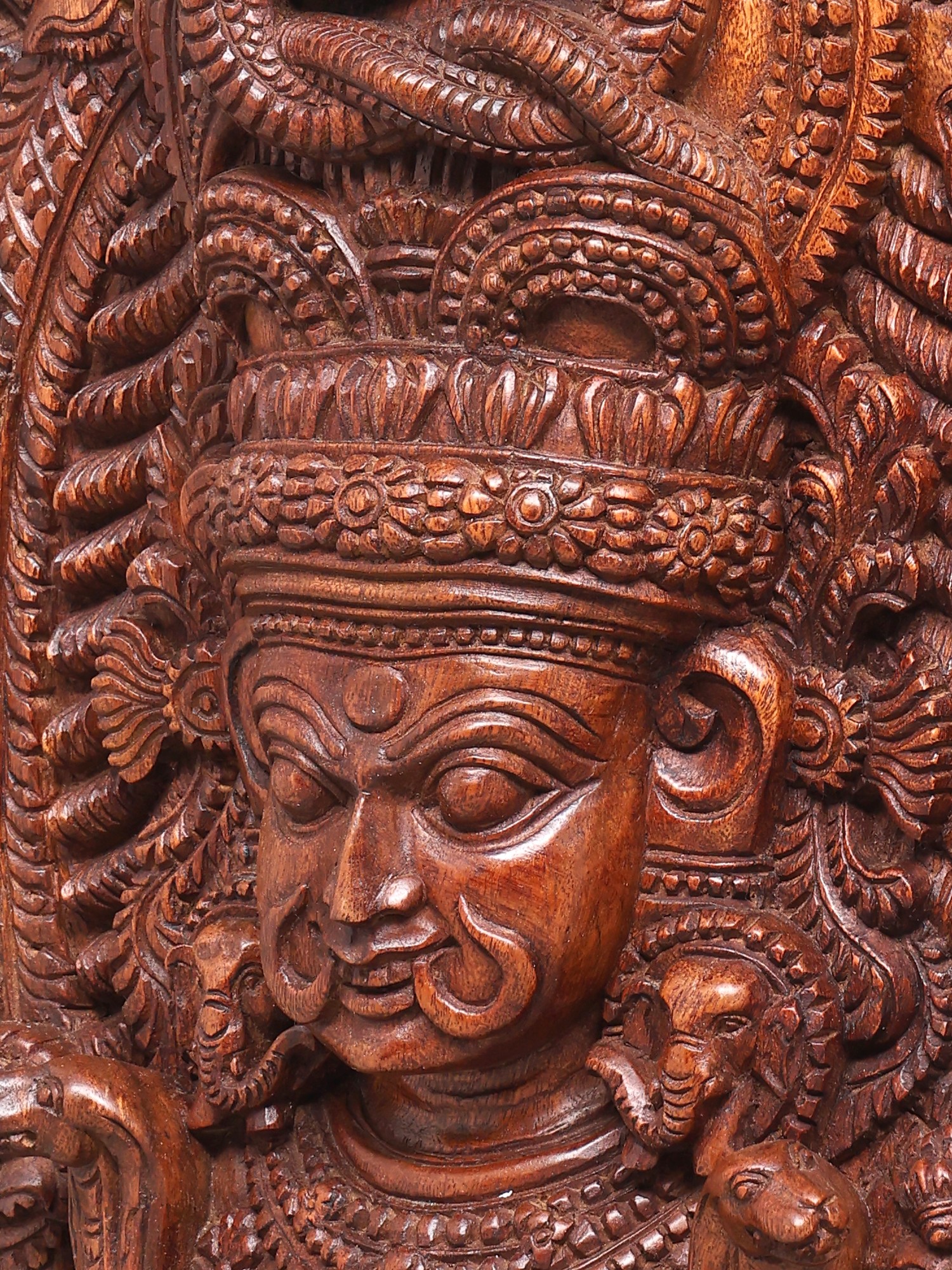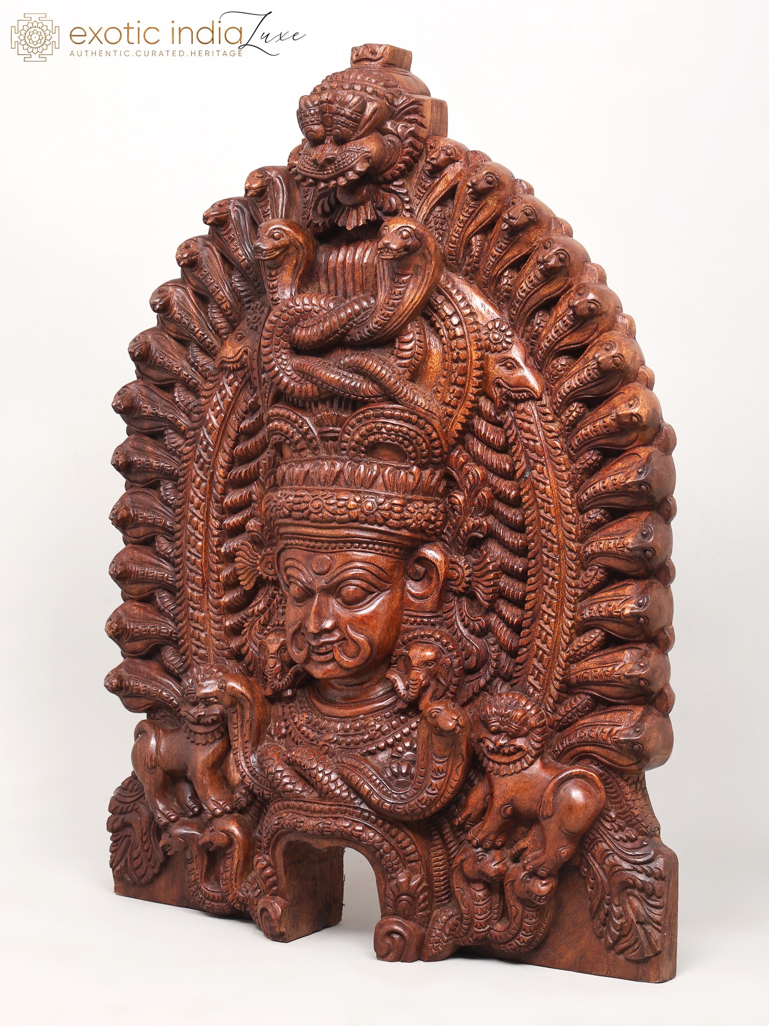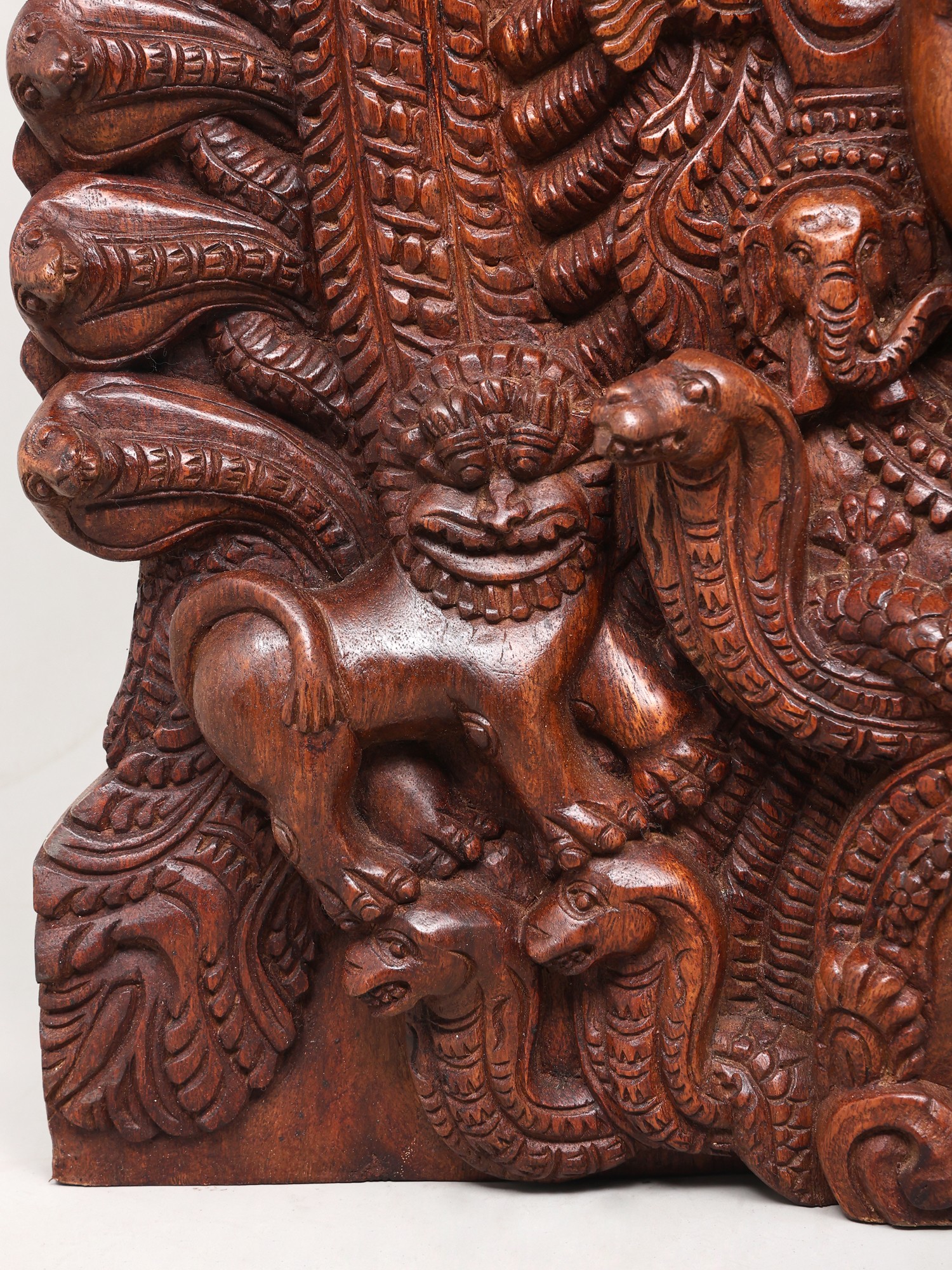 This magnificent wooden sculpture captures the awe-inspiring essence of Goddess Kali, a powerful and complex deity in the Hindu pantheon. Rendered in rich, warm wood, this piece is a testament to the intricate artistry of traditional carving. The goddess's countenance, though serene, hints at her immense power, with sharp, discerning eyes that seem to gaze into the very soul. Her elaborate headdress, a cascade of coiling serpents, symbolizes her dominion over time and the primal forces of creation and destruction. Each scale and curve of the snakes is meticulously detailed, imbuing them with a lifelike, sinuous quality. The surrounding nimbus, a fan of feathered motifs and interwoven serpentine forms, creates a halo of protective energy around the divine figure. This design evokes the cosmic dance of creation and dissolution, a central theme associated with Kali. The sculptural details are not merely decorative; they carry deep symbolic meaning. The serpents are often seen as guardians of hidden knowledge and transformers of energy, while the feathered patterns can represent the celestial realms or the cyclical nature of existence. The inclusion of mythical creatures, such as the regal lion-like beings at the base, further enhances the sculpture's aura of divine strength and authority.