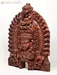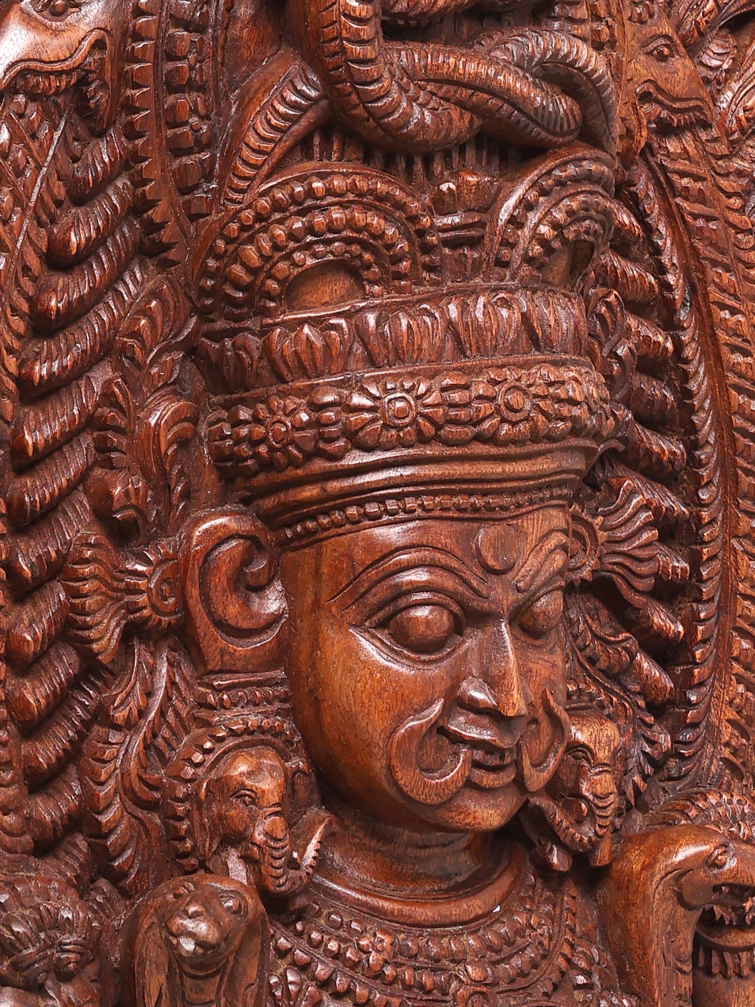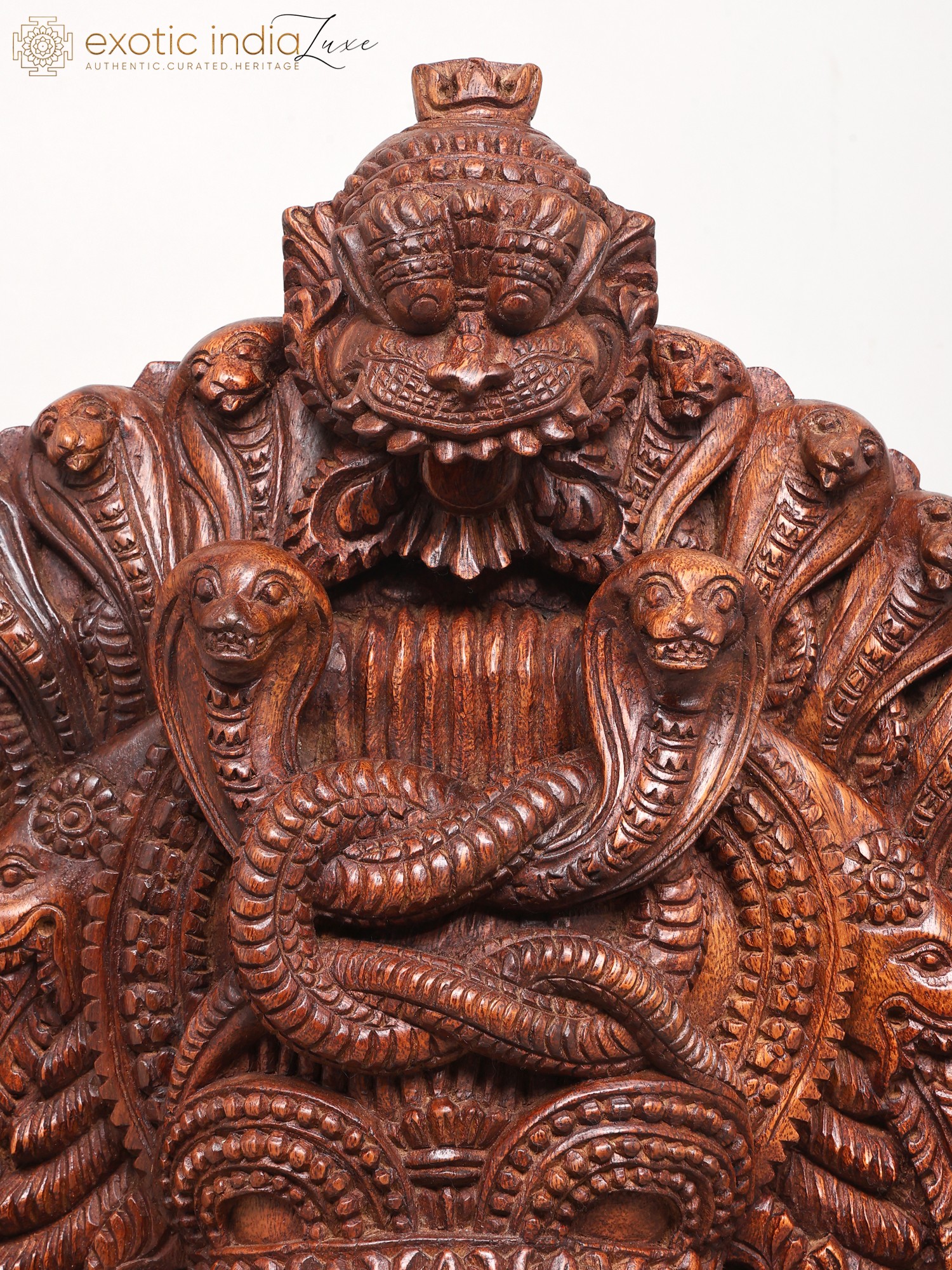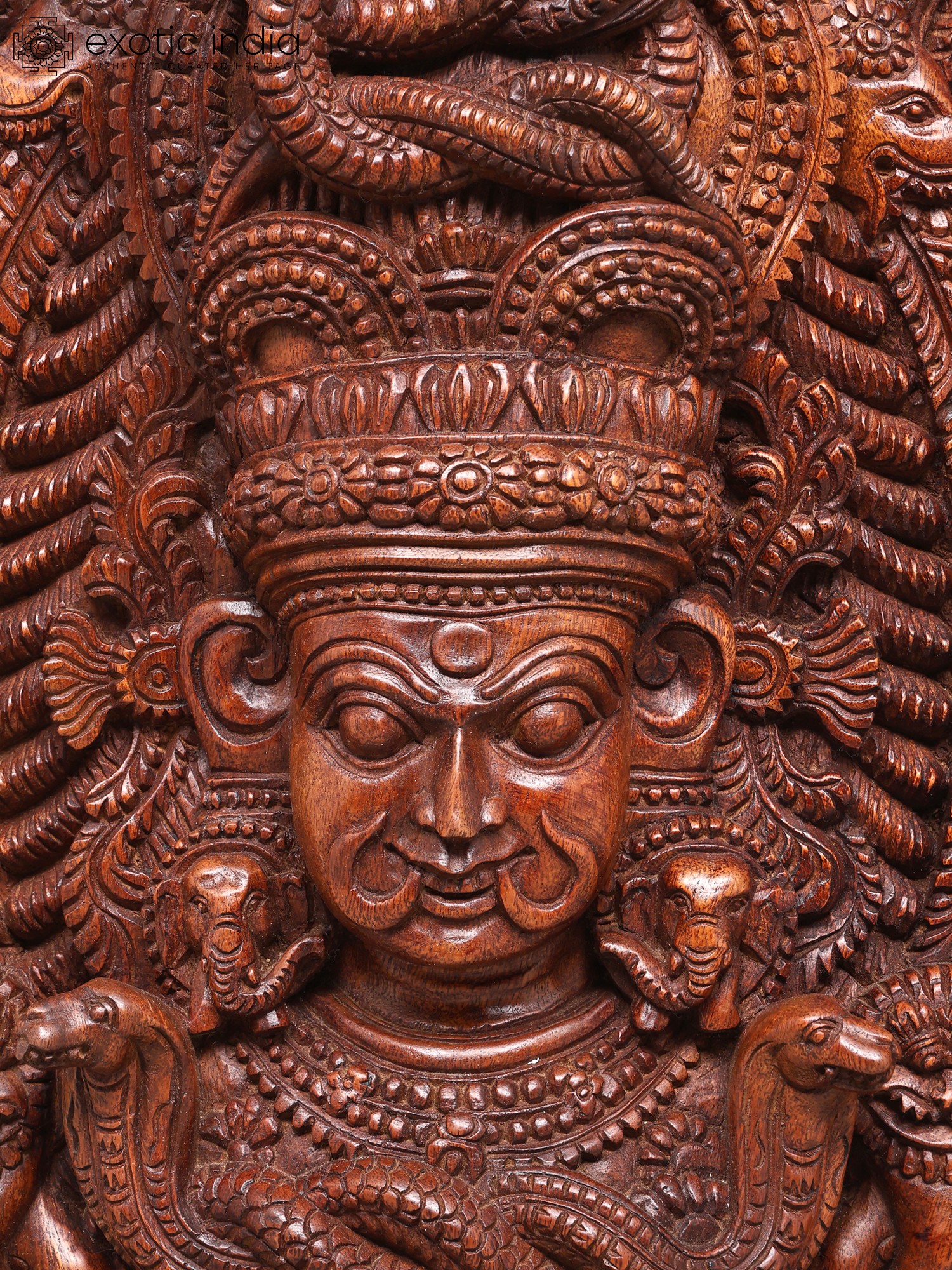 This magnificent wooden sculpture captures the awe-inspiring essence of Goddess Kali, a powerful and complex deity in the Hindu pantheon. Rendered in rich, warm wood, this piece is a testament to the intricate artistry of traditional carving. The goddess's countenance, though serene, hints at her immense power, with sharp, discerning eyes that seem to gaze into the very soul. Her elaborate headdress, a cascade of coiling serpents, symbolizes her dominion over time and the primal forces of creation and destruction. Each scale and curve of the snakes is meticulously detailed, imbuing them with a lifelike, sinuous quality. The surrounding nimbus, a fan of feathered motifs and interwoven serpentine forms, creates a halo of protective energy around the divine figure. This design evokes the cosmic dance of creation and dissolution, a central theme associated with Kali. The sculptural details are not merely decorative; they carry deep symbolic meaning. The serpents are often seen as guardians of hidden knowledge and transformers of energy, while the feathered patterns can represent the celestial realms or the cyclical nature of existence. The inclusion of mythical creatures, such as the regal lion-like beings at the base, further enhances the sculpture's aura of divine strength and authority.
