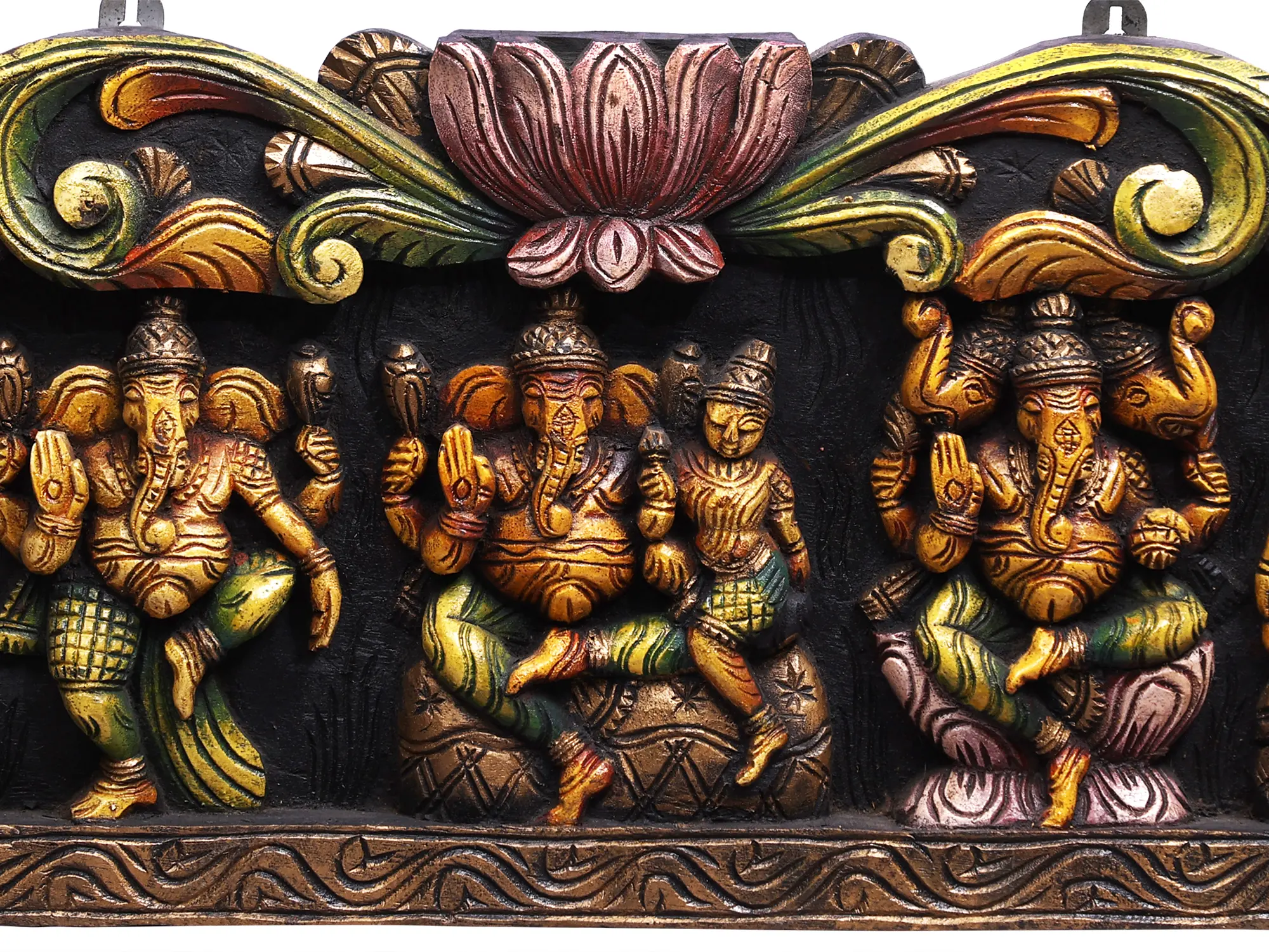 Shakti Ganapati (a Tantric form, Ganesha with his feminine energy who together create and sustain the Universe), Trimukha Ganapati (three-headed Ganesha who looks after all life forms), Lakshmi Ganapati (another Tantric aspect, which brings abundance and wisdom). As the benevolent guardian, Ganesha takes these forms eternally, to originate, nourish, and sustain the Universe, the divine beauty of which is perfectly condensed in the iconography of this wooden artwork.