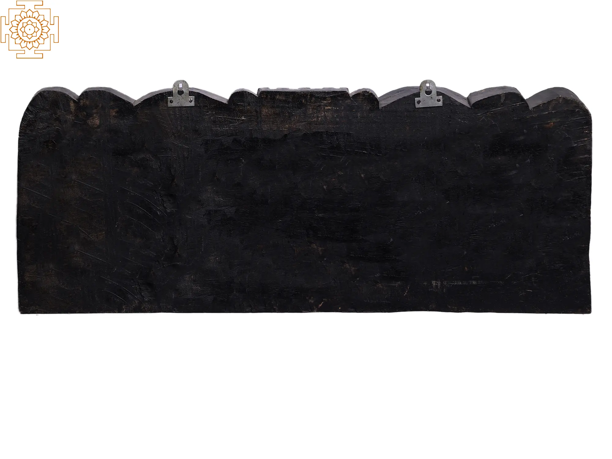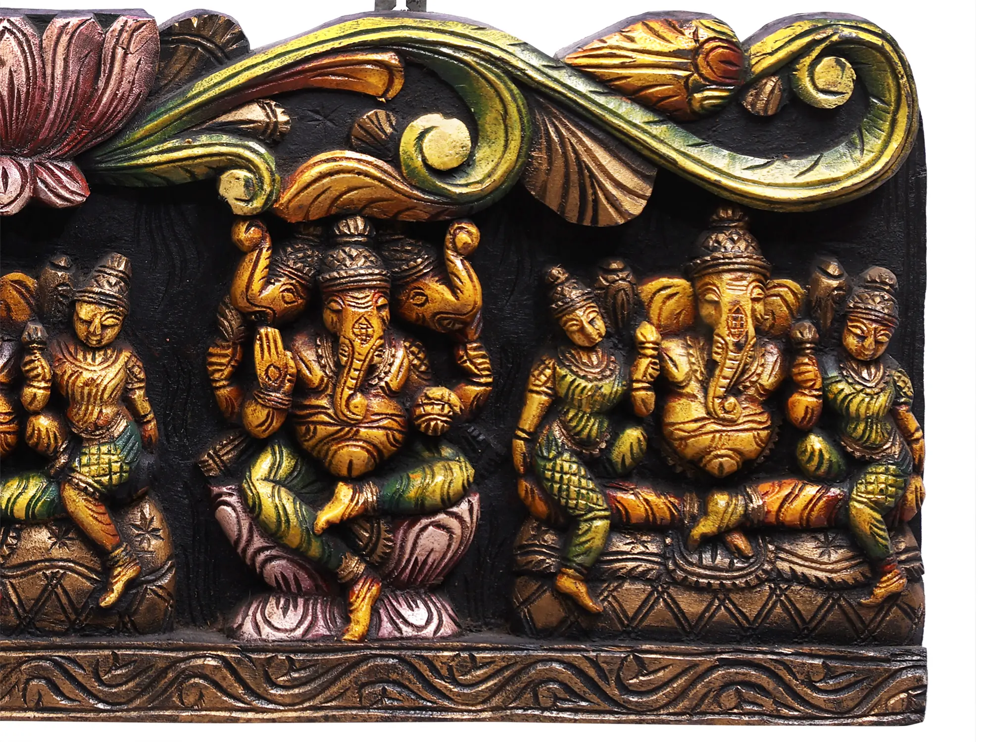Marked by a blooming Kamala (lotus) which symbolizes the origin and sustenance of the Universe, this wooden wall panel reveres the auspicious protector of the Universe- Sri Ganesha, through the depictions of his various aspects. From the left, Ganesha appears as Srishti Ganesha (the supreme being, Param Brahman, who was, is, and will be the most powerful one), Nritya Ganapati (dancing Ganesha, an expression of bliss and goodness).