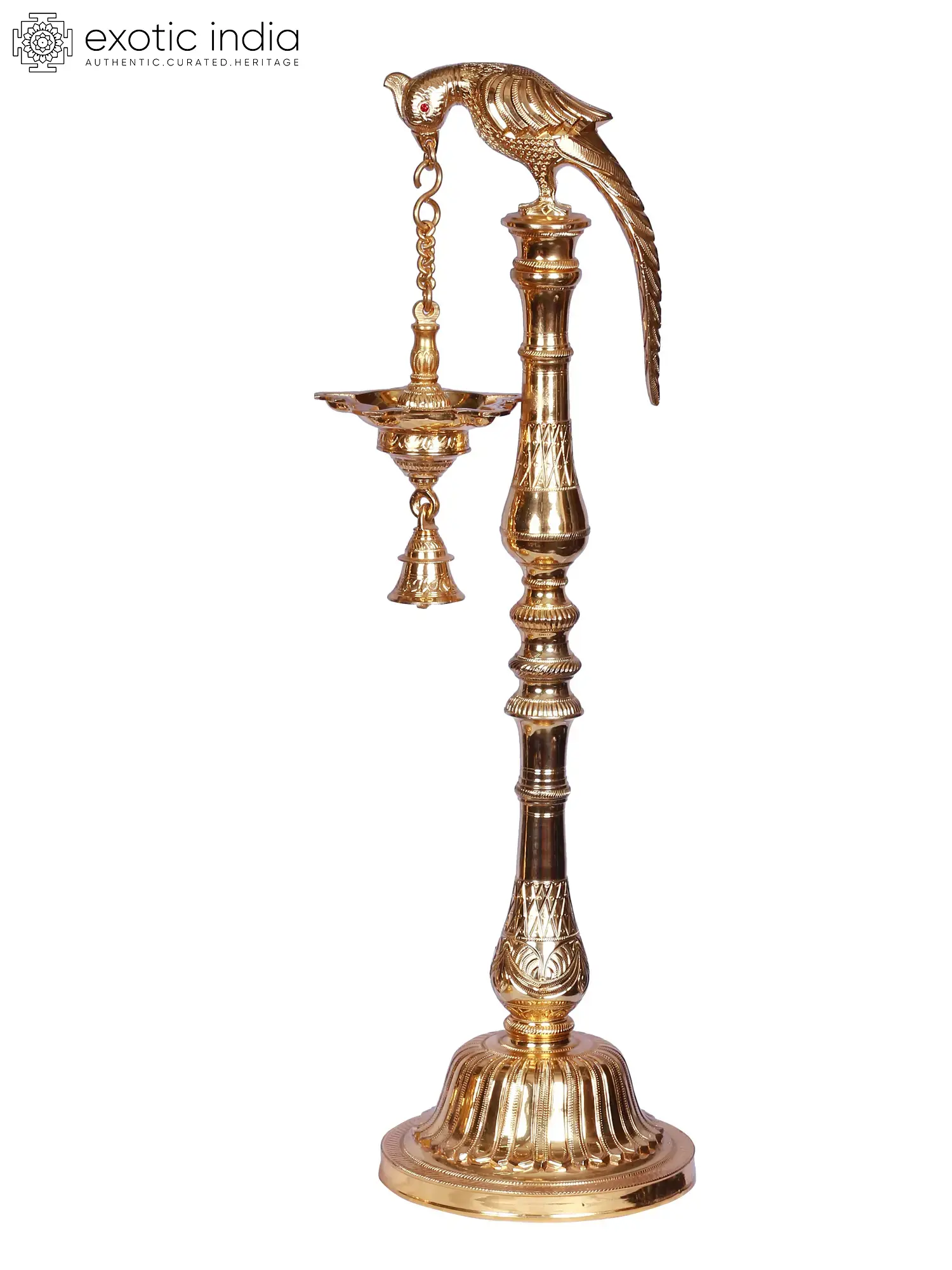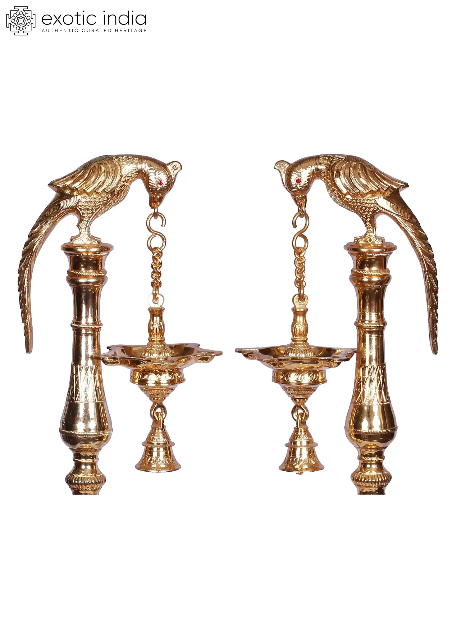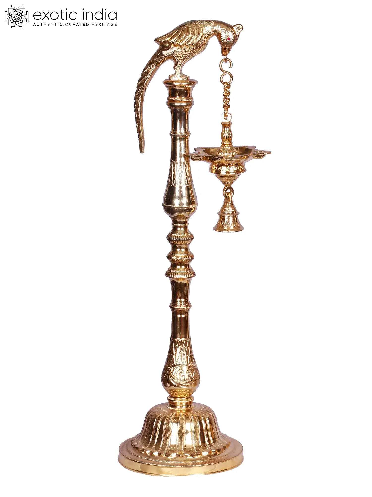 The parrot, as a Vahana of Kamadev, is a symbol of love in Indian culture. Goddess Kamakshi of Kanchipuram holds the parrot in her right hand. The parrot motif is linked to courtship, love, and passion. This pair of columnar brass lamps with a stylized parrot insignia on top includes five wicked hanging lights affixed to the bird's mouth. circular oil basin. It has a stunning gold paint job that looks stunning. Lighting this lamp or using it as a decorative piece will bring the blessings of the Almighty.