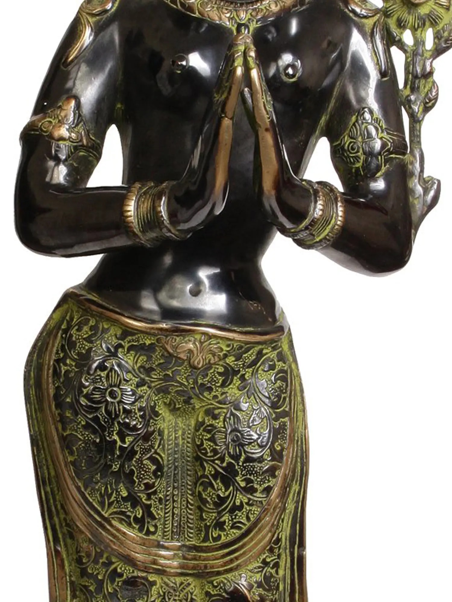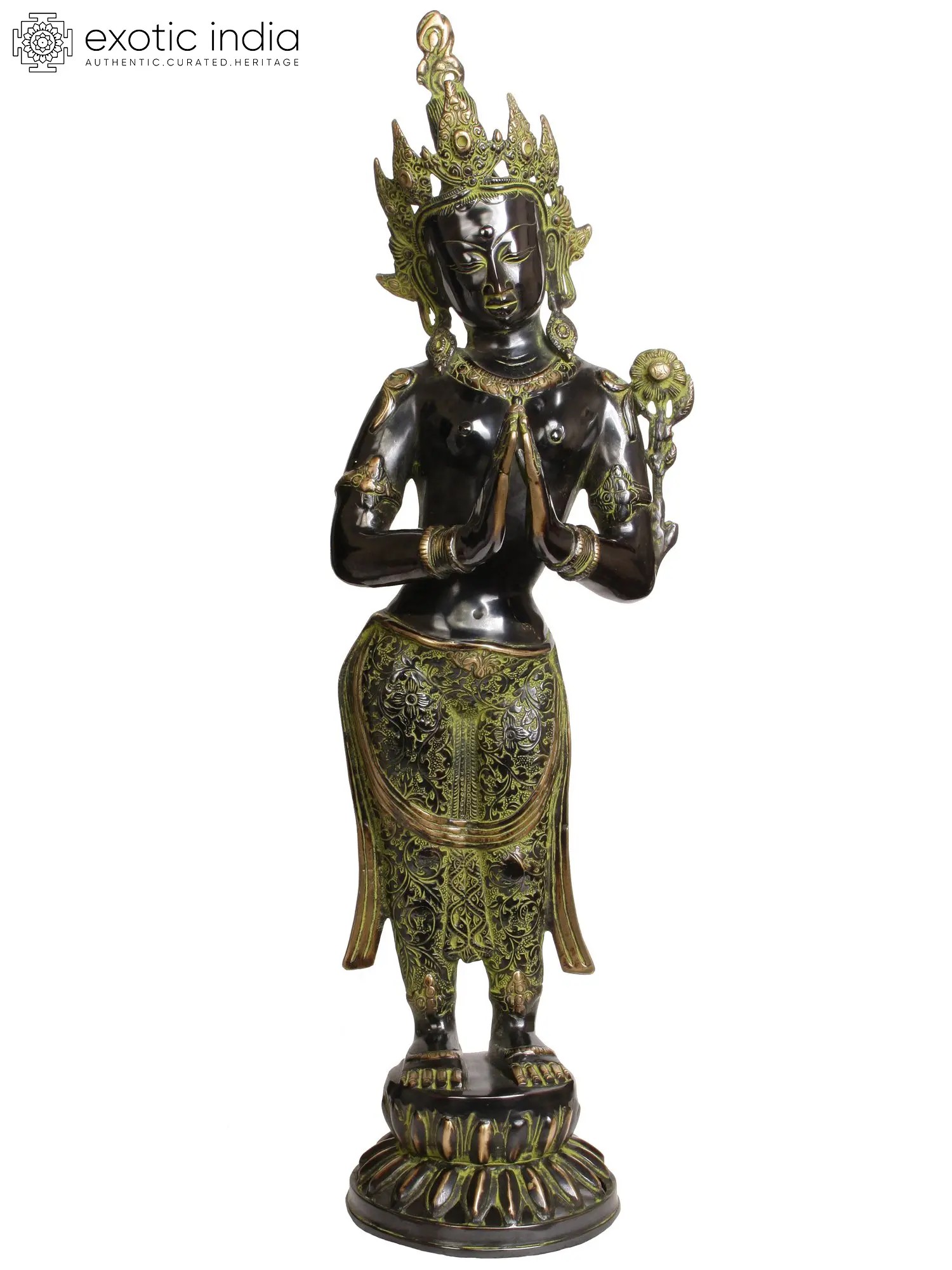 This magnificent brass statue depicts Namaste Tara, the Tibetan Buddhist deity who is loving and compassionate. Her hands are in the namaste position, signifying the divine connection that exists within all beings. Her lotus represents purity in the midst of chaos, and her outstretched palm gesture offers safety to everyone who is seeking it. Tara's flowing robes mirror her limitless compassion, and her calm gaze exudes knowledge. This representation encourages us to acknowledge the divine feminine that exists inside and around us and to embrace the caring parts of the world.