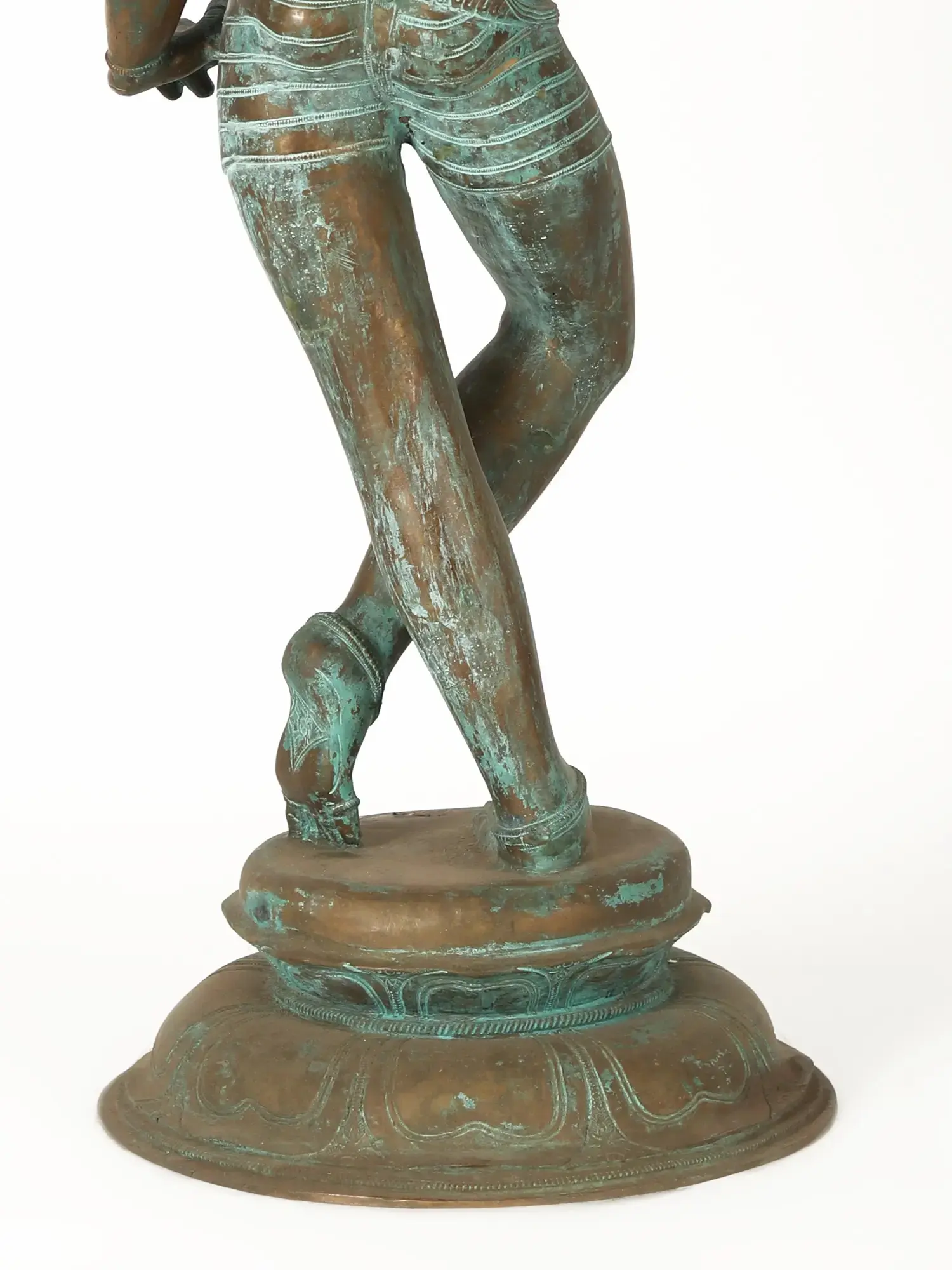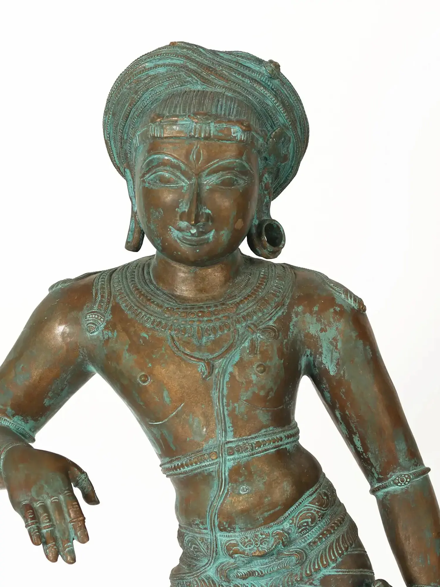 Shiva, the yogi and destroyer of ignorance, is venerated in a variety of ways and forms, one of which is lord Vrisha-Vahana. This bronze statue represents Shiva in his Vrisha-Vahana form, standing in a stance that suggests he is leaning on Nandi yet Nandi is missing.