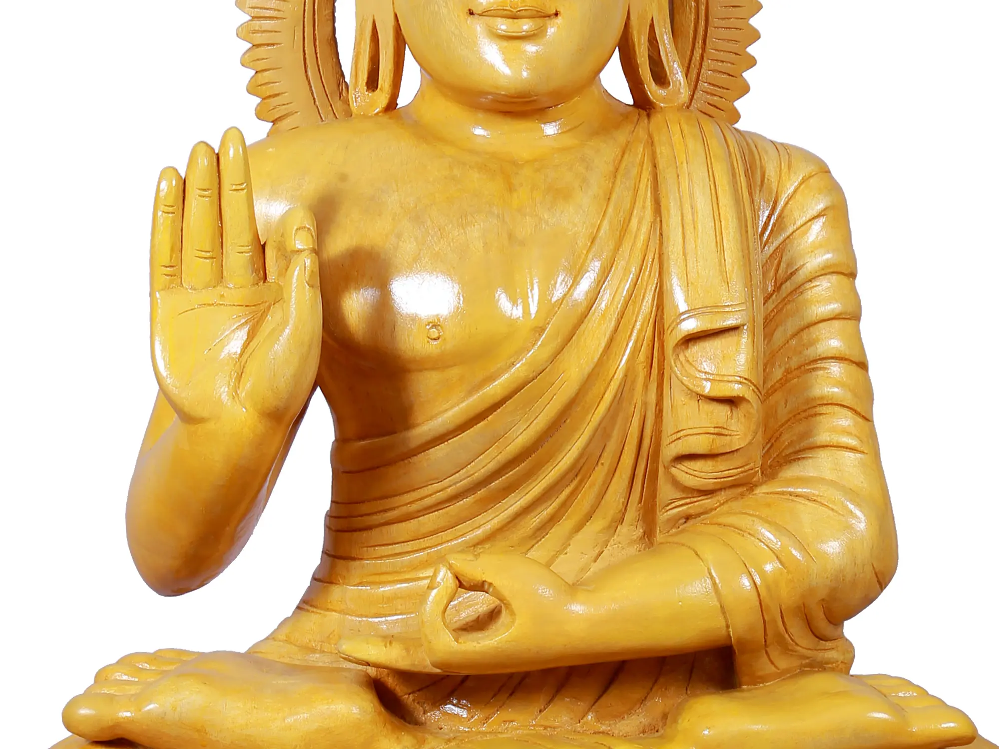This exquisite statue captures the serene presence of Siddhartha Gautama, the Buddha, in a posture of profound peace and spiritual elevation. Crafted from a beautiful, natural wood, this piece radiates a warm, inviting glow that speaks to its artisanal origin. The detailed carving brings to life the gentle folds of the Buddha's robes, the intricate curls of his hair, and the tranquil expression on his face, conveying a sense of deep wisdom and compassion. The Buddha is seated in the lotus position, a posture symbolizing spiritual purification and enlightenment. This position, known as Padmasana, is considered the most stable and comfortable for meditation, allowing the practitioner to focus inward and achieve a state of mental clarity. The hands are displayed in the Abhaya Mudra, a gesture of fearlessness and protection, often interpreted as a blessing or reassurance, dispelling doubt and offering comfort.