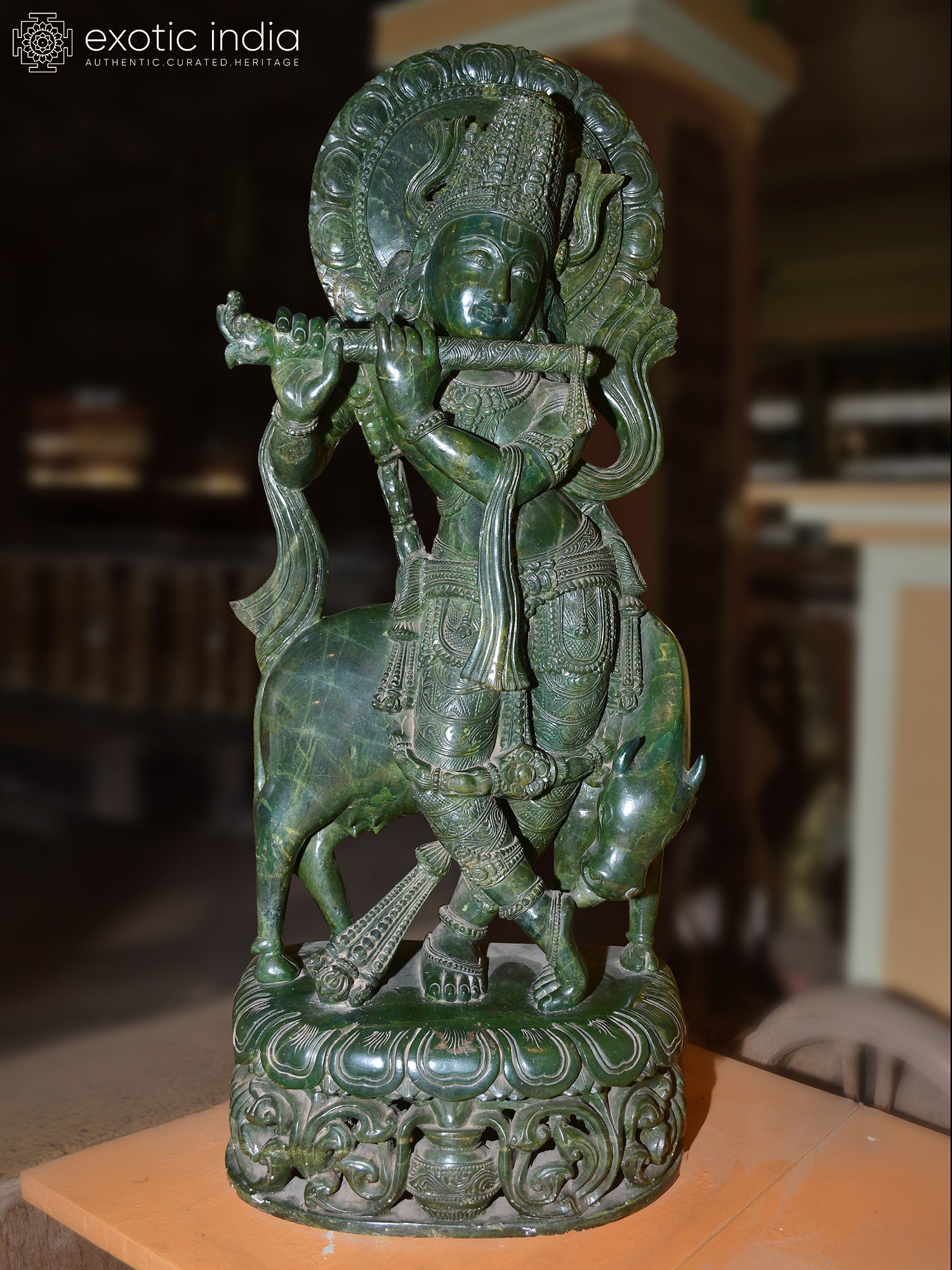 78" Large Designer Wooden Temple with Superfine Lord Krishna Statue in Brass