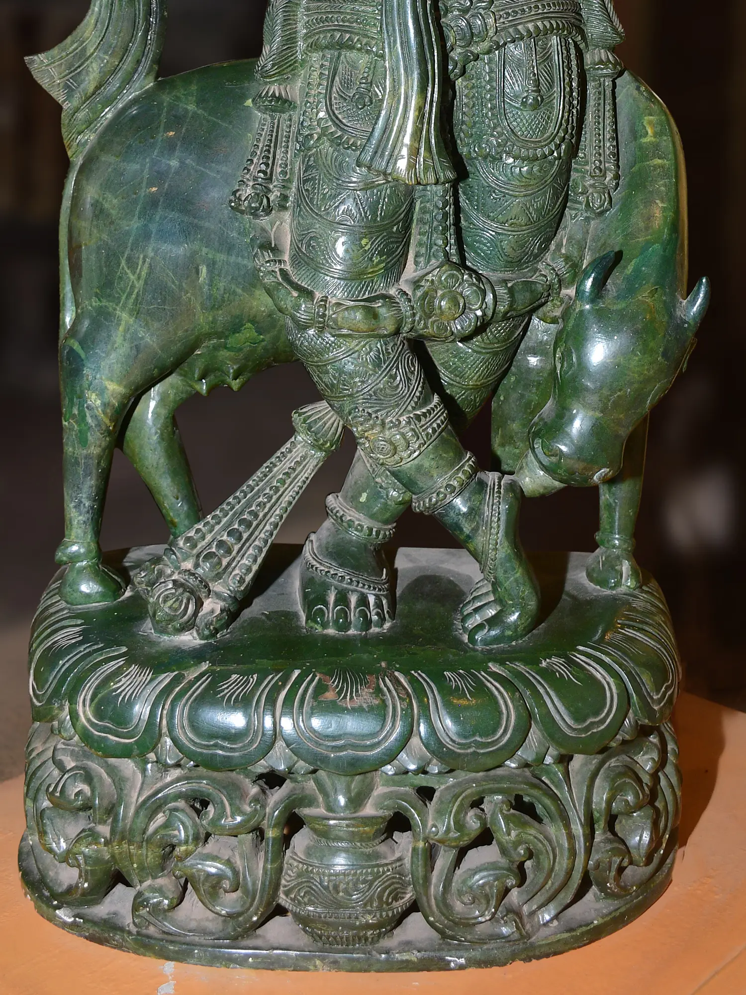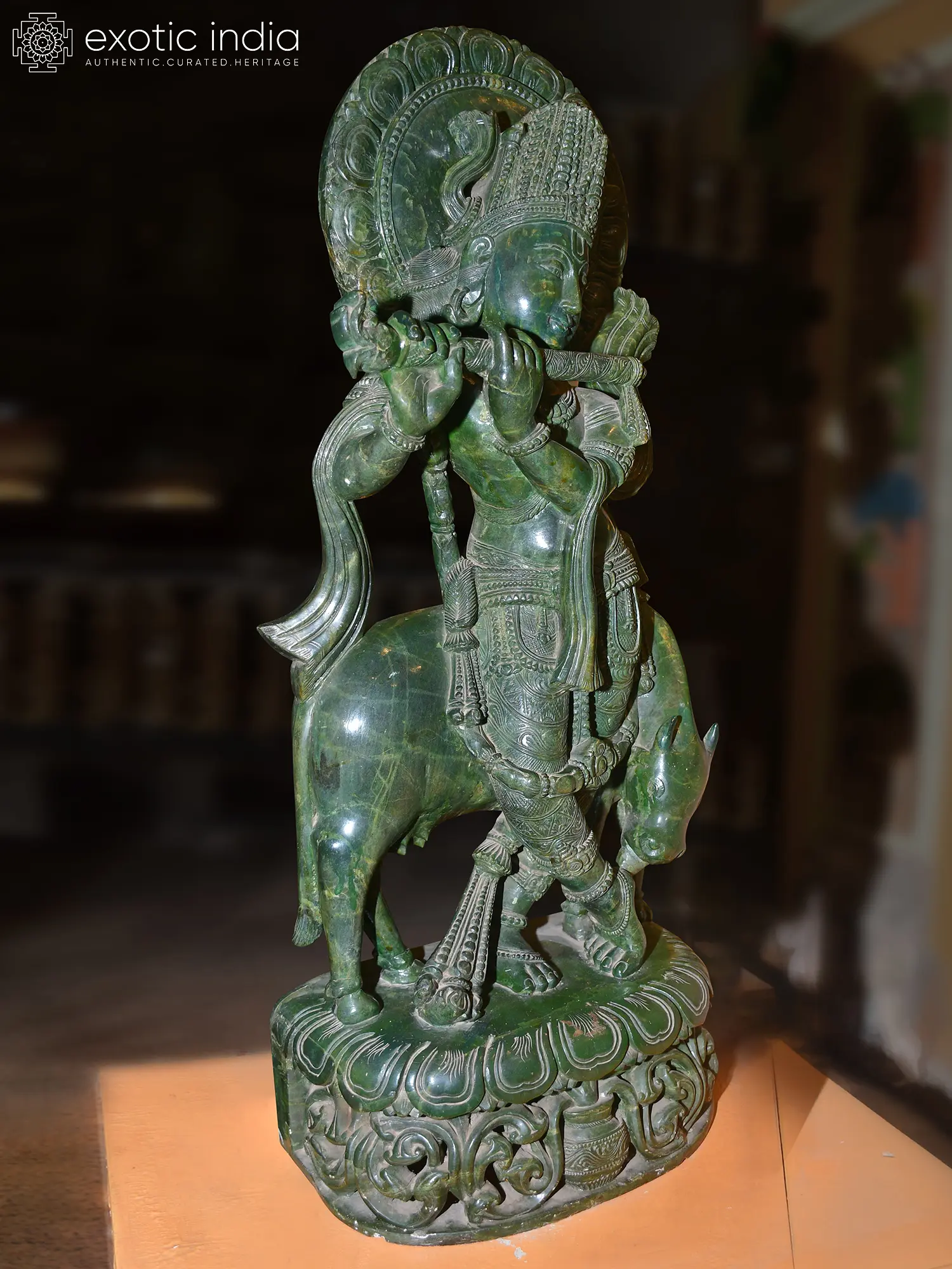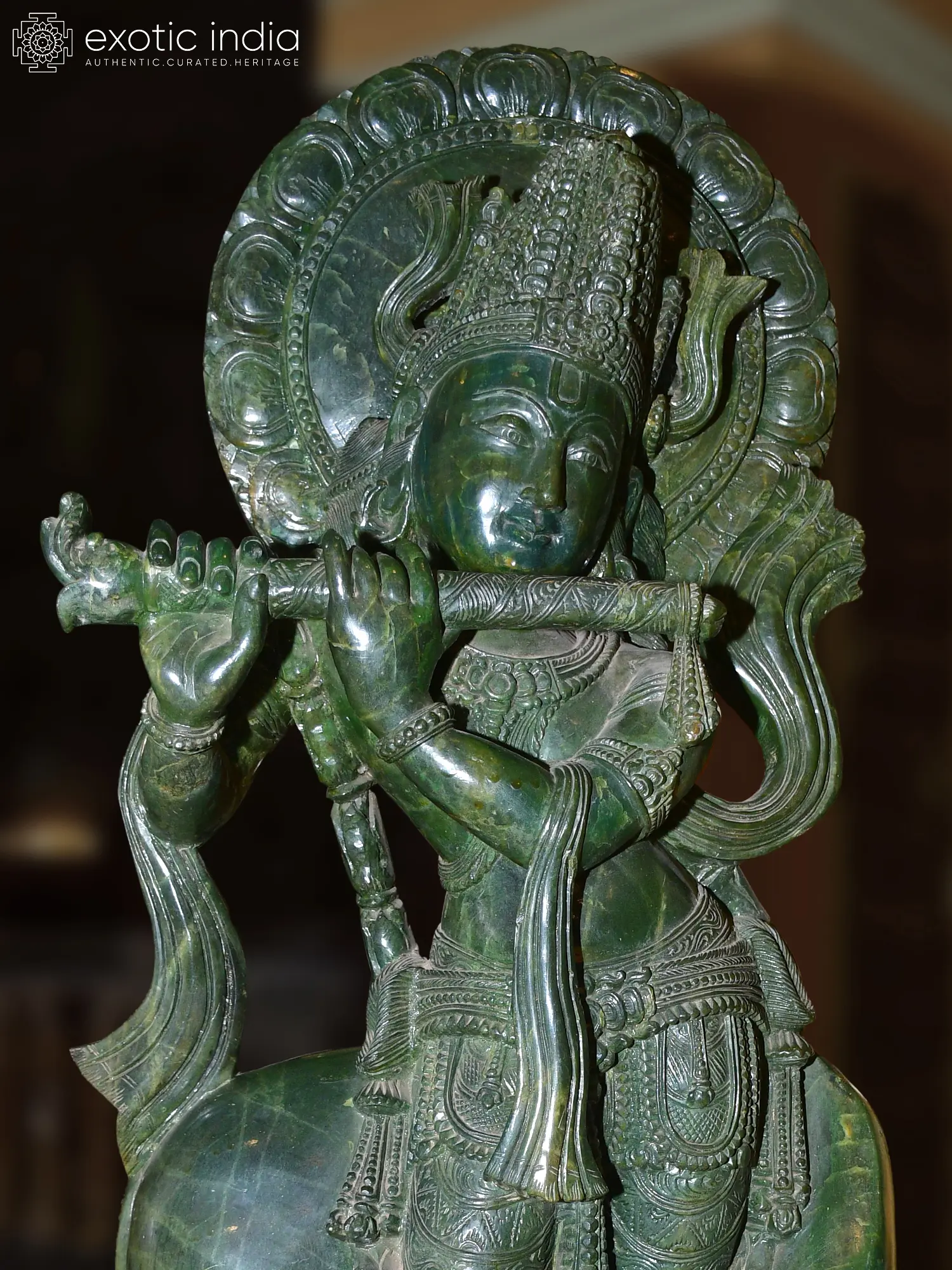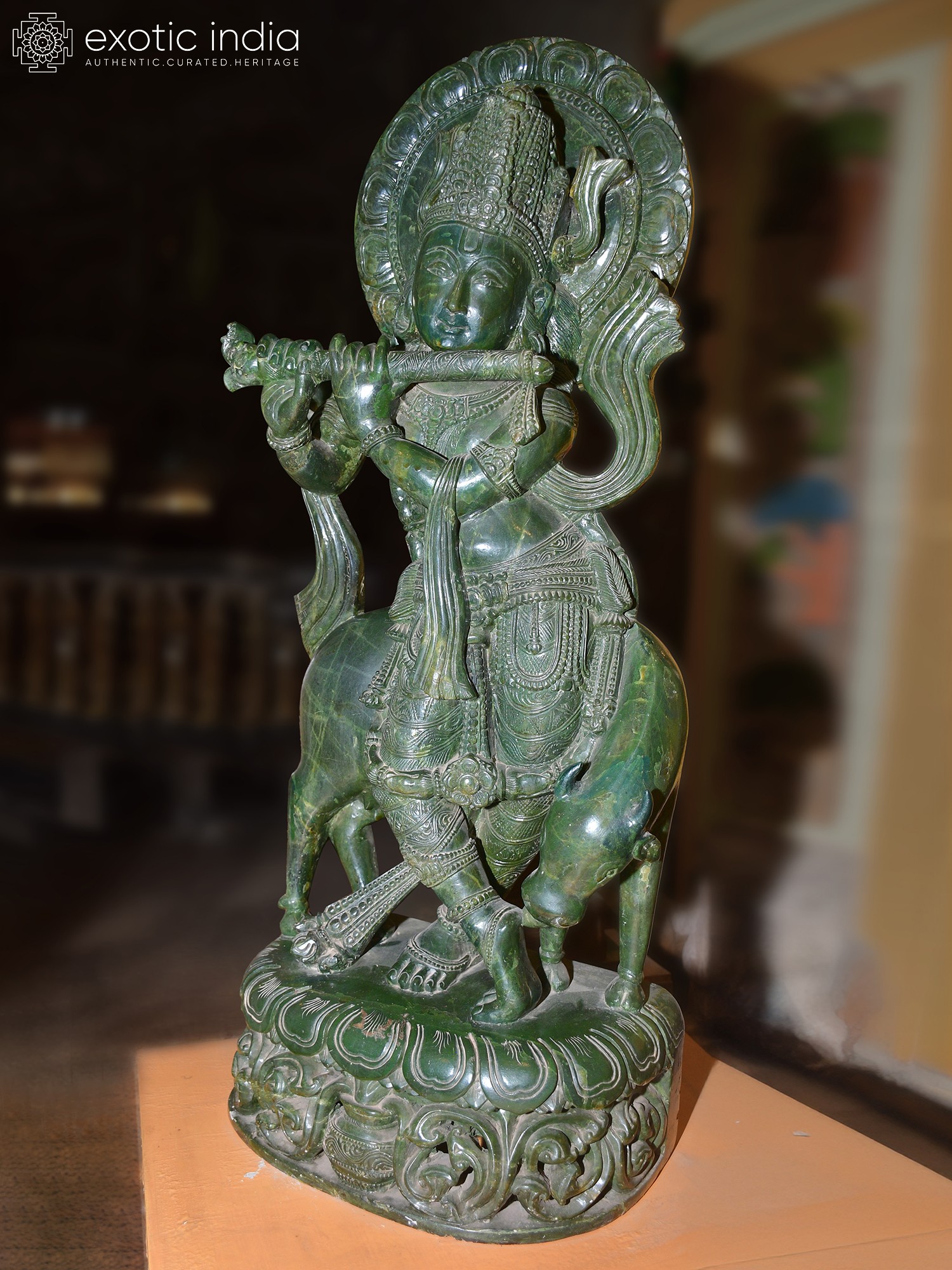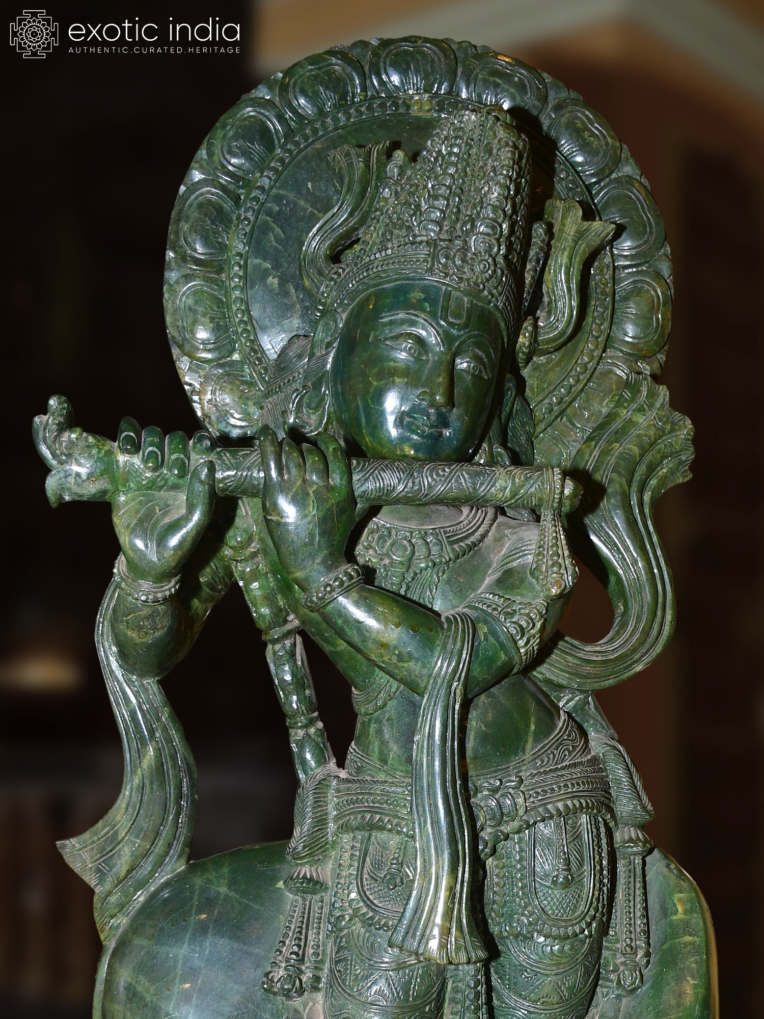 12" Dancing Lord Krishna Statue Playing Flute | Black Mahabalipuram Stone