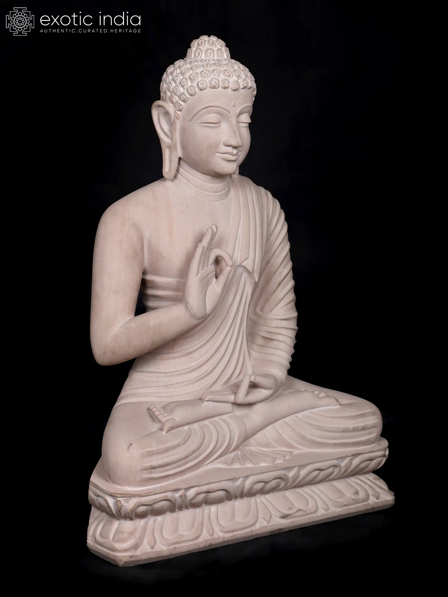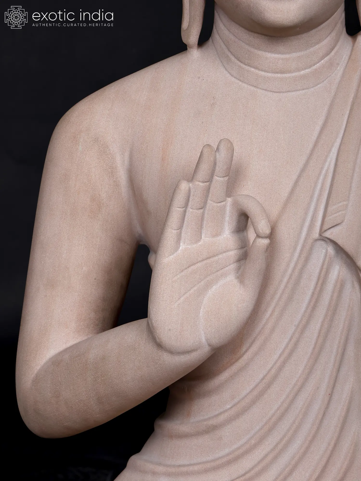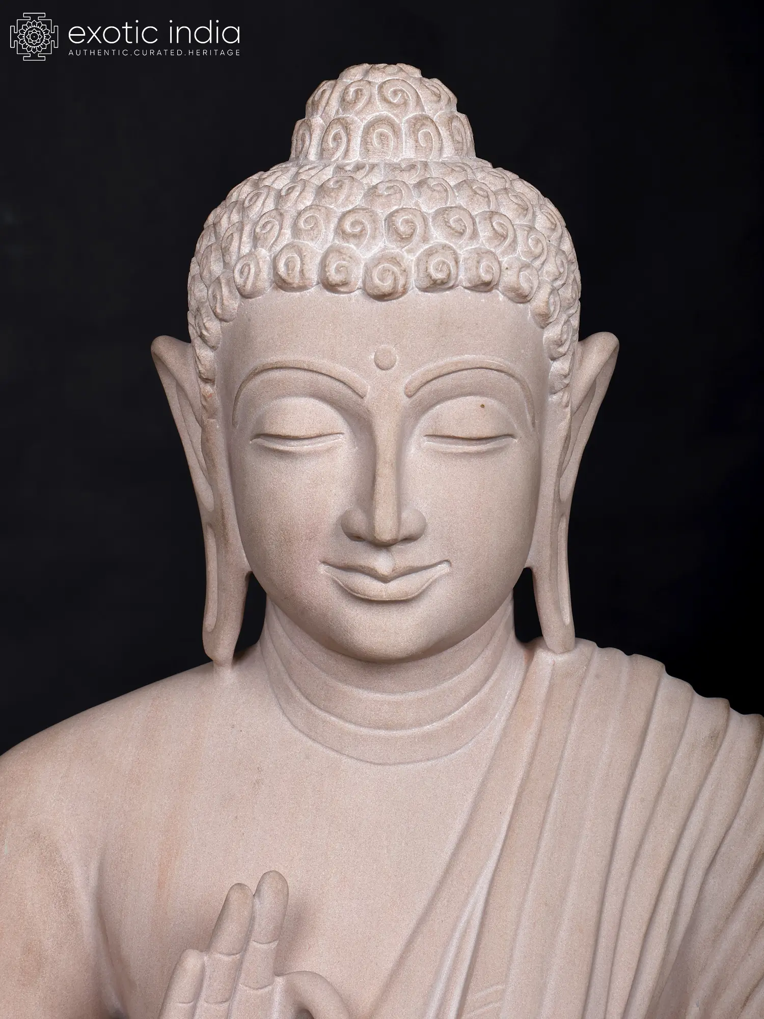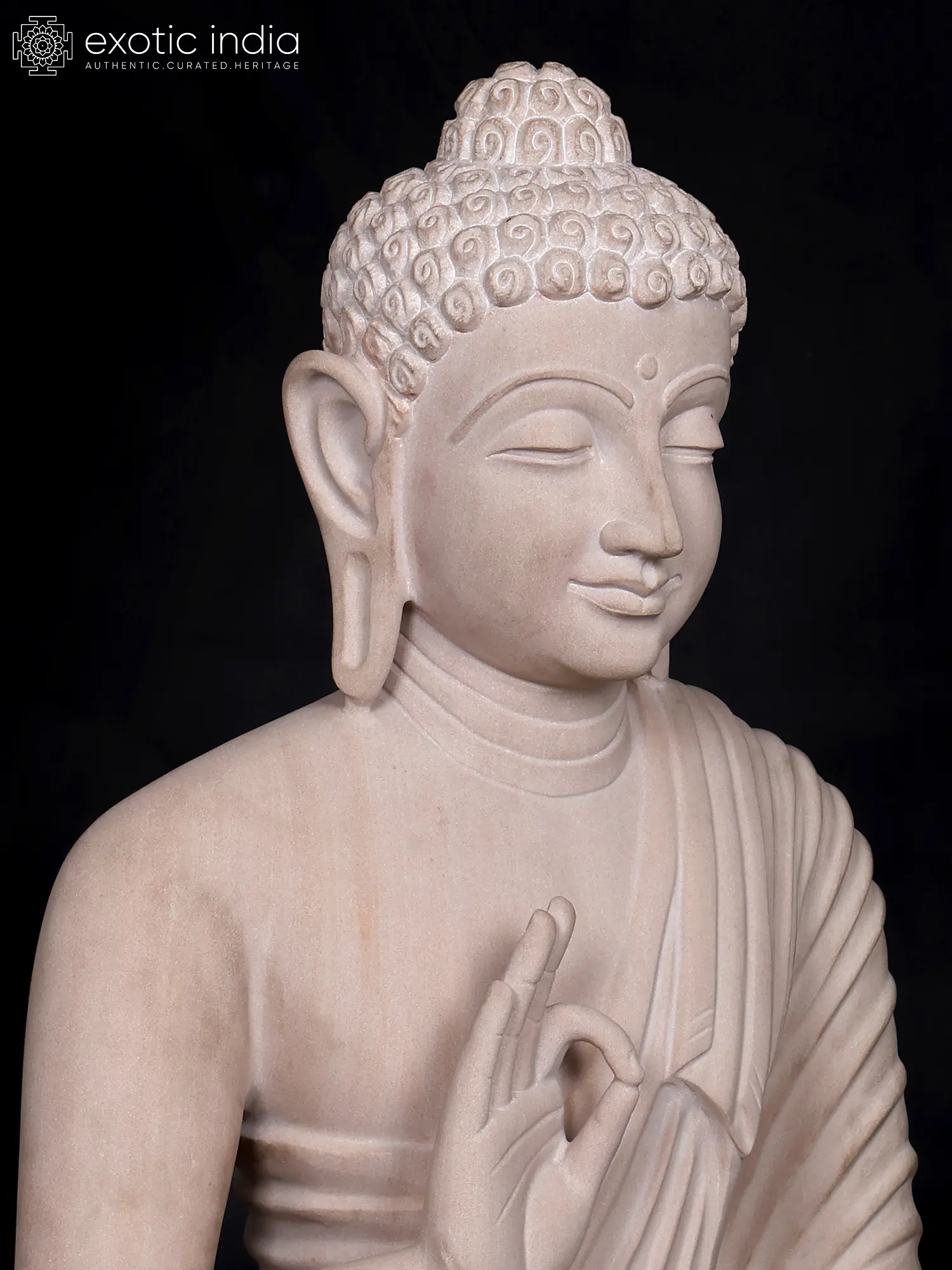 Observe the gentle closure of the eyes, suggesting an inward journey of profound meditation. The hands are raised in the Vitarka Mudra, a gesture signifying the imparting of knowledge and the turning of the Dharma wheel, representing the Buddha's teachings. The flowing robes are rendered with an artistry that captures the natural drape of fabric, adding a dynamic yet graceful quality to the figure. The detailed rendering of the urna, the curl of hair, and the serene facial expression all contribute to its captivating allure.