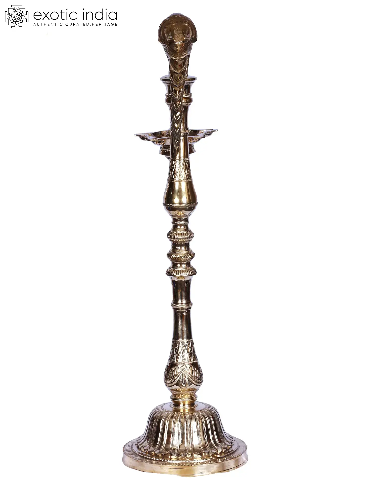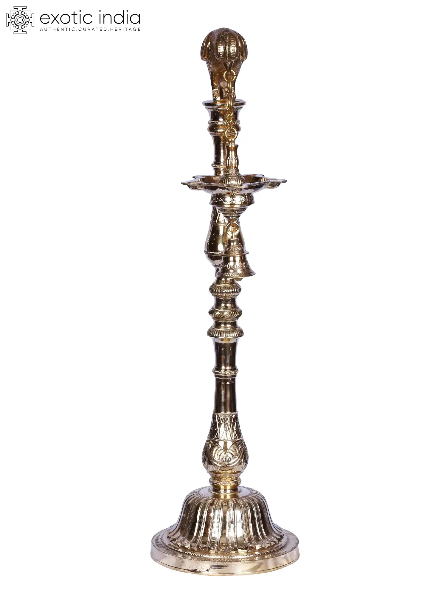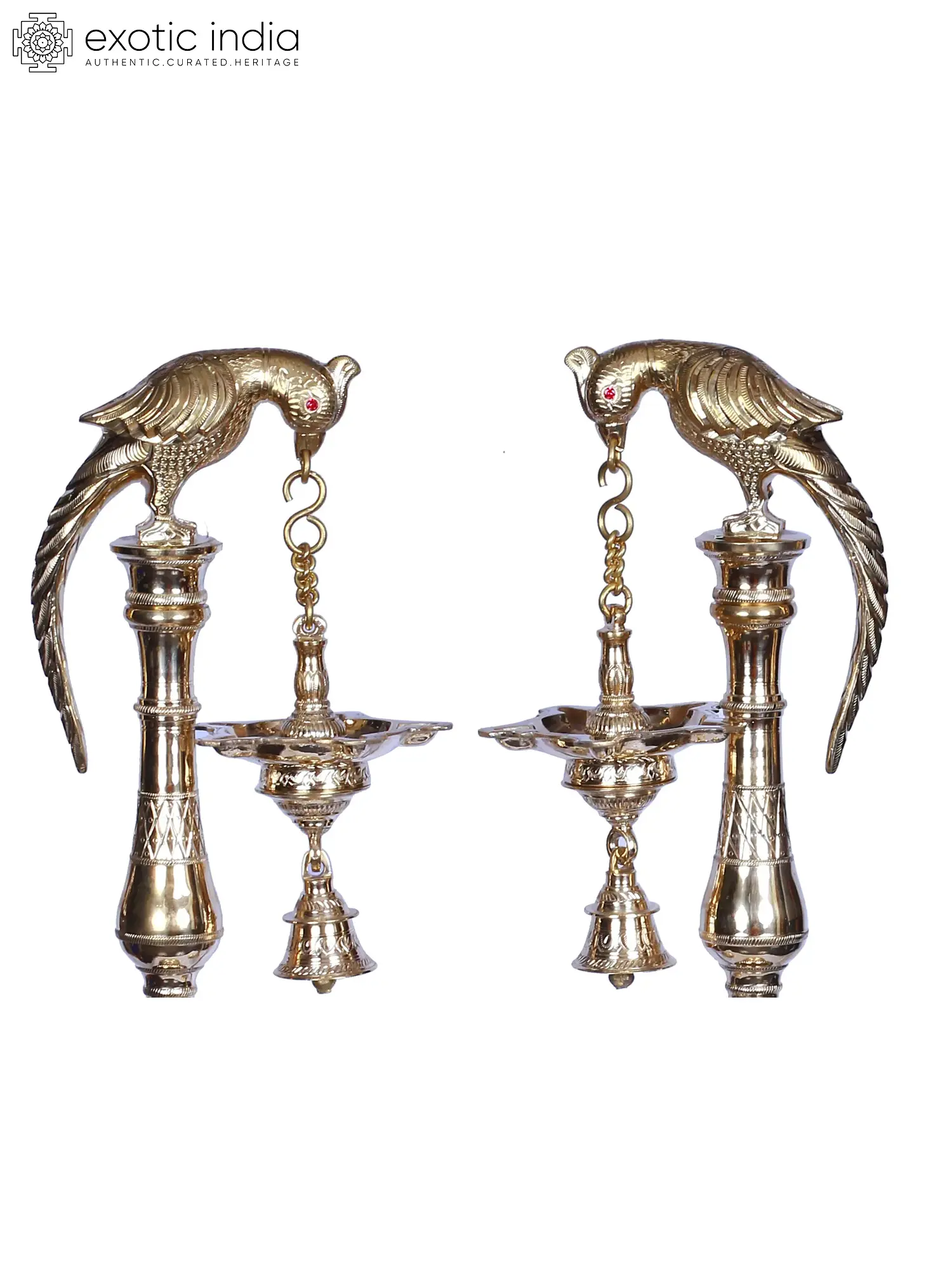 The parrot is linked to Kama and is a sign of fertility and expansion. This might be attributed to its green feathers and scarlet beak. The red beak represents the red dirt before rain, while the green feathers represent the green land after rain. Goddess Meenakshi is also shown with a Parrot on her fingers. The divinity of columnar lamps and hanging lights is combined in this combination of brass columnar lamps with Parrot motifs atop and hanging lamps.