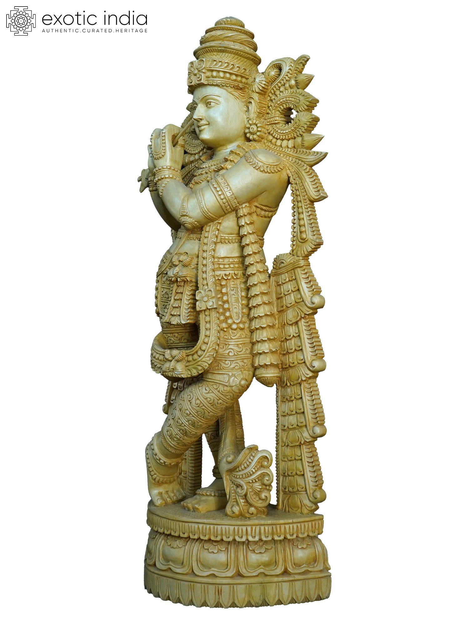 34" Large Lord Krishna Standing on Lotus Playing Flute | Wood Carved Statue