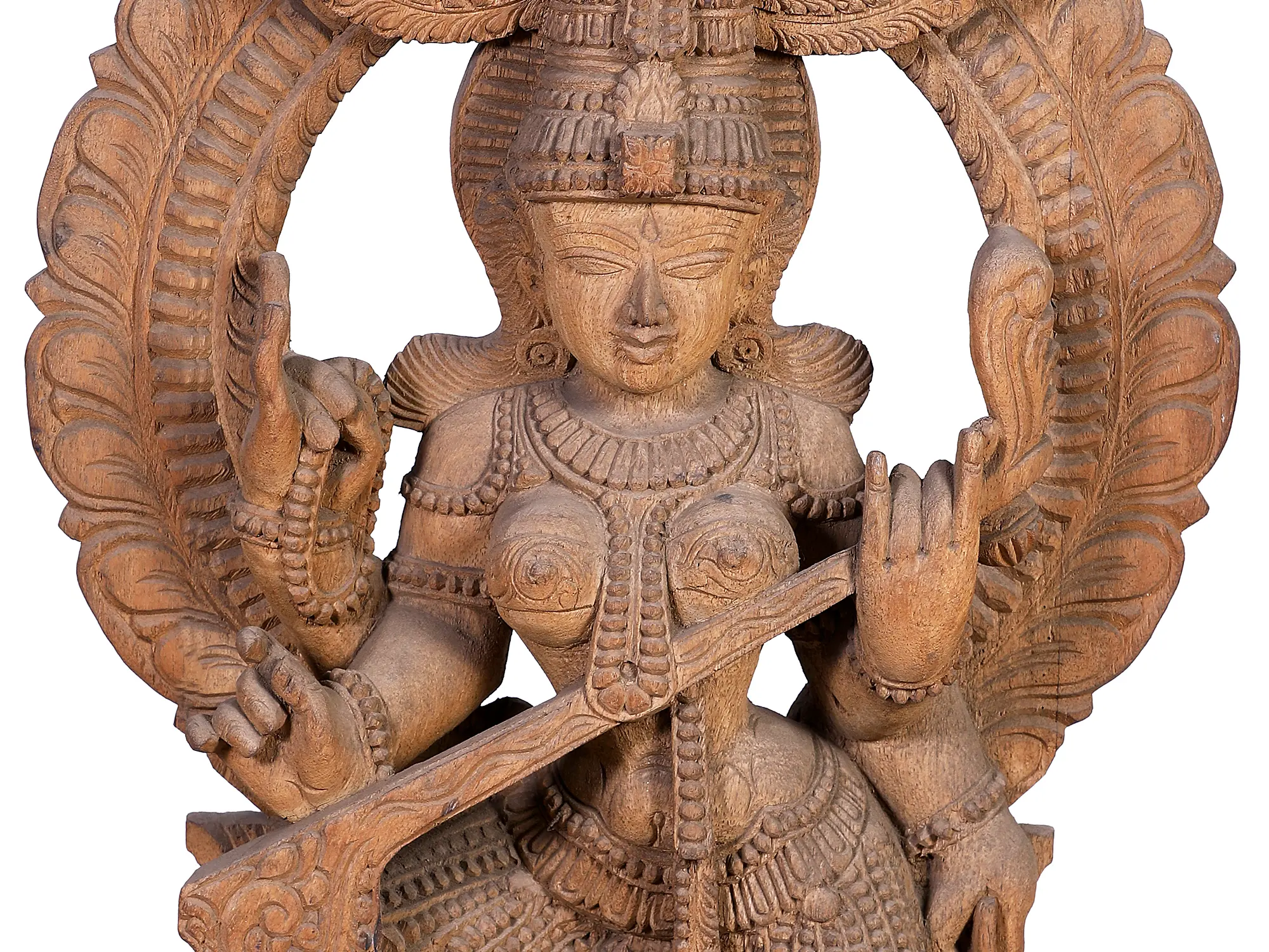 36" Large Devi Saraswati Seated on Lotus | Wood Carving