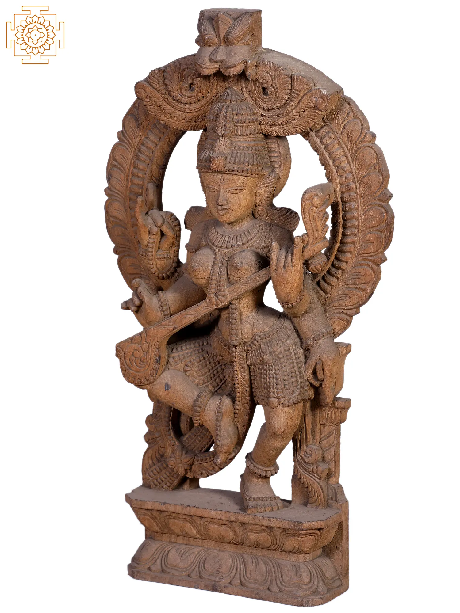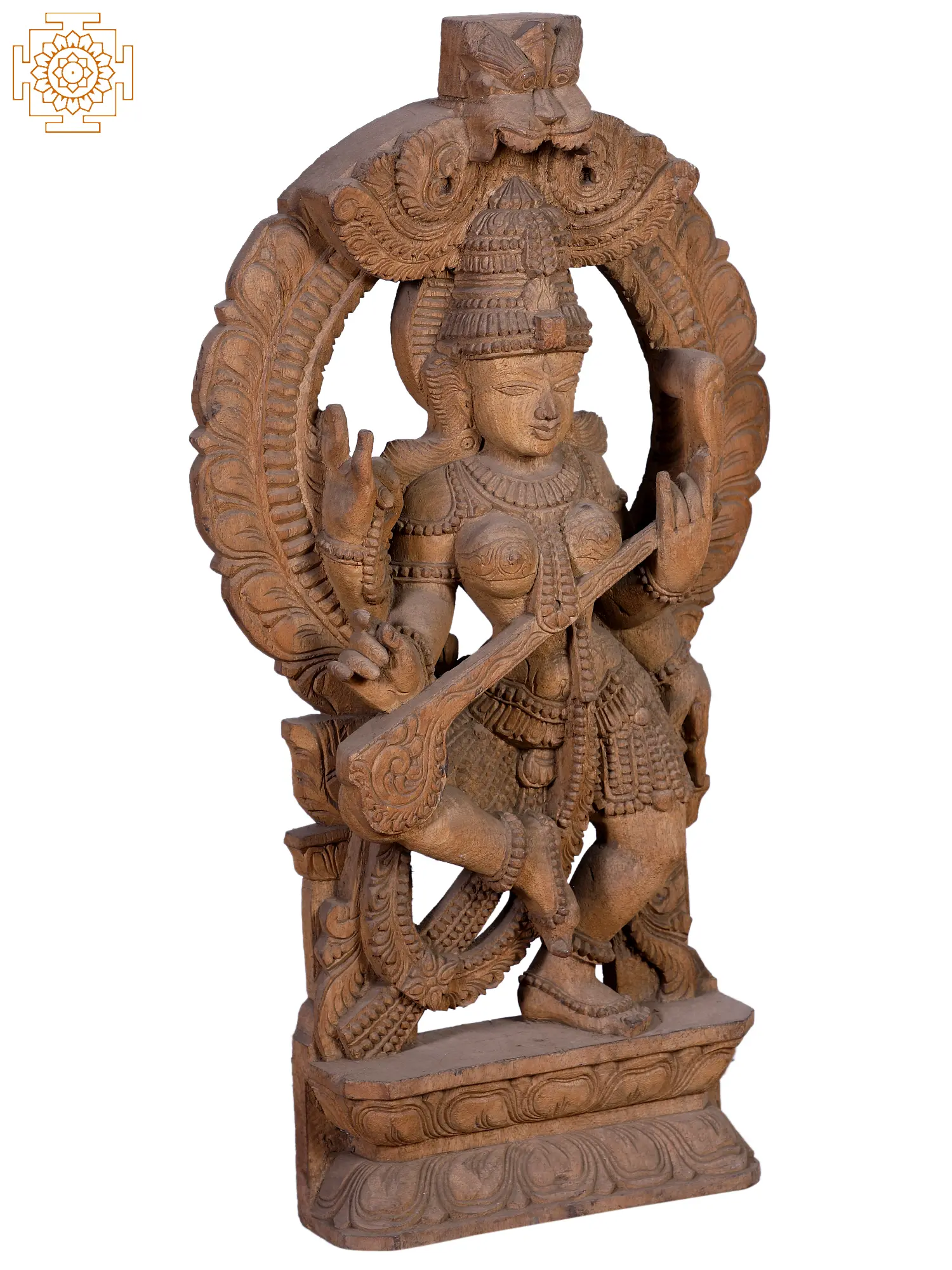 72" Dancing Goddess Saraswati with Kirtimukha Arch | Wood Carving