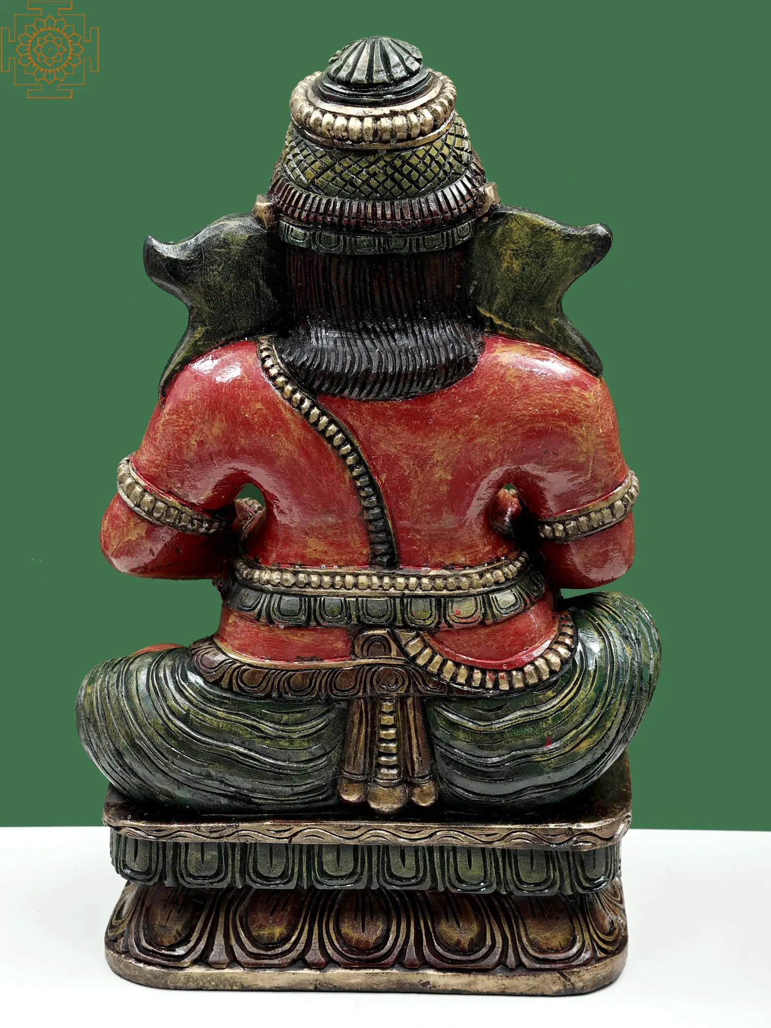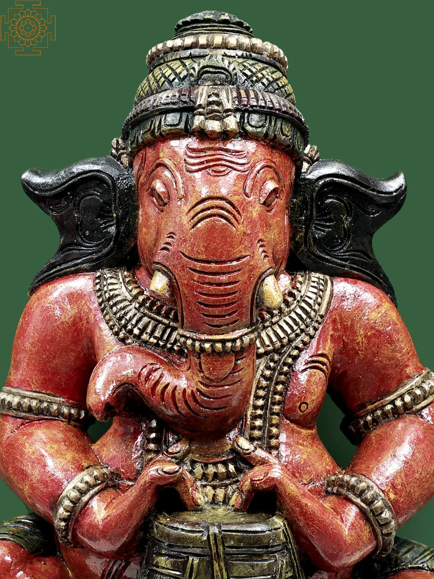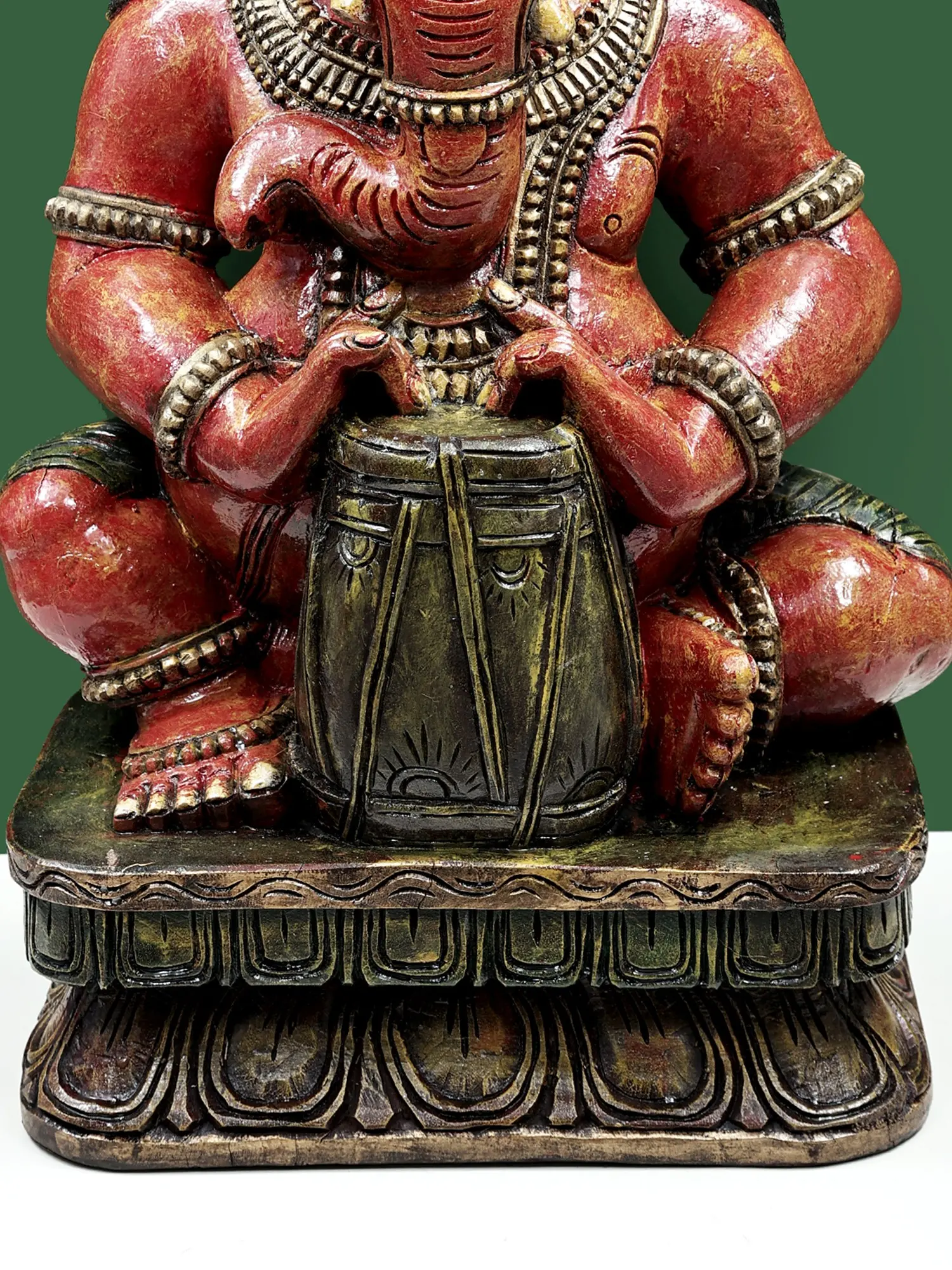 Vengai wood of Lord Ganesha playing the drum is unusual from its many forms. Vengai wood is revered in South Asia because it is known as God's wood. Ganesha is enjoying the cadence of the drum instead of sitting in lalitasana. Take note of the gleaming effect and shiny finish of Vengai. Juniper green and amber-orange polishing elevate the tonality of Ganesha statue. This handcrafted wood Ganesha would look lovely in the foyer of your home or music institution.