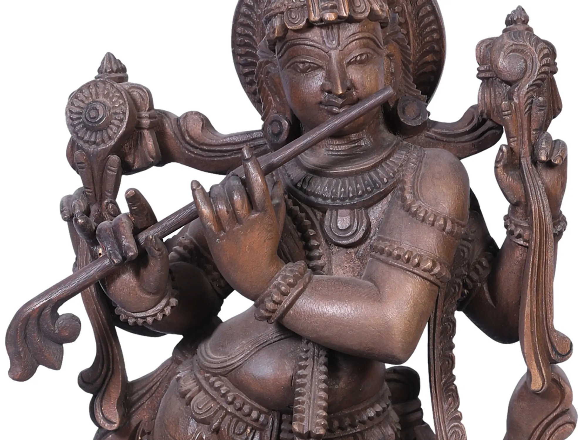 Behold the divine symphony of Lord Krishna in this hand-carved wooden masterpiece. Carved with meticulous devotion, the sculpture captures the essence of Krishna, his Tribhanga stance exuding grace and boundless energy.