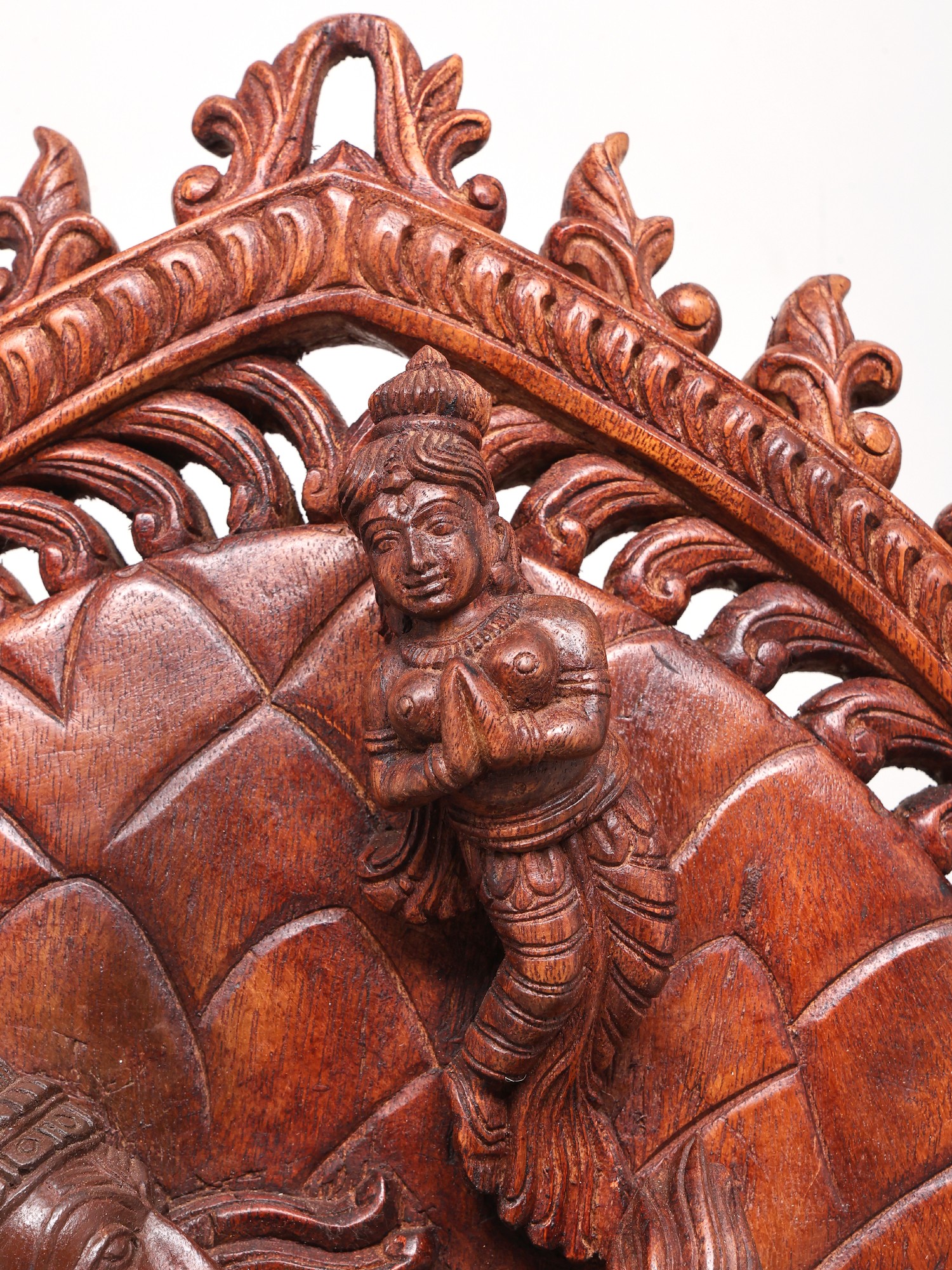 Carved from rich, deep-hued wood, this piece is a testament to the skill of traditional artisans. Every detail, from the intricate jewelry adorning Shiva's form to the expressions on the faces of the surrounding figures, is rendered with remarkable precision. Shiva's posture, with one hand raised and the other perhaps grasping a weapon or in a protective gesture, conveys both his power and his willingness to bear the immense force of the river. Beneath Shiva, a bull, Nandi, Shiva's celestial vehicle, is subtly depicted, a symbol of dharma and steadfast devotion. Around Shiva, smaller figures are sculpted, representing the sage Bhagiratha in his supplication, and perhaps other celestial beings or the grieving sons of Sagara, witnessing the miraculous event. The elaborate arch framing the central scene, adorned with intricate floral motifs and foliate designs, adds to the regal and sacred aura of the artwork. The base of the sculpture is equally detailed, featuring divine visages and decorative elements that further enhance its artistic and spiritual value. This wooden creation is not merely a decorative object but a powerful narrative in three dimensions, inviting contemplation of divine intervention, cosmic balance, and the purifying power of sacred waters.