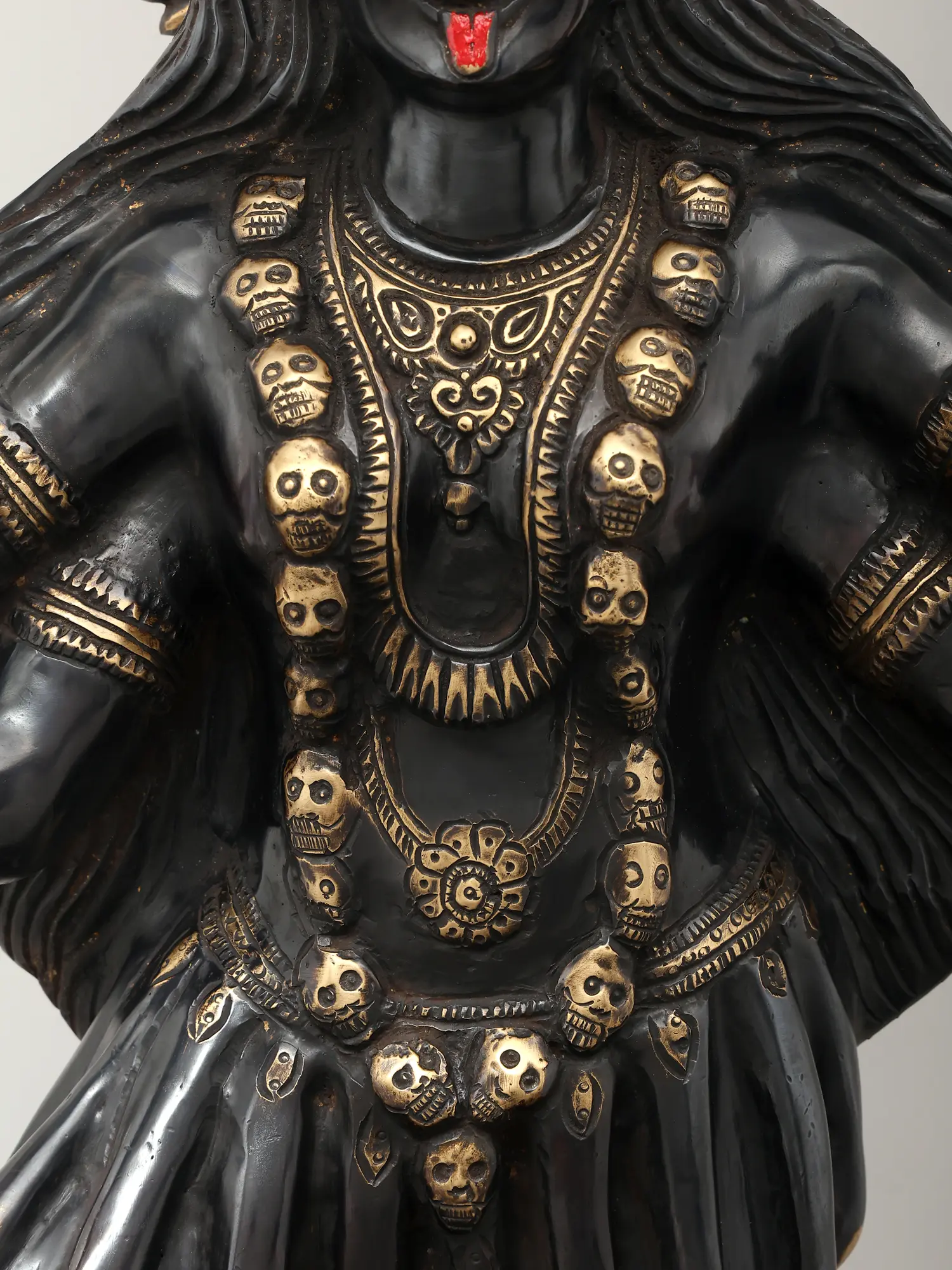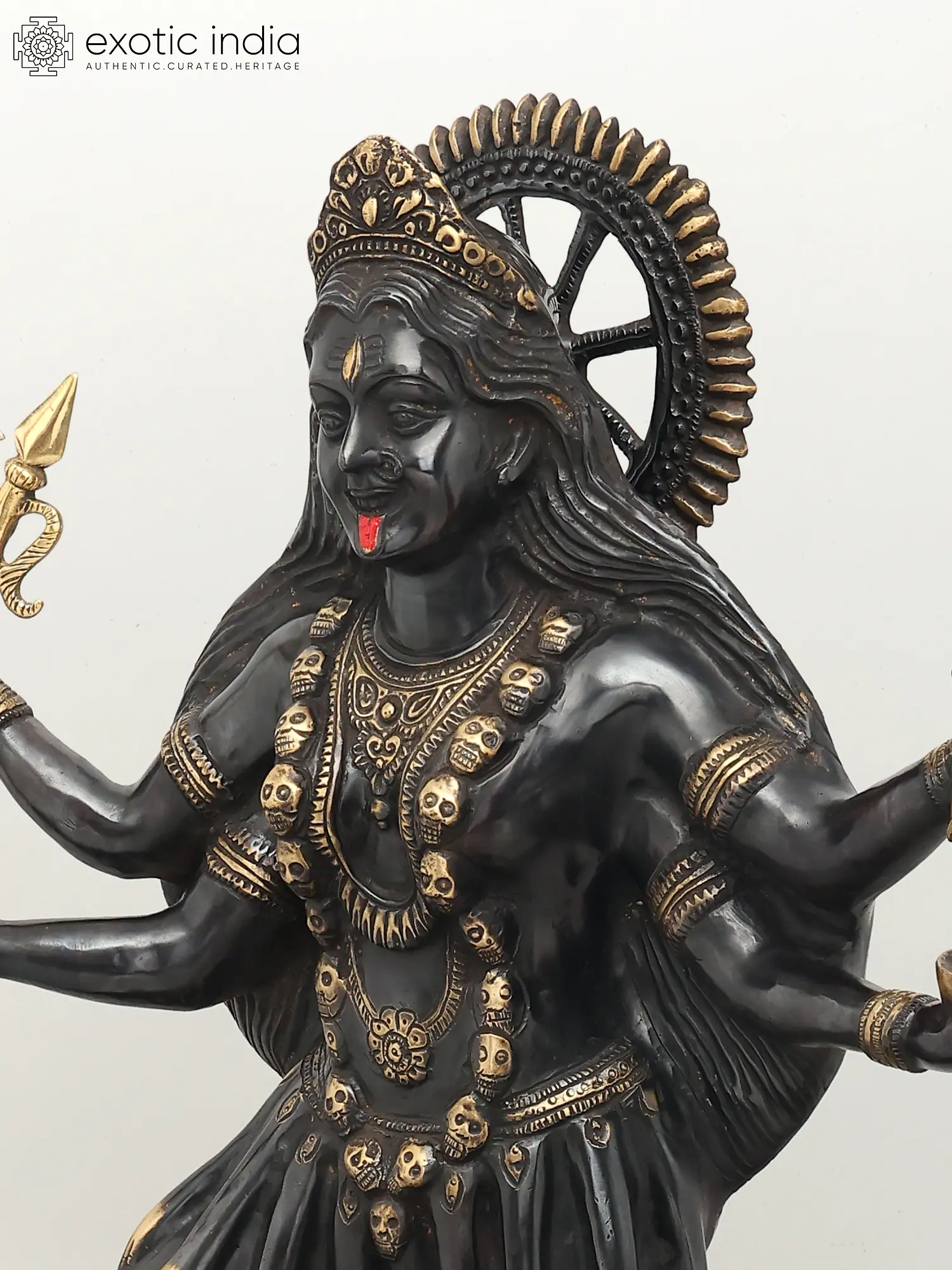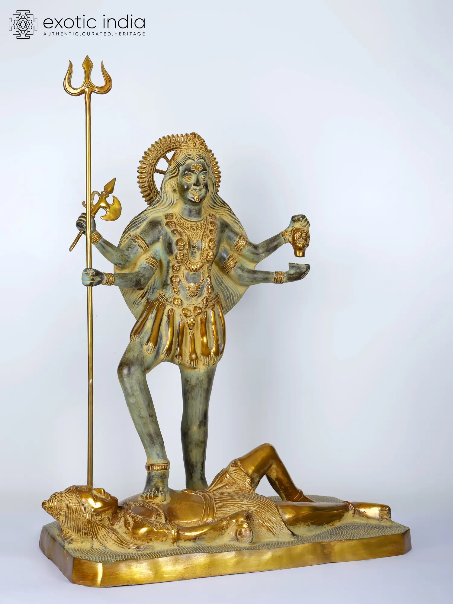 This Large Goddess Kali Standing on Lord Shiva statue is made of brass. It depicts Goddess Kali in the Chaturbhuj form. Chaturbhuj Kali is a fierce manifestation of Goddess Kali and is depicted with potent symbolism in Hindu iconography. With two hands holding an axe and Trishul (trident), she signifies the destruction of ignorance and evil forces. In her third hand, she holds a severed head, symbolizing the triumph over ego and negativity.