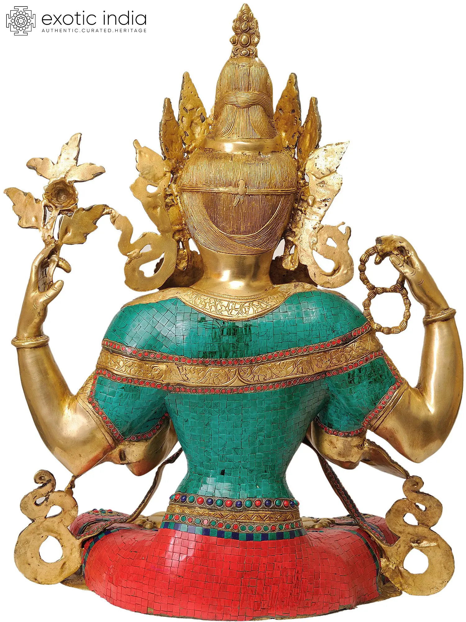 This smooth, richly inlaid brass sculpture from the Exotic India collection brings out the harmony and compassion Lord Chenrezig stands for.