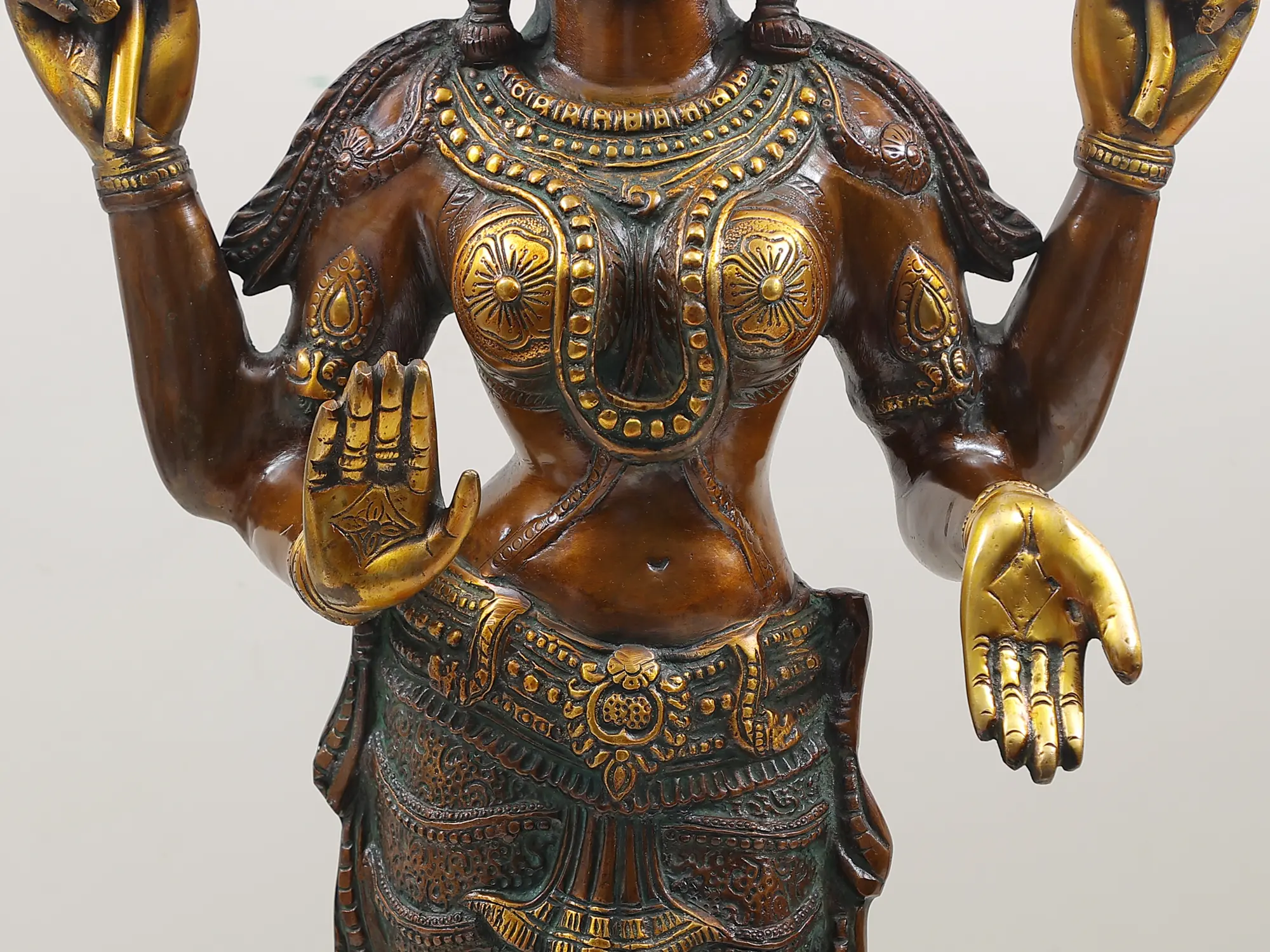 Invite the divine presence of abundance and good fortune into your home with this magnificent four-armed standing Goddess Lakshmi brass statue. Standing at an impressive 31 inches, this commanding sculpture captures the essence of the Hindu goddess of wealth, prosperity, and auspiciousness. Crafted from high-quality brass, the statue exhibits a rich, warm patina that speaks to its enduring beauty and the meticulous artistry involved in its creation.