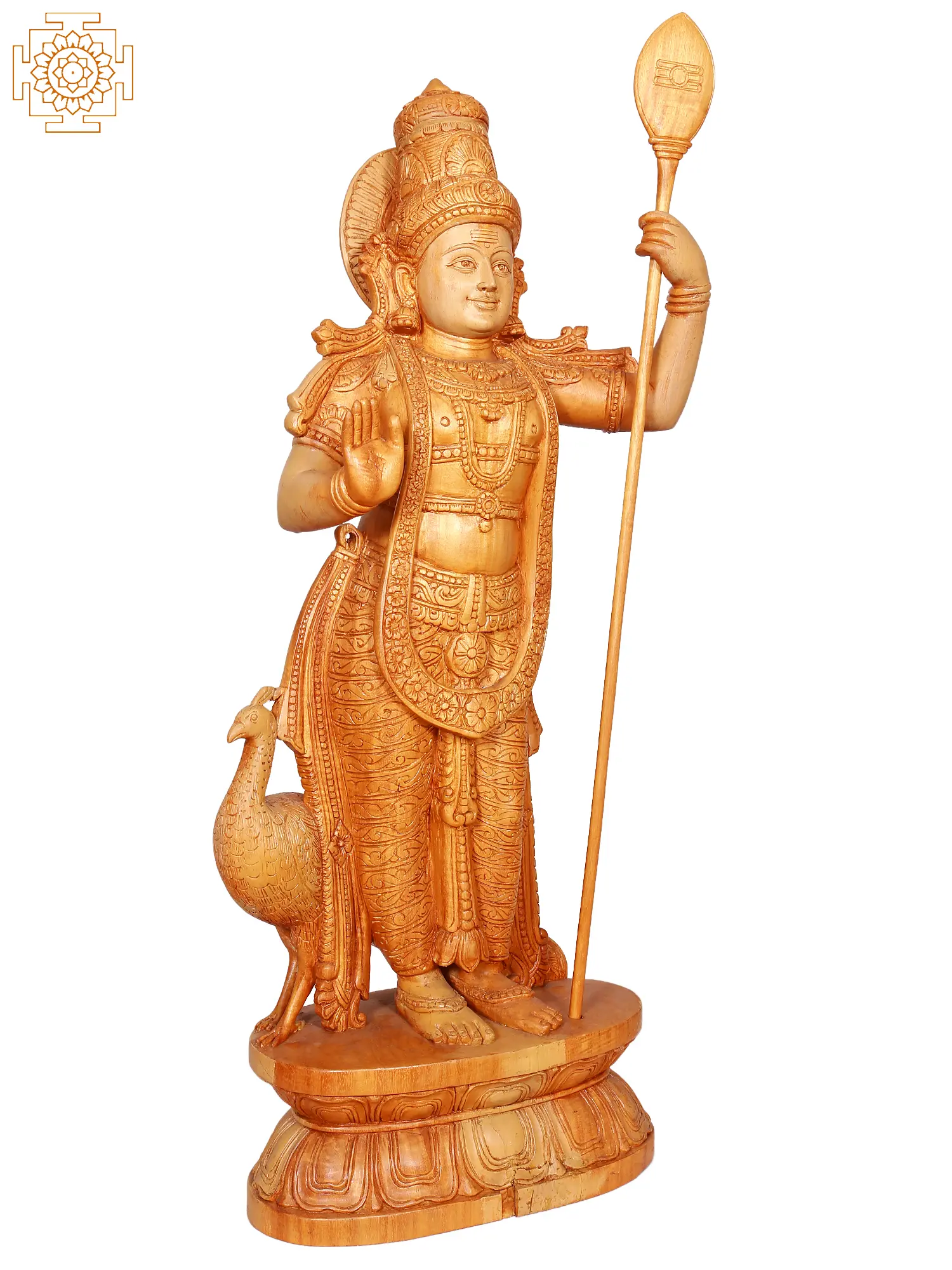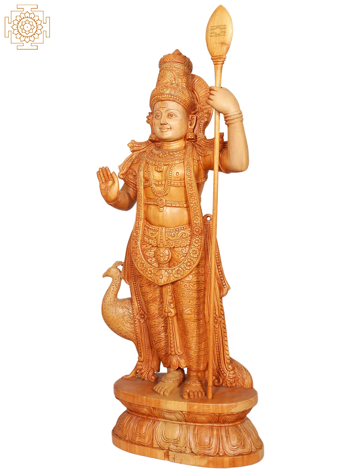 Invite the divine presence of Lord Kartikeya, also known as Murugan, Skanda, or Subrahmanya, into your home with this magnificent, large standing wooden statue. Standing at an impressive height, this idol is a testament to the artistry of South Indian craftsmanship, carved from high-quality wood with meticulous attention to detail. The warm, natural tones of the wood enhance the divine aura of the deity, making it a captivating centerpiece for any spiritual space, altar, or living area. Lord Kartikeya, the commander-in-chief of the celestial armies and the son of Lord Shiva and Goddess Parvati, is a revered deity in Hinduism, particularly in South India. He is worshipped as the god of war, victory, wisdom, and protection. Legends speak of his divine birth and his heroic feats in battling demons, thus safeguarding the cosmos. His iconography often features him adorned with regal attire, holding his divine spear, the Vel, and accompanied by his vahanam, the peacock. This statue beautifully captures these traditional attributes, exuding an aura of strength, courage, and divine grace. ––––––––––