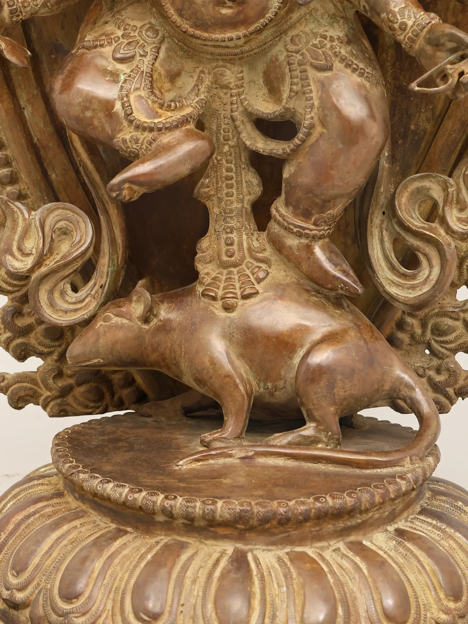 Ganesha’s form is caught mid-dance, one leg lifted while the other presses firmly upon the mouse, transforming his vahana into a rhythmic partner rather than a passive base. The energy of the dance radiates outward into the elaborate prabhavali, whose flame-like scrolls and layered forms create a vibrant halo of motion and auspicious force.