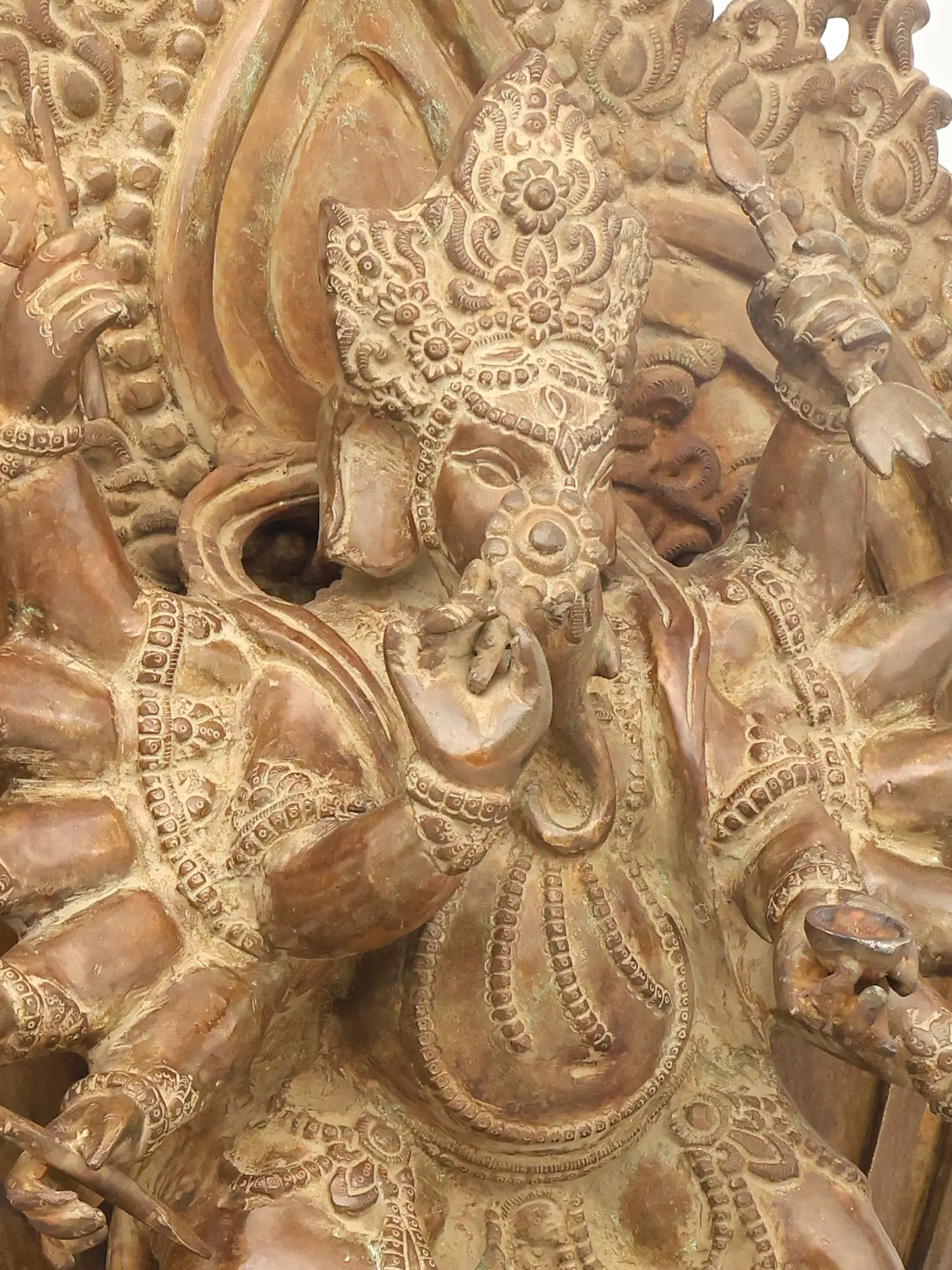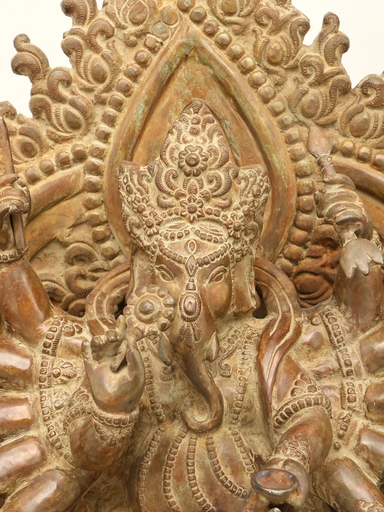 In his twelve arms, Ganesha holds an extraordinary range of attributes, including the dorje (vajra), sword, axe, drum, fly whisk, bow, arrow, staff, and skull cup, combining tantric symbolism with martial and ritual implements. Together, these objects express his dominion over both worldly obstacles and inner transformation, aligning him with esoteric Himalayan interpretations of the deity.