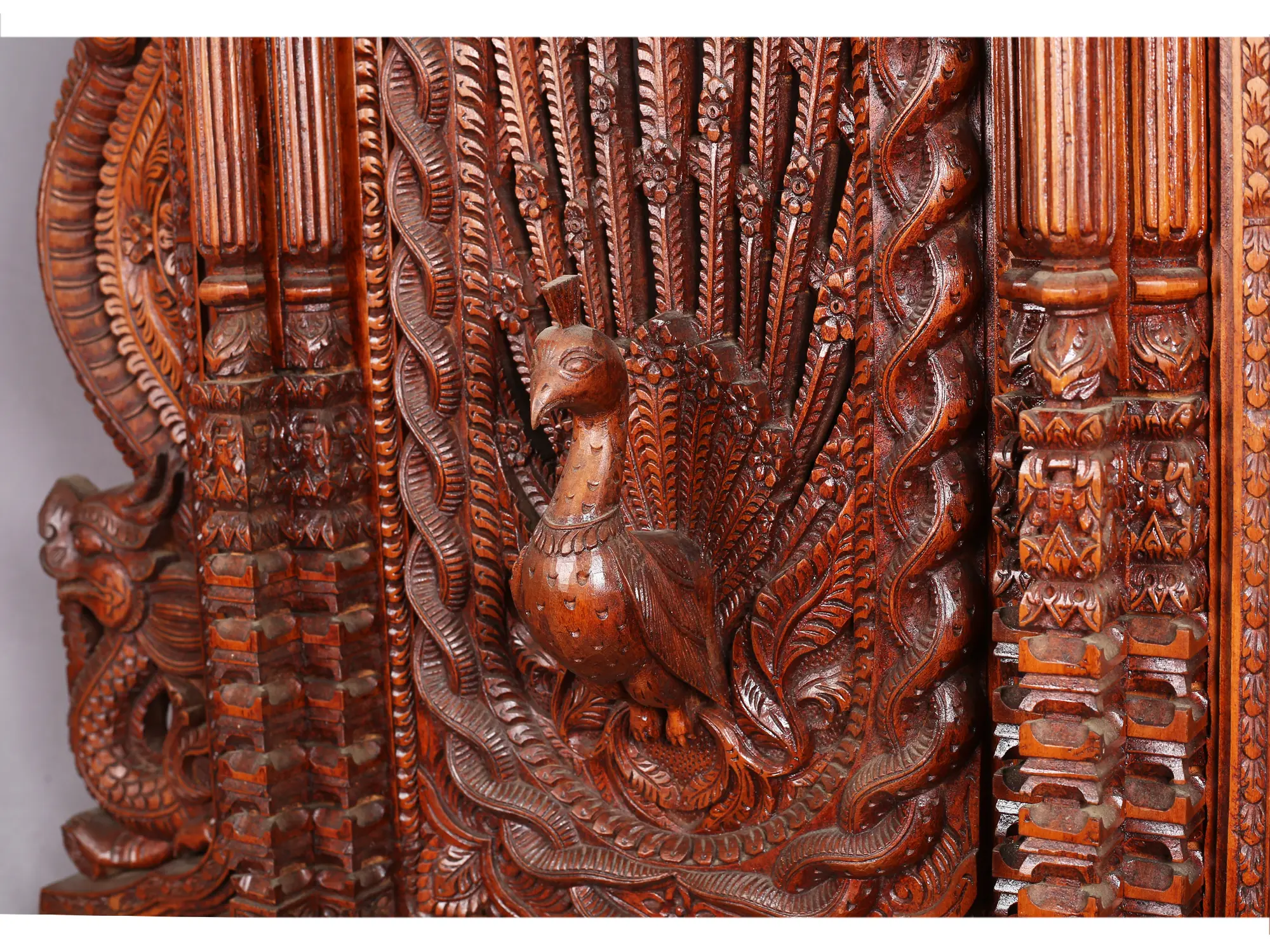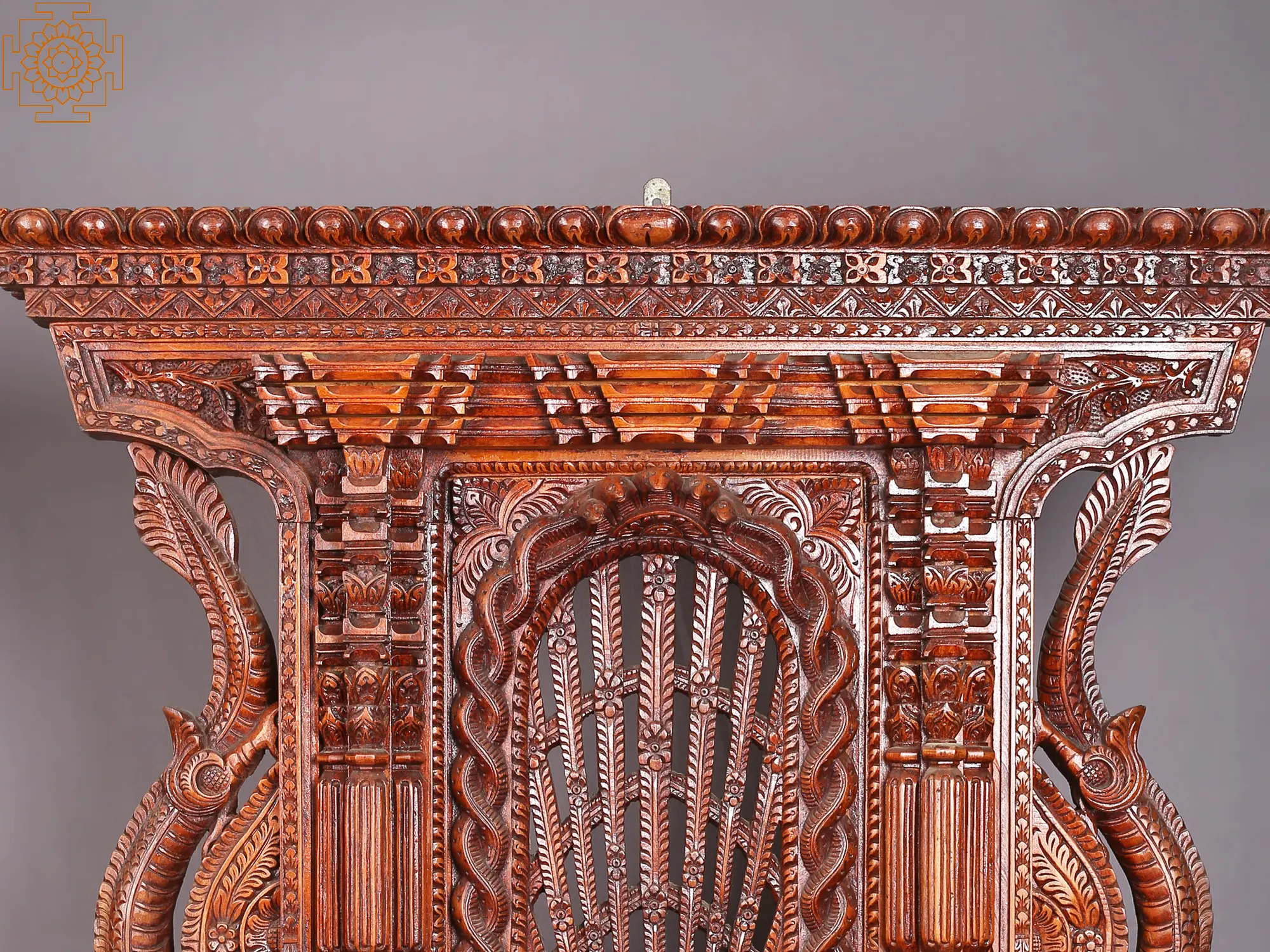 Step into a realm of exquisite artistry and profound symbolism with this magnificent wooden masterpiece, a testament to the rich heritage of Nepalese craftsmanship. This intricately carved piece, a functional window or a decorative statement, brings the sacred into your living space, echoing the grandeur of ancient temples and mandalas. The central motif is a resplendent peacock, a creature revered across many cultures for its beauty, immortality, and grace. In Hindu mythology, the peacock is associated with several deities. It is the vehicle of Lord Kartikeya, the god of war, and is often depicted with him, symbolizing his divine power and beauty. The peacock's iridescent plumage is said to represent the eyes of God, seeing all things. In Buddhism, the peacock symbolizes wisdom and compassion. Its ability to eat poisonous snakes without being harmed signifies overcoming negative influences and attaining spiritual enlightenment. This beautifully rendered peacock, perched with its fan-like tail fanned out, evokes a sense of serenity and divine presence. Flanking the central scene, and adorning the corners, are two fearsome yet magnificent dragons. In East Asian cultures, dragons are benevolent beings, powerful symbols of strength, good fortune, wisdom, and protection. They are often depicted as celestial guardians, controlling the weather and bringing rain, essential for life and prosperity. These dragons, with their coiled bodies and powerful snouts, are carved with an incredible attention to detail, their scales and musculature appearing almost alive. They serve as fierce protectors, warding off negativity and inviting positive energy, much like the guardian deities found at the entrance of sacred spaces in Nepal. The integration of the peacock and dragons creates a harmonious balance of beauty and power, spirituality and earthly protection. The entire structure is framed by a breathtaking display of ornate carvings. The top of the piece features a delicate frieze of repeating floral and geometric patterns, a hallmark of traditional woodworking. The pillars leading down to the dragons showcase elaborate tiers and decorative elements, hinting at the architectural styles of Himalayan monasteries and palaces. The base is similarly adorned with detailed motifs, grounding the piece with a sense of stability and enduring artistry. The craftsmanship is truly exceptional, with every curve and detail meticulously shaped from solid wood, showcasing the skill and dedication of generations of artisans. This piece transcends mere decoration; it is a portal to a world steeped in myth, spirituality, and artistic mastery. Imagine it gracing a living room, a meditation space, or even as a unique entryway, inviting admiration and contemplation. It is more than just a window; it is a narrative carved in wood, a guardian for your home, and a timeless piece of art that will enrich your surroundings with its profound beauty and symbolic depth.