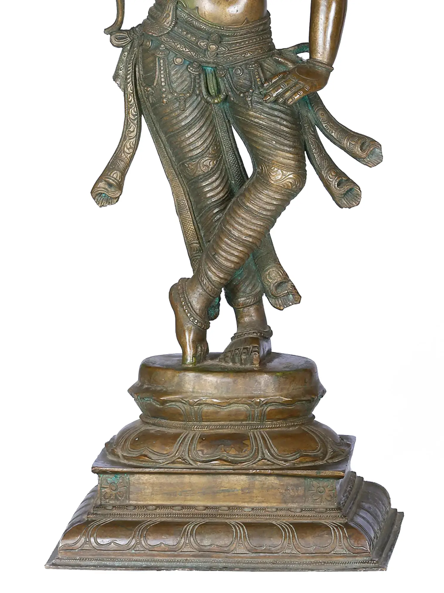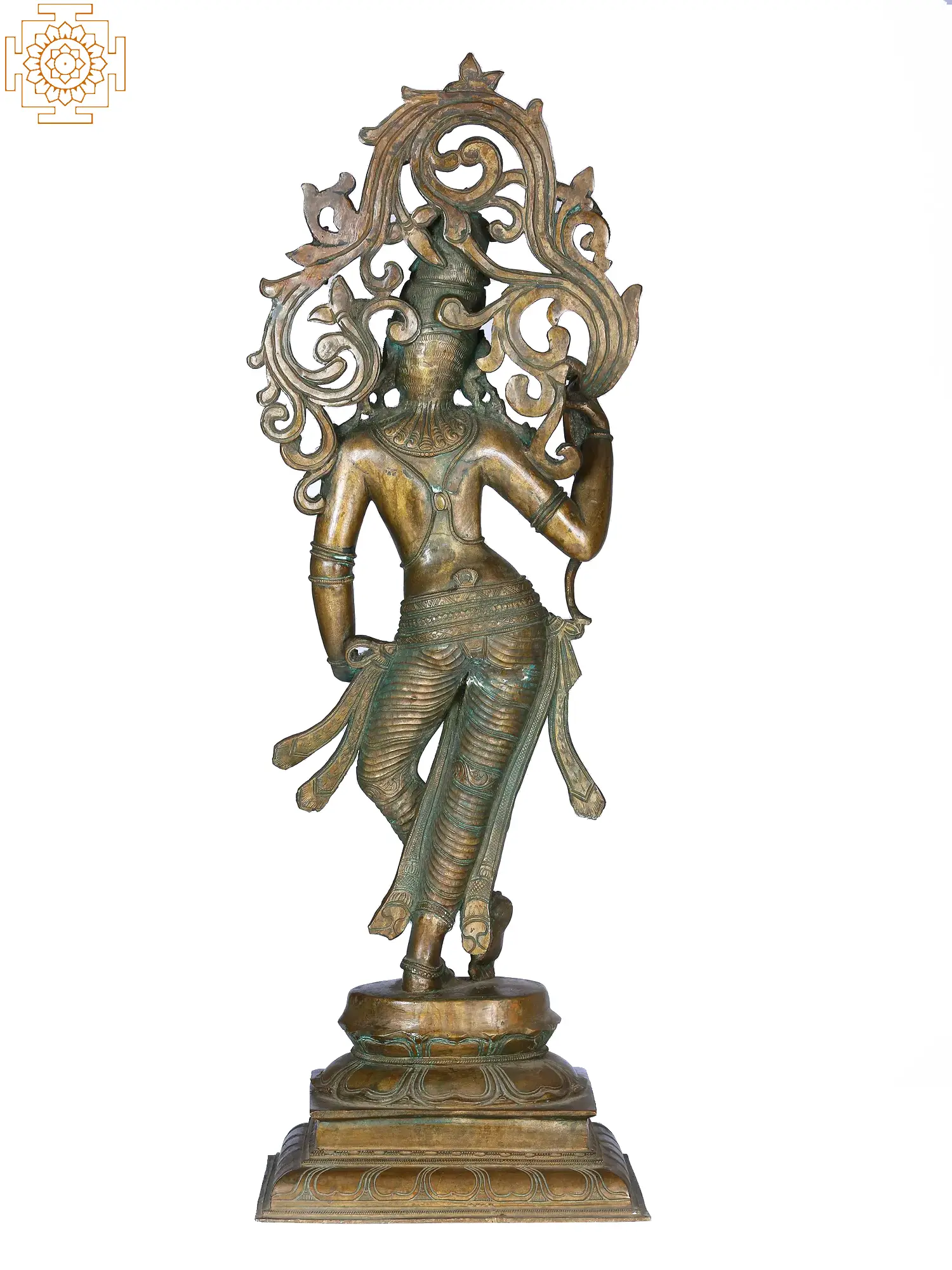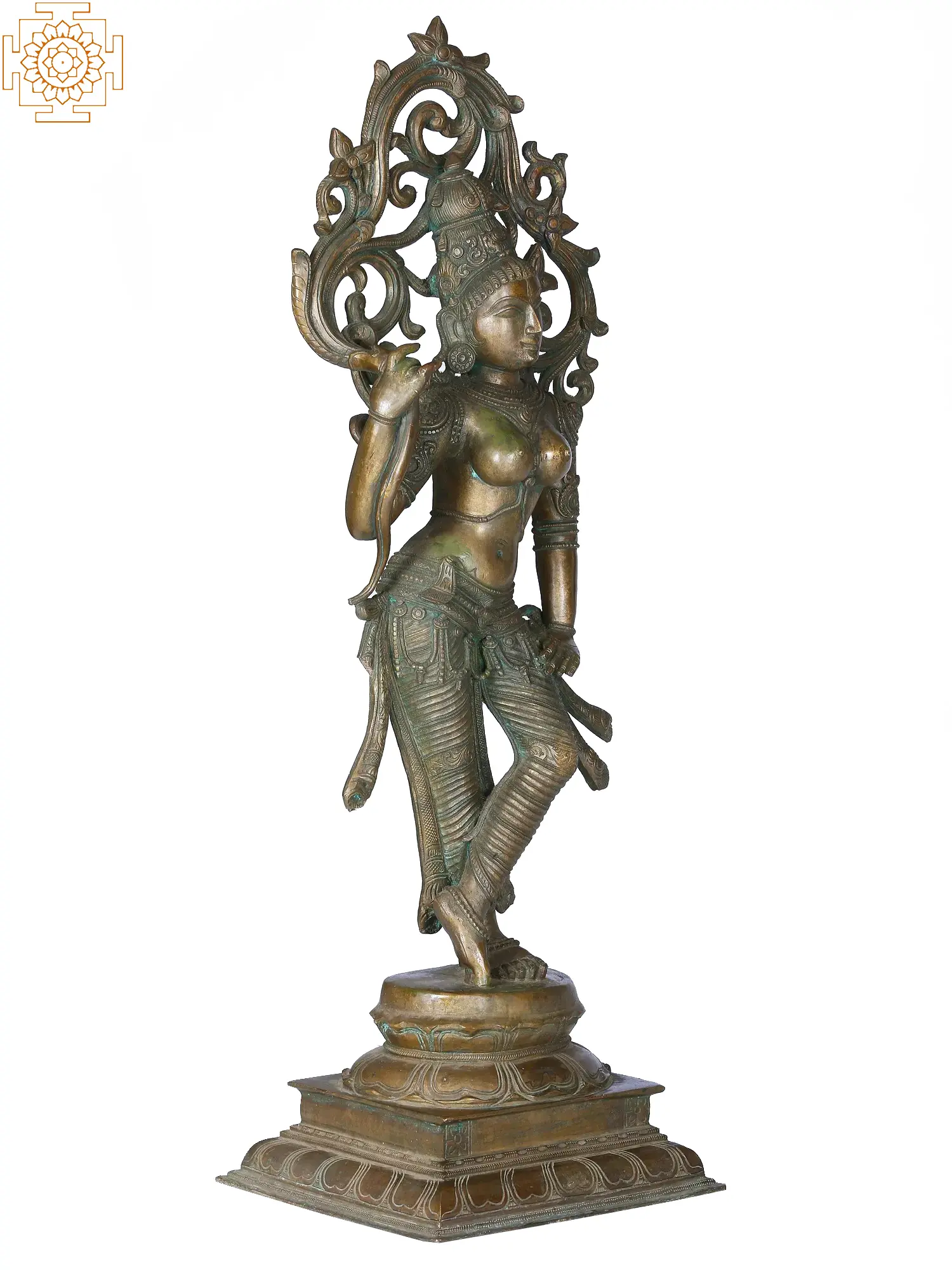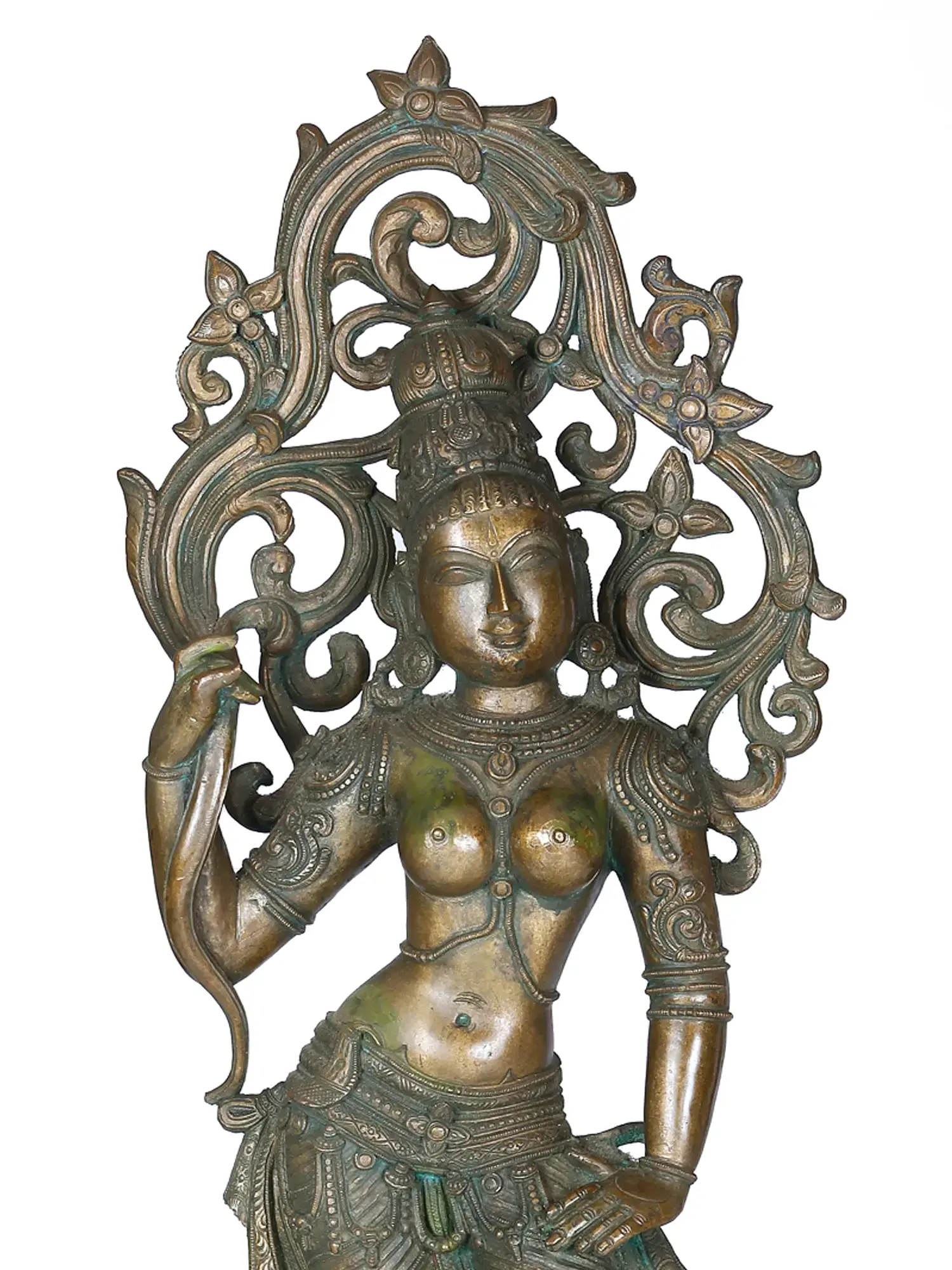 Drawing on this tradition, the bronze statue of a lady with a creeper is an exquisite example of links between femininity and nature. The lady stands in an elegant posture on a lotus pedestal, with one hand placed on her waist and the other wrapped around the blossoming creeper.