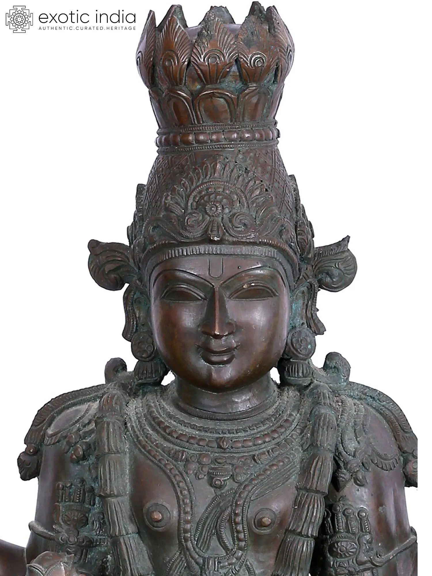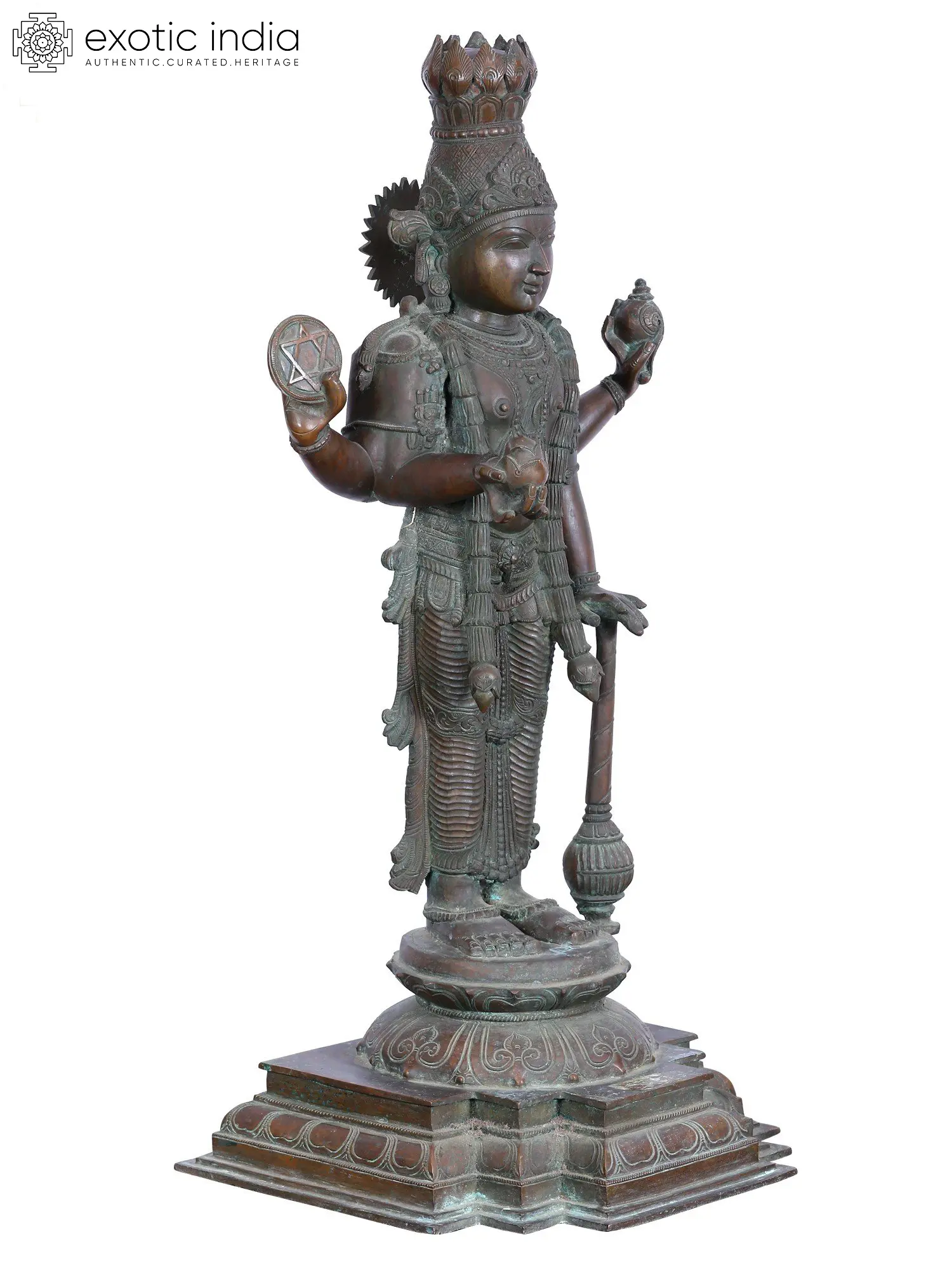 Celebrate divine presence with our Lord Guruvayurappan (Vishnu) sculpture, a harmonious creation through Madhuchista Vidhanam in Swamimalai's Panchaloha Bronze. This artwork beautifully portrays Vishnu in his Guruvayur form. The infant form of Lord Krishna, known as Guruvayurappan, is mostly revered in Kerala. He is the principal deity of the Keralan temple of Guruvayur. The god manifests as Lord Krishna in his baby form. In this statue with four arms, the god is standing and holding a conch, a chakra, a mace, and a lotus. This statue is beyond comprehension and carries one of the finest examples of bronze craftsmanship from the Southern corners of India.