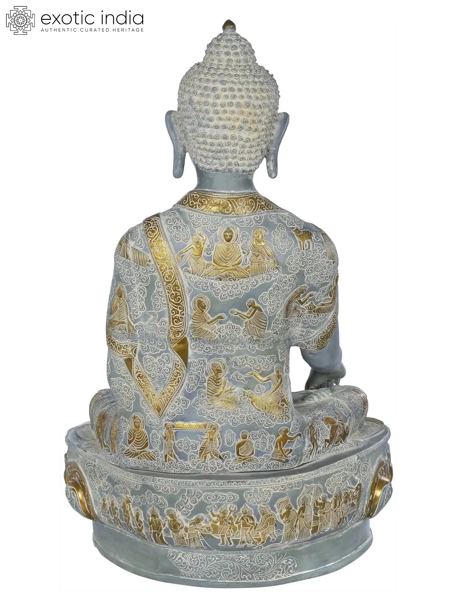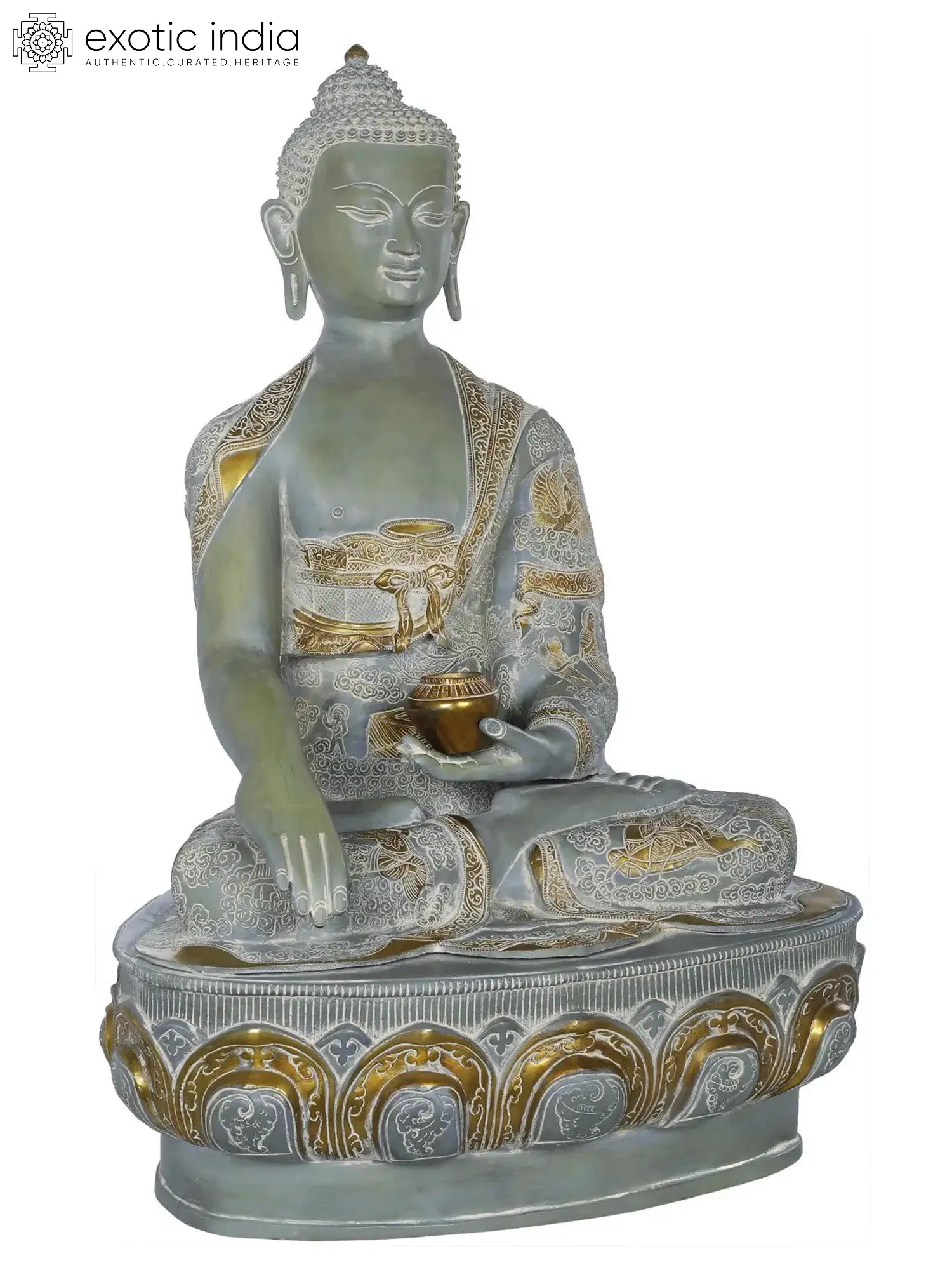 Crafted from high-quality brass, this statue showcases exceptional artistry. The robes of the Buddha are adorned with delicate, incised patterns, hinting at the rich textures and folds, while the lotus base features a deeply carved, classical design. The contrast between the polished brass of the Buddha's form and the darker, patina-rich finish of the robes and base adds depth and visual interest. The serene expression, the elongated earlobes signifying wisdom and detachment, and the urna on the forehead, a traditional mark of spiritual insight, are all rendered with meticulous care. ––––––––––