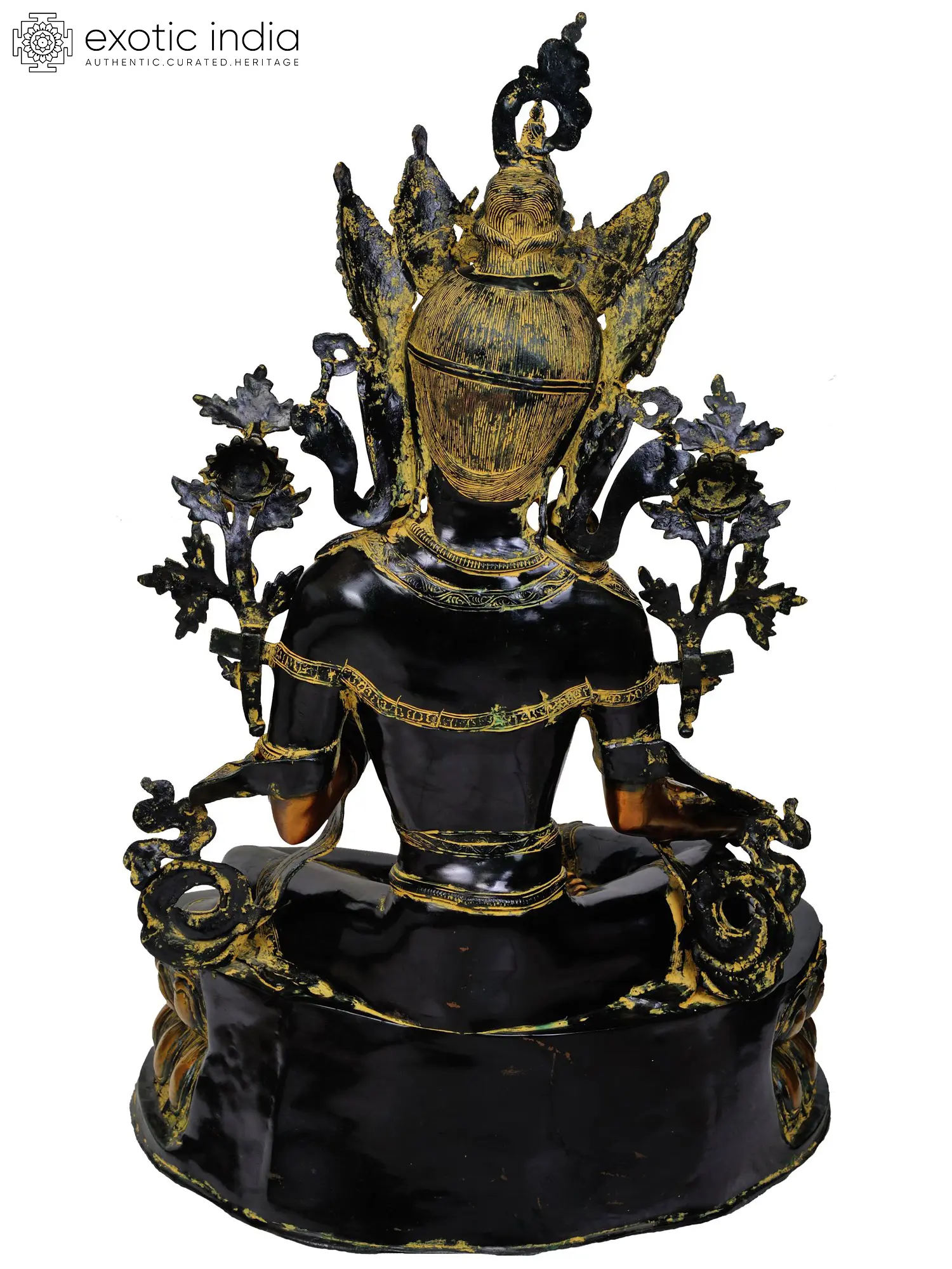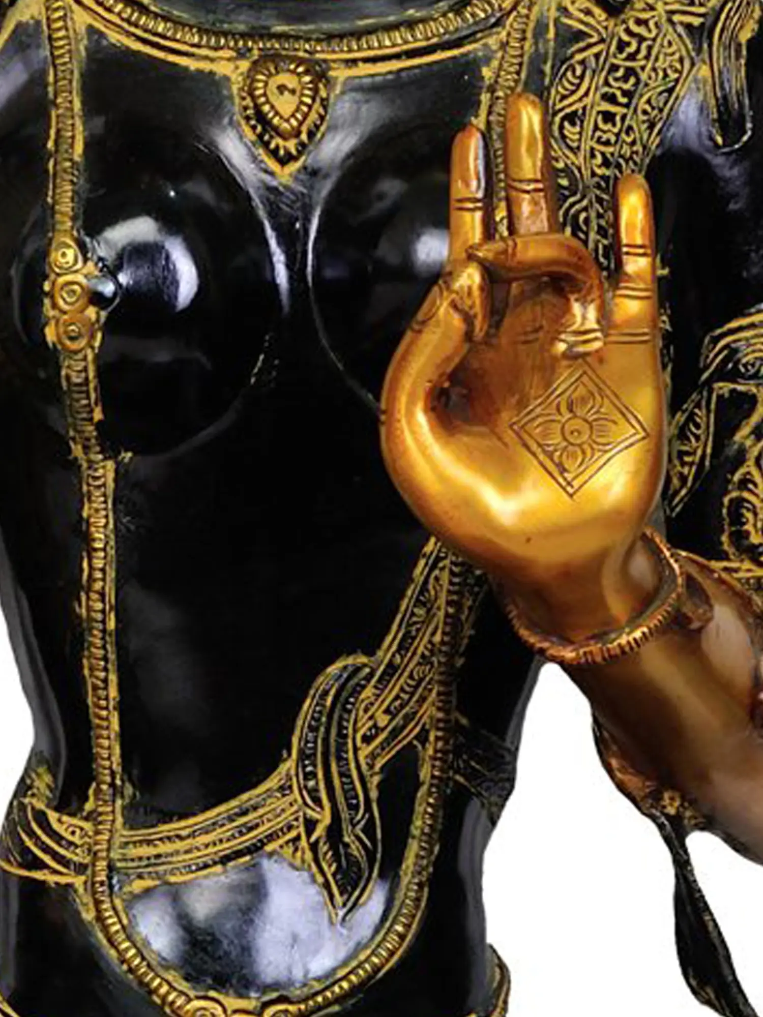This magnificent brass statue of Green Tara, a revered female Bodhisattva in Tibetan Buddhism, is a testament to the artistry and devotion of Indian craftsmanship. Standing impressively tall, this handmade masterpiece embodies the essence of compassion, wisdom, and swift action that Green Tara represents. Her serene countenance, with eyes closed in meditation and a gentle smile gracing her lips, conveys an aura of profound peace and unwavering benevolence. The rich, dark patina of her robes, contrasted with the gleaming golden highlights of her ornaments and skin, creates a visually striking depiction that is both commanding and deeply spiritual.