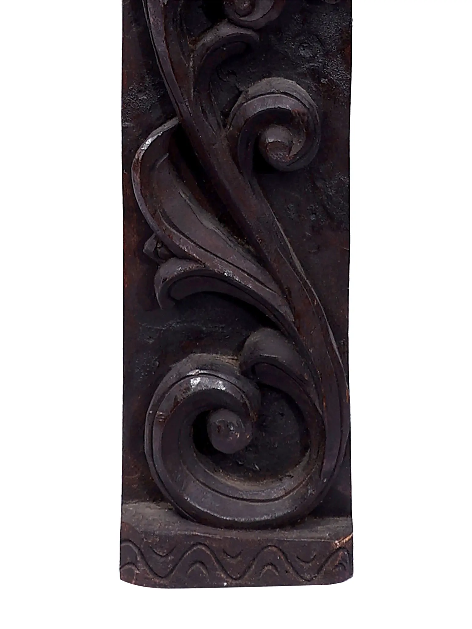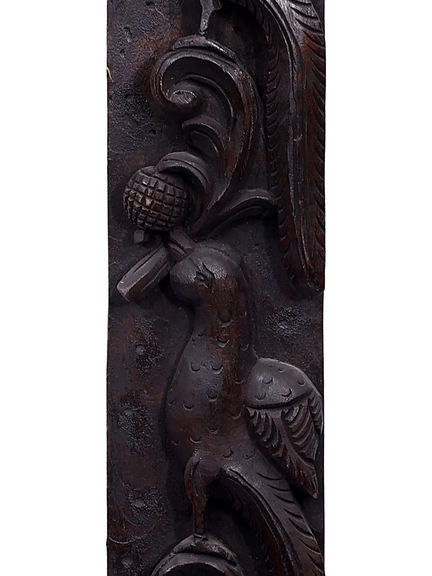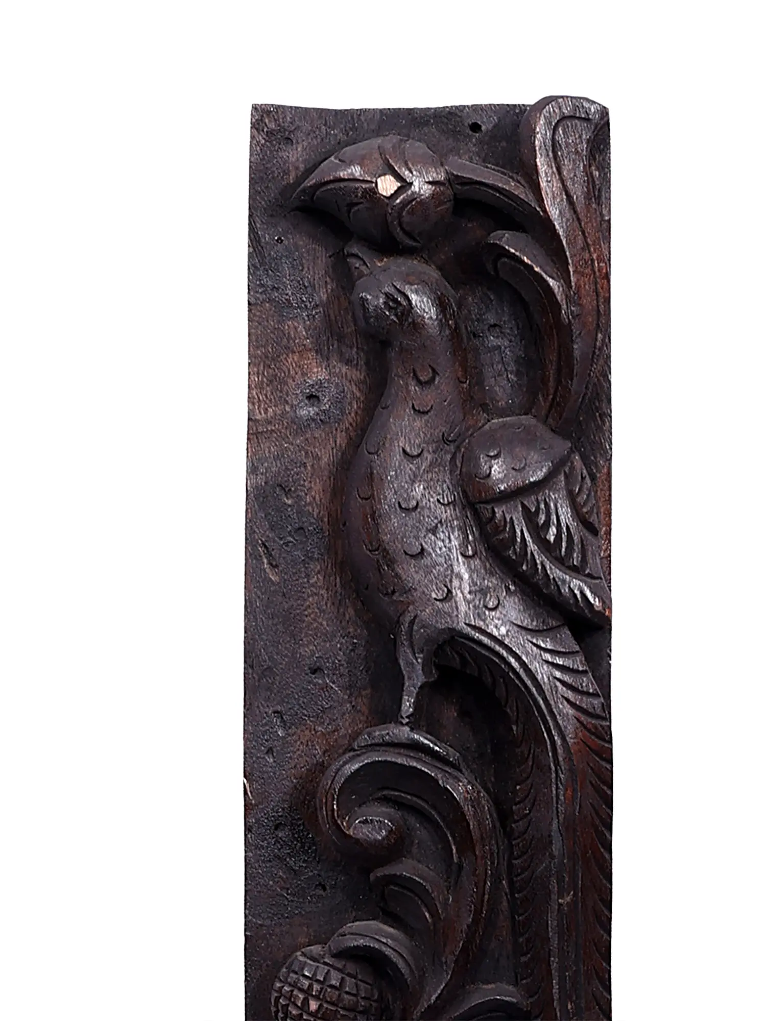 Parrots, with their striking plumage and vocal mimicry, have held a special place in human culture and mythology for centuries. In many traditions, they are seen as messengers, connecting the earthly realm with the divine. In Hinduism, the parrot is associated with Kamadeva, the god of love, often depicted with a parrot flag. They are also symbols of eloquence and wisdom, their ability to learn and repeat speech being a metaphor for the transmission of knowledge and the power of the word. The vibrant colors often associated with parrots, though not present in this monochrome wood carving, hint at their representation of life, joy, and auspiciousness. This panel, through its depiction of these intelligent creatures, carries an echo of that rich symbolism. ––––––––––