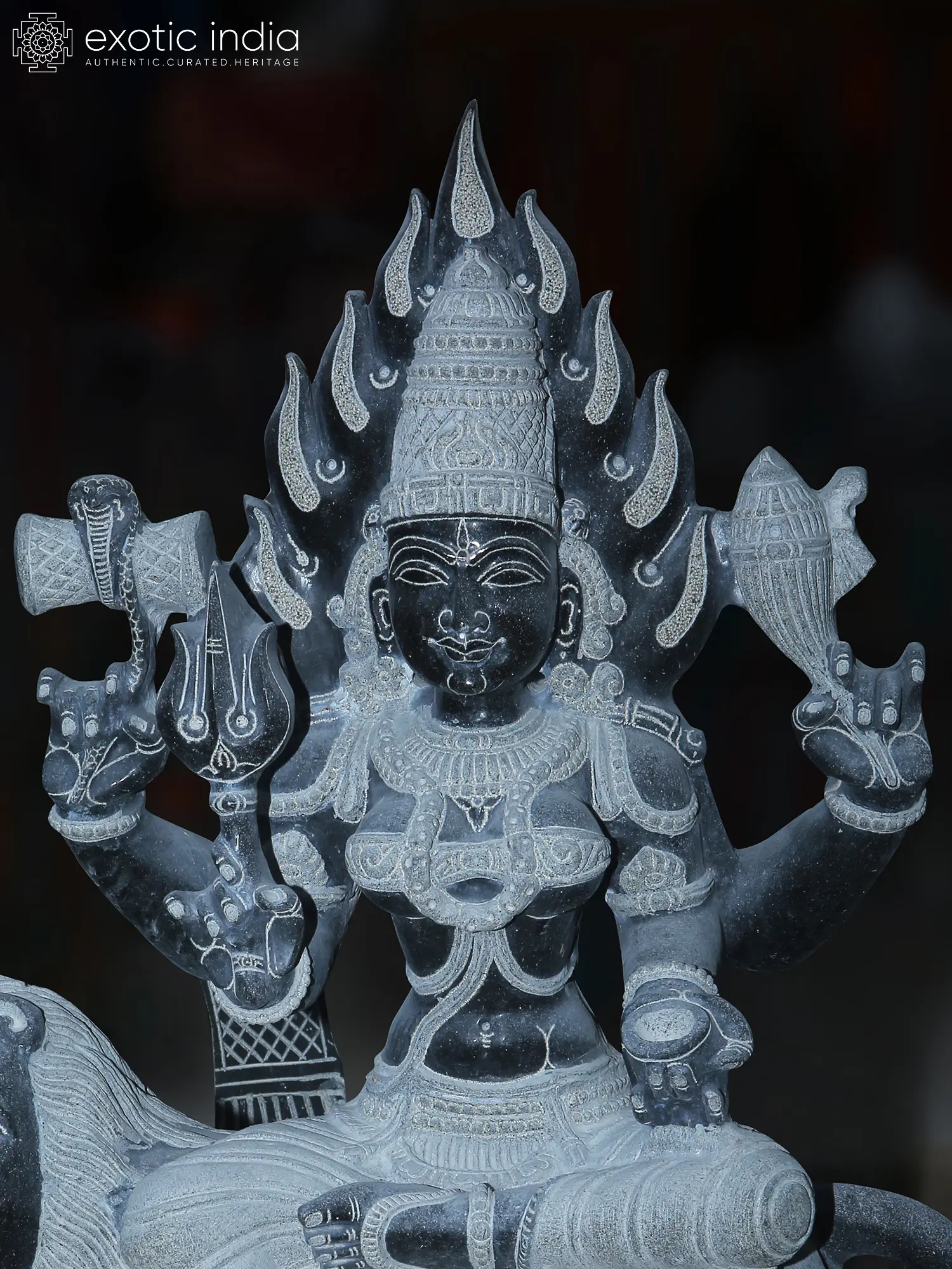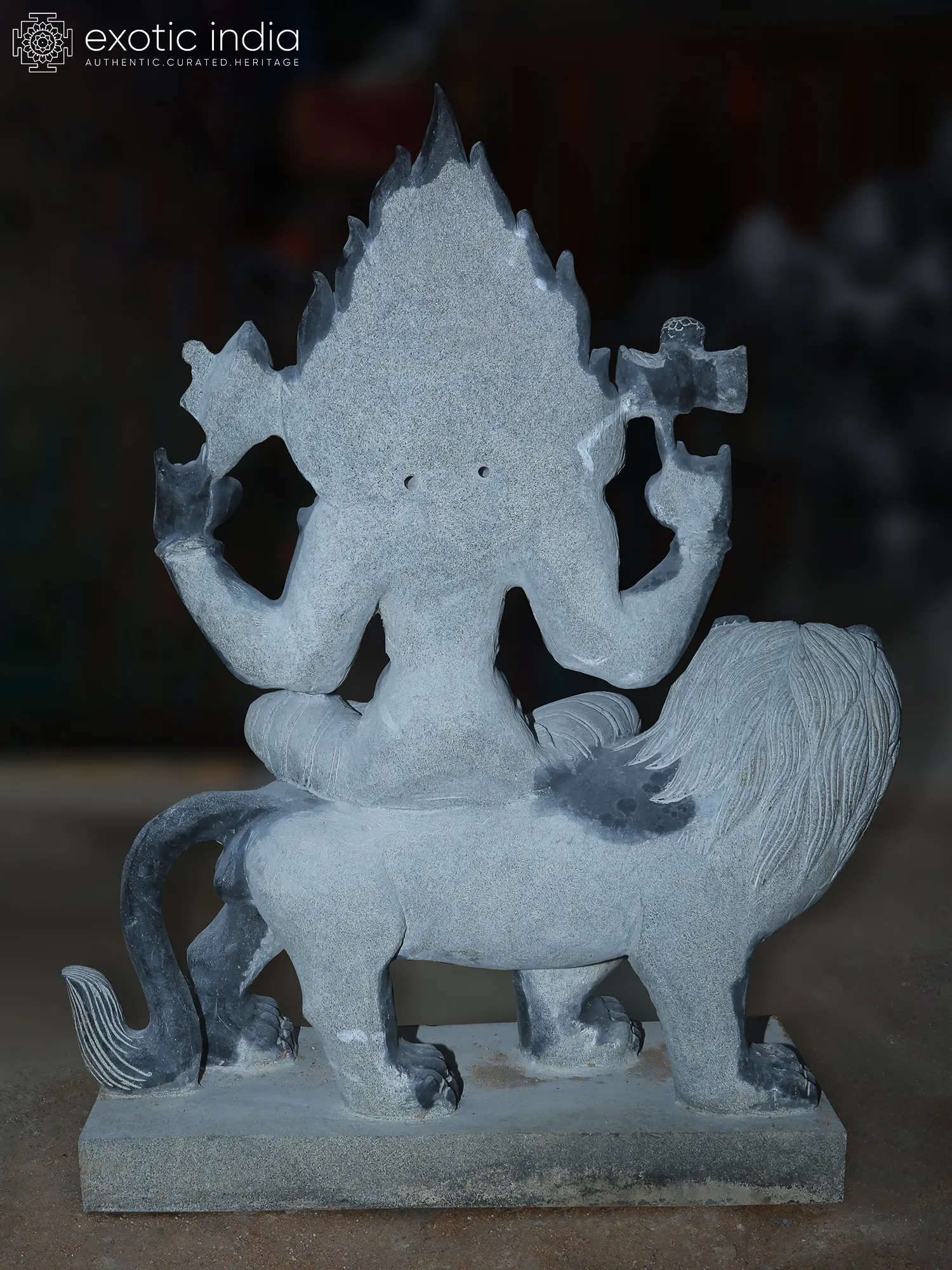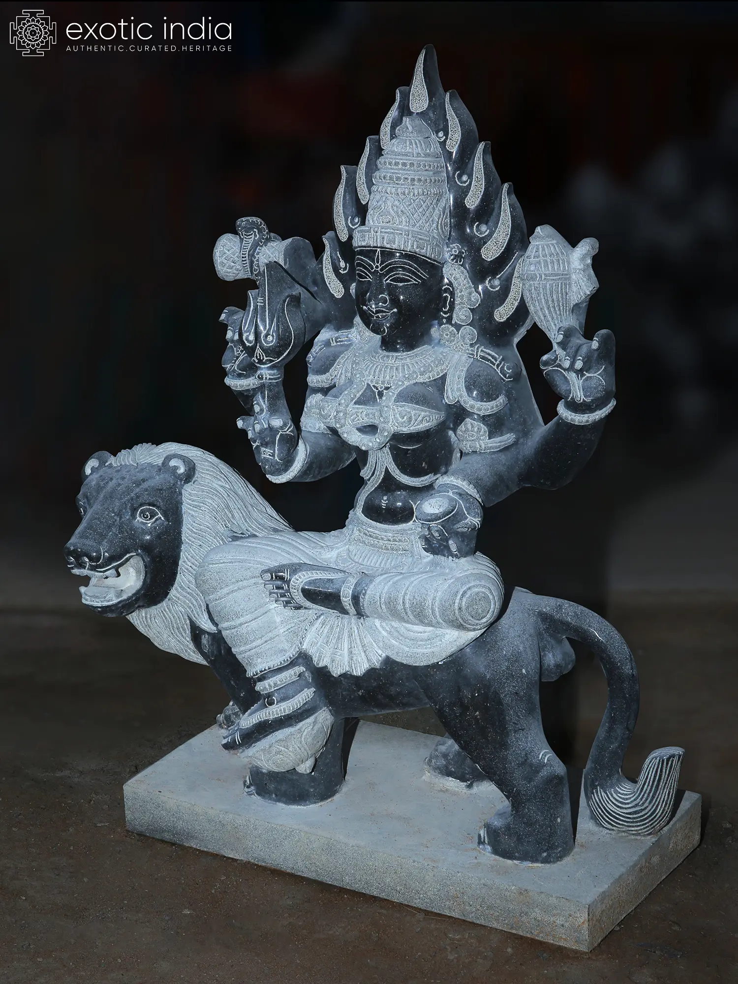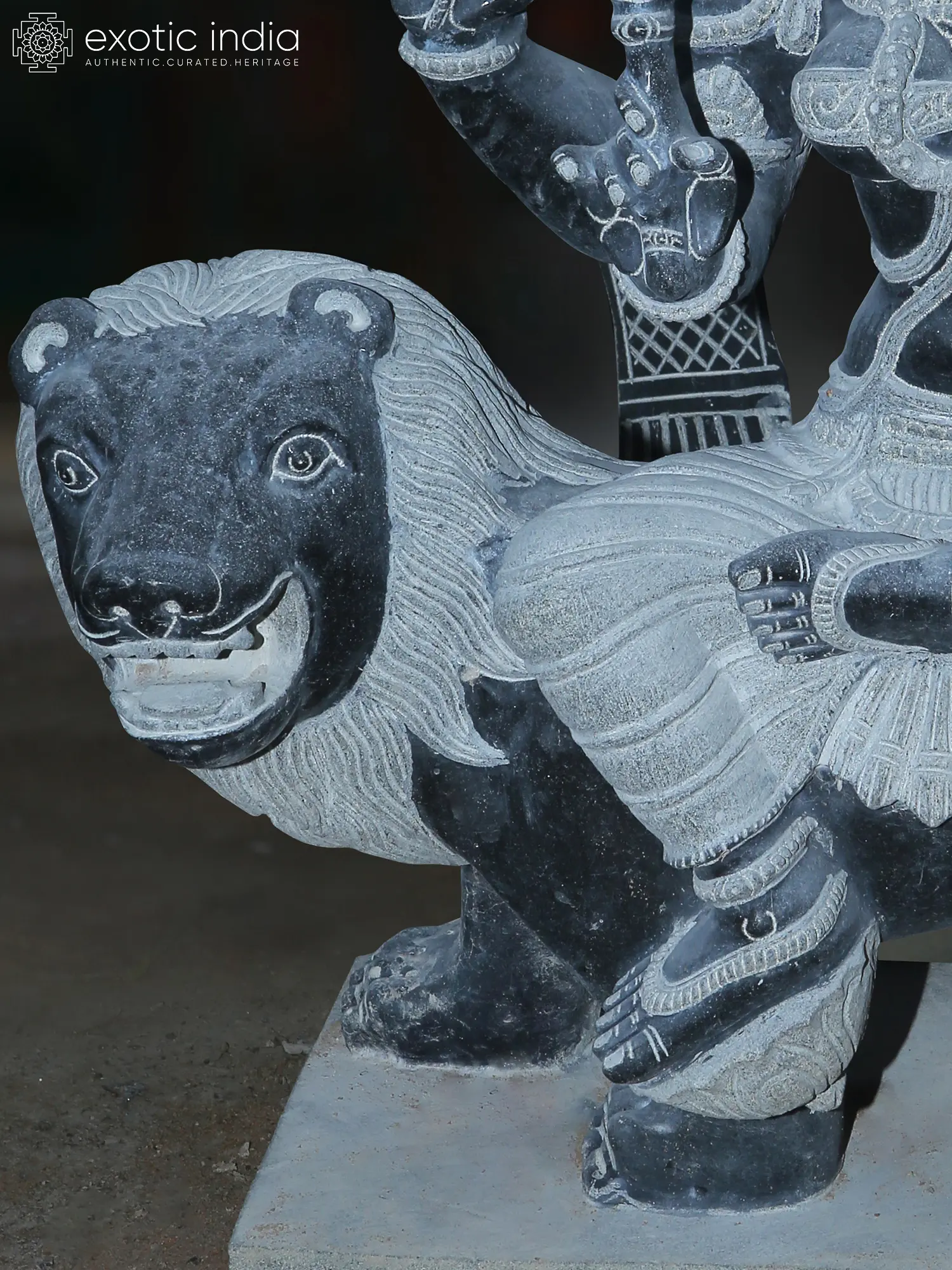 This granite stone statue depicts Goddess Durga in her Mahishasura Mardini form, seated magnificently on top of a lion. This version of her represents power, protection, and triumph over evil.